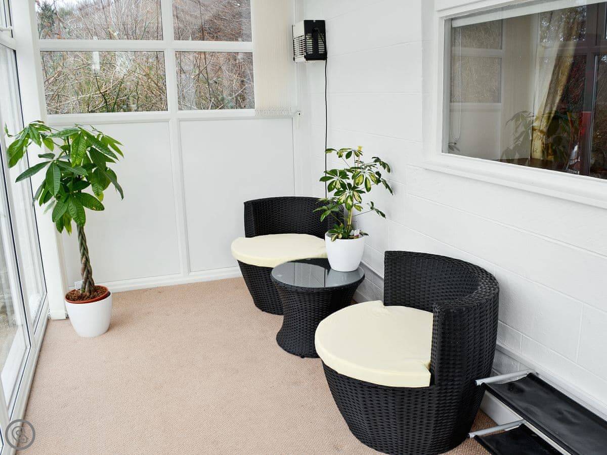 Cheviot Cottage is a small place for two people on the Bluebell Farm caravan park in Belford. You get your own building, it's detached from the others. There's a small patio area at the front.