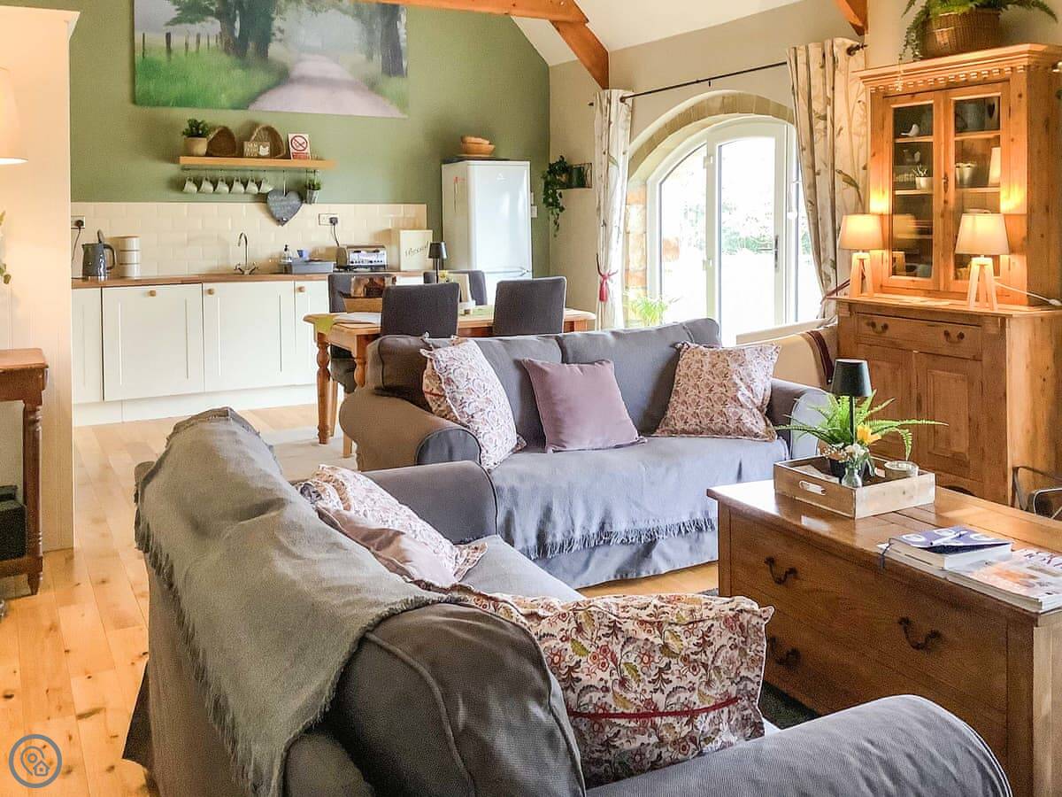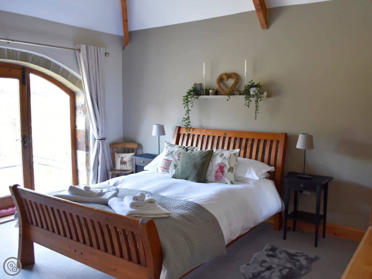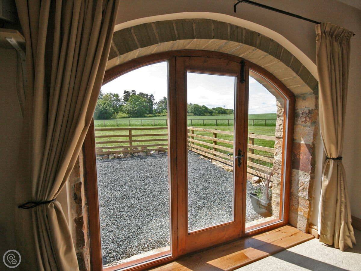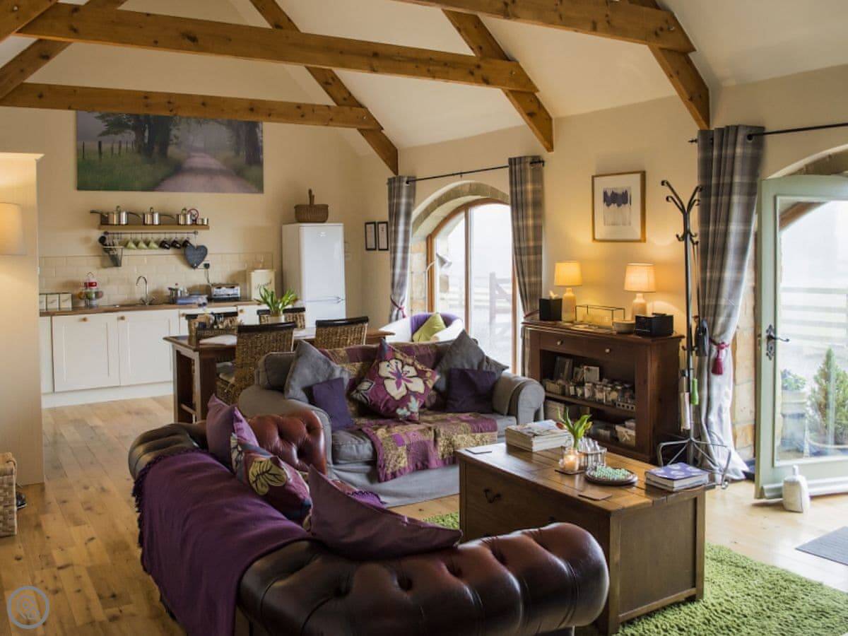 It's got two bedrooms and two bathrooms, which is handy. It sleeps four. It's been done up to a high standard. It's a 4 Star place, so it's comfortable and well-finished. There's underfloor heating and a wood burner. The main room is big with high beams and two large arched windows. The view from them is over open fields. We keep some hens, ducks, and goats in the next field, so you can see them from the windows.