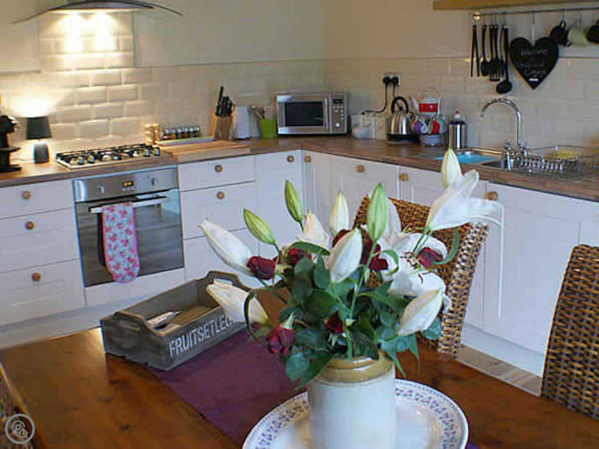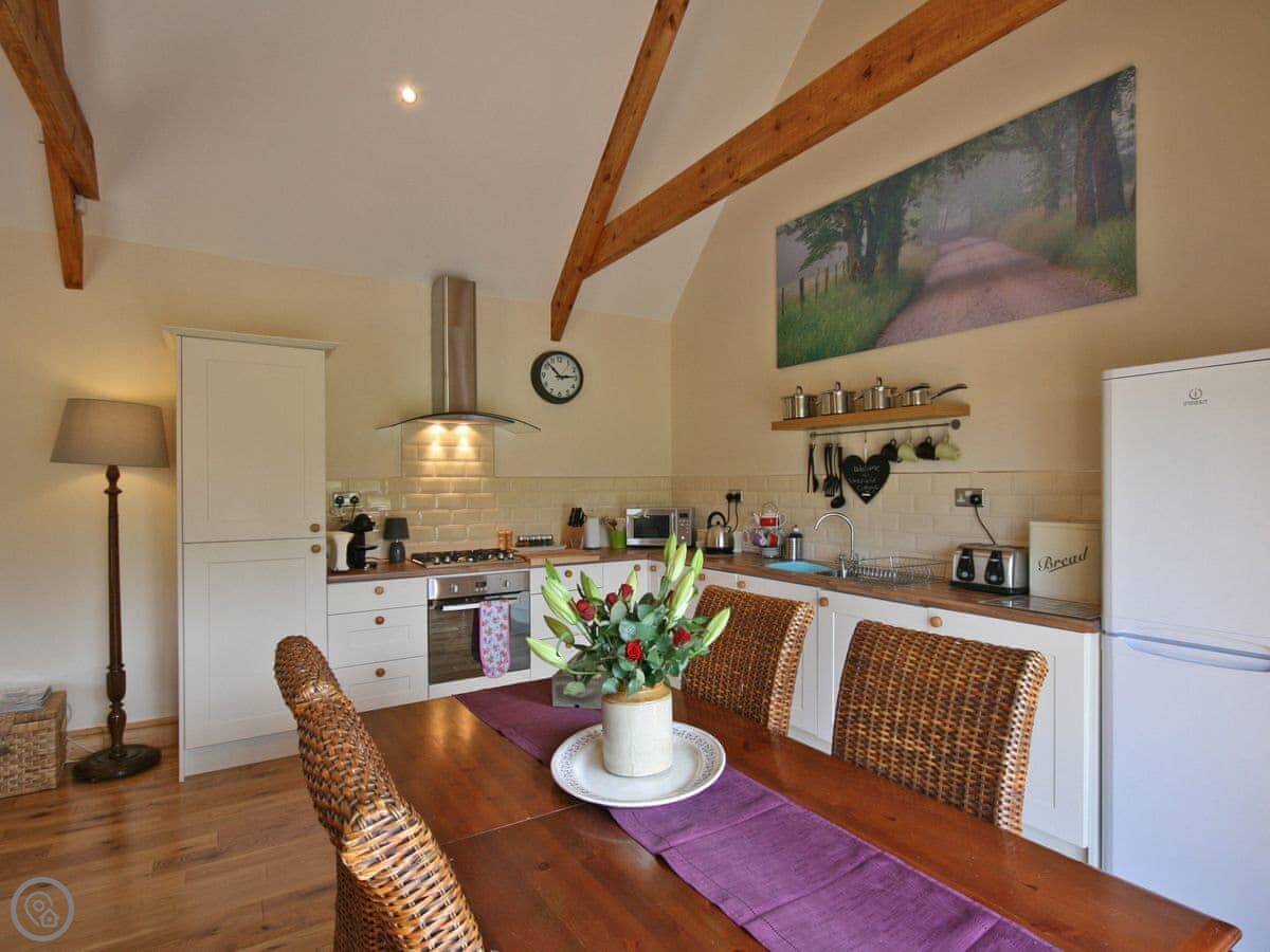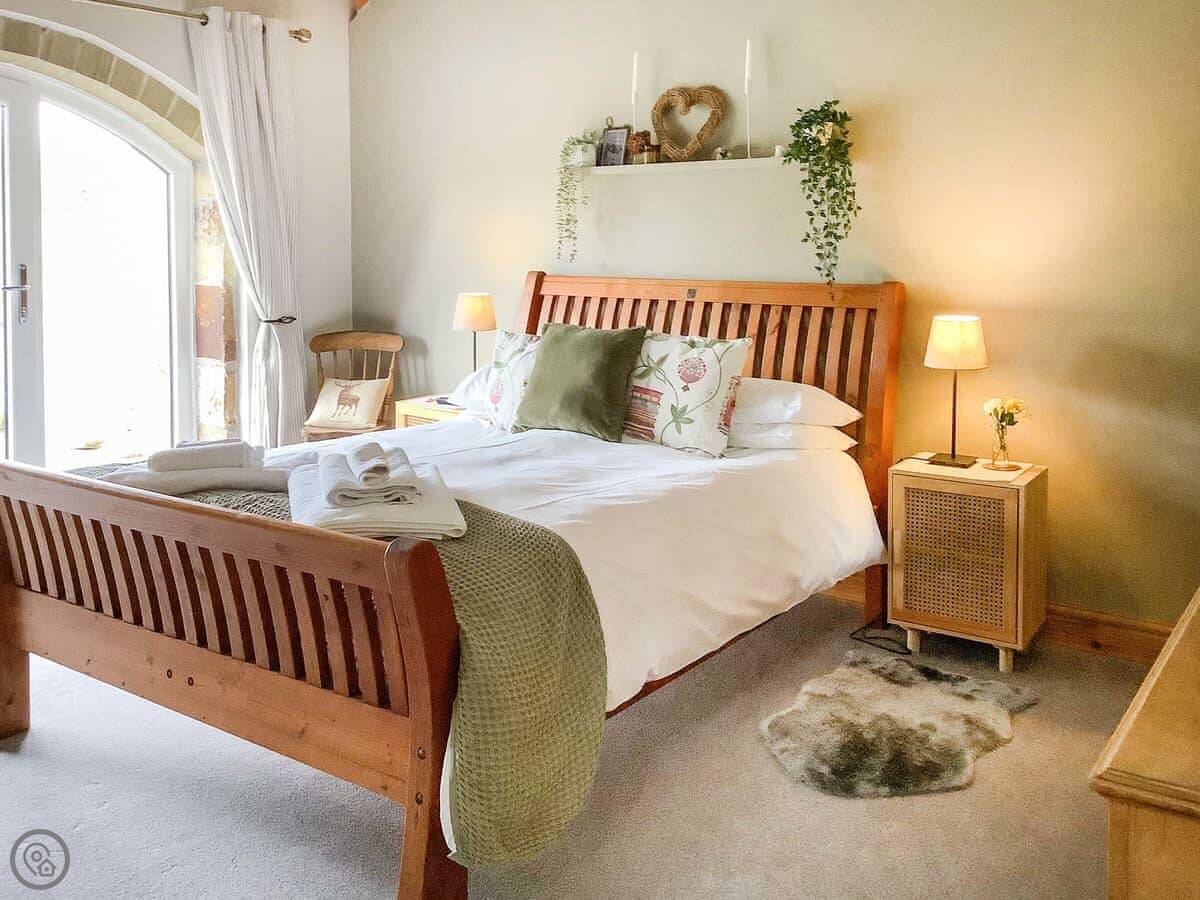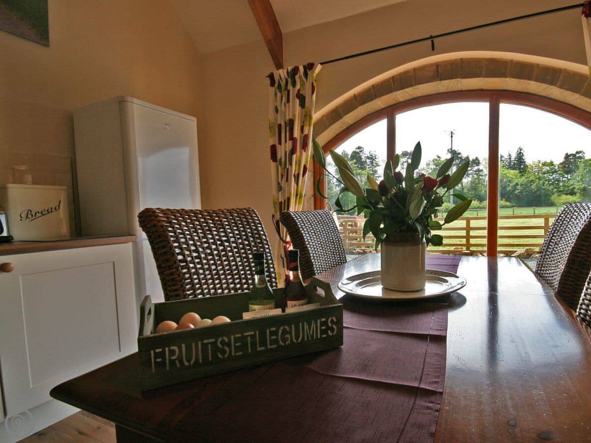 It's got two bedrooms and two bathrooms, which is handy. It sleeps four. It's been done up to a high standard. It's a 4 Star place, so it's comfortable and well-finished. There's underfloor heating and a wood burner. The main room is big with high beams and two large arched windows. The view from them is over open fields. We keep some hens, ducks, and goats in the next field, so you can see them from the windows.