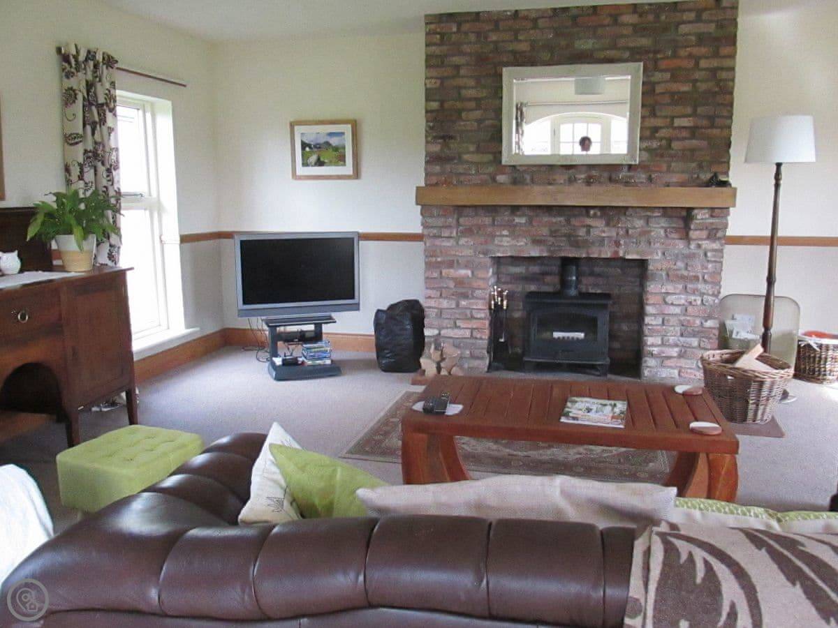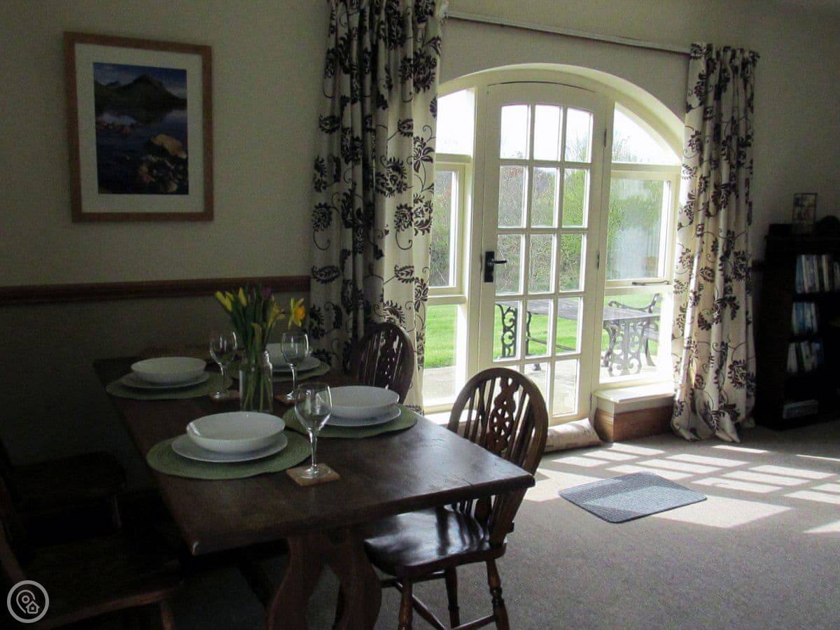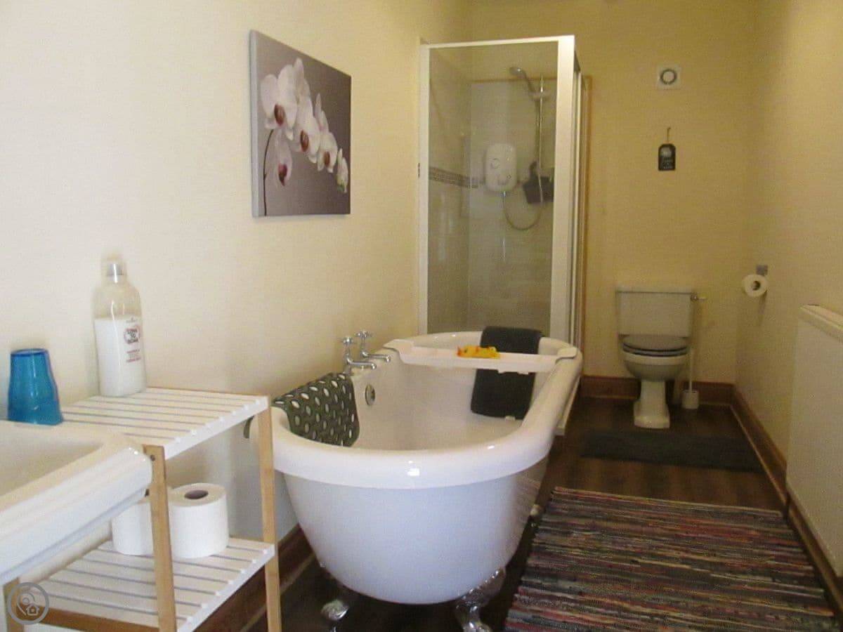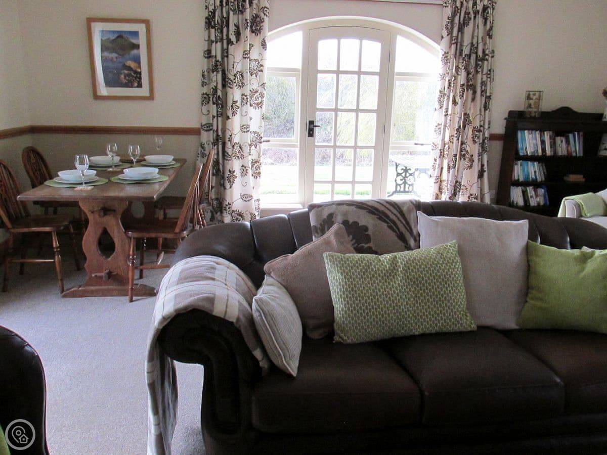 It sleeps six. There are two bedrooms and two bathrooms. One bathroom is quite big. It has a roll-top bath and a separate shower. The other bathroom is smaller, but it's been redone recently. The living room has a dining table and a woodburning stove. The windows look out over the garden.