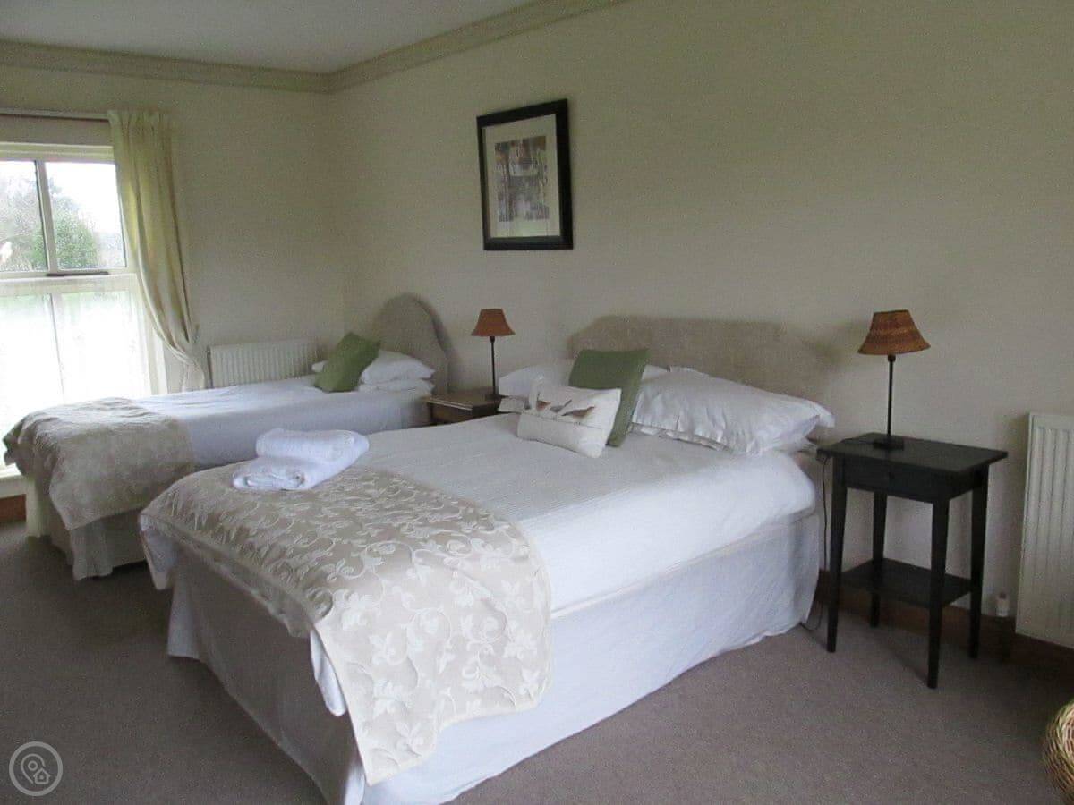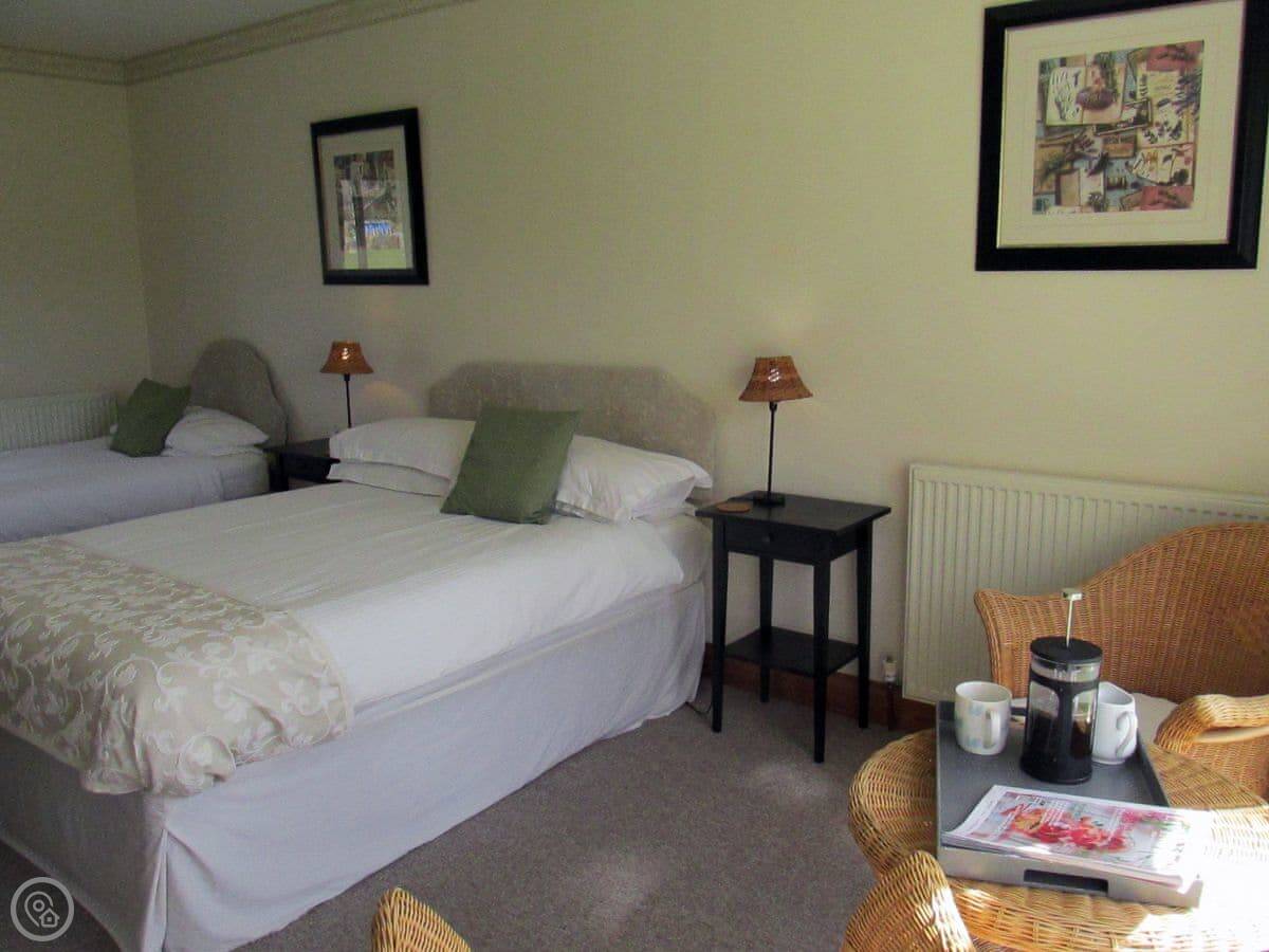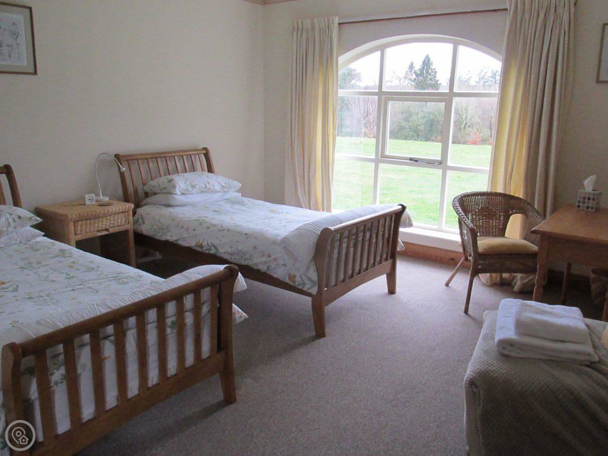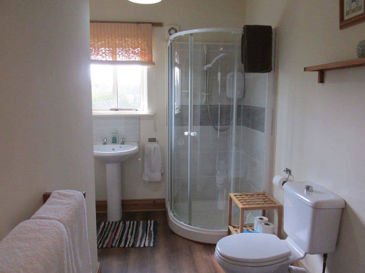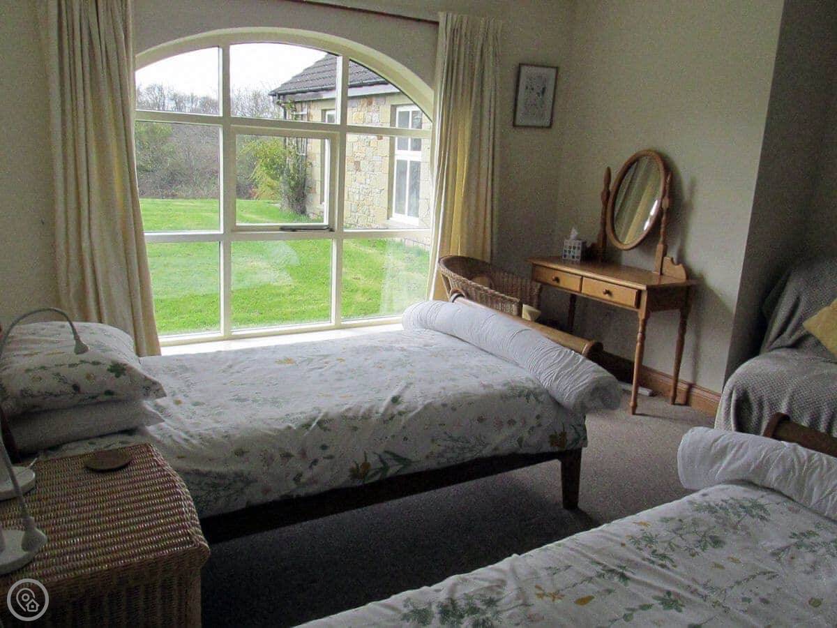 It sleeps six. There are two bedrooms and two bathrooms. One bathroom is quite big. It has a roll-top bath and a separate shower. The other bathroom is smaller, but it's been redone recently. The living room has a dining table and a woodburning stove. The windows look out over the garden.