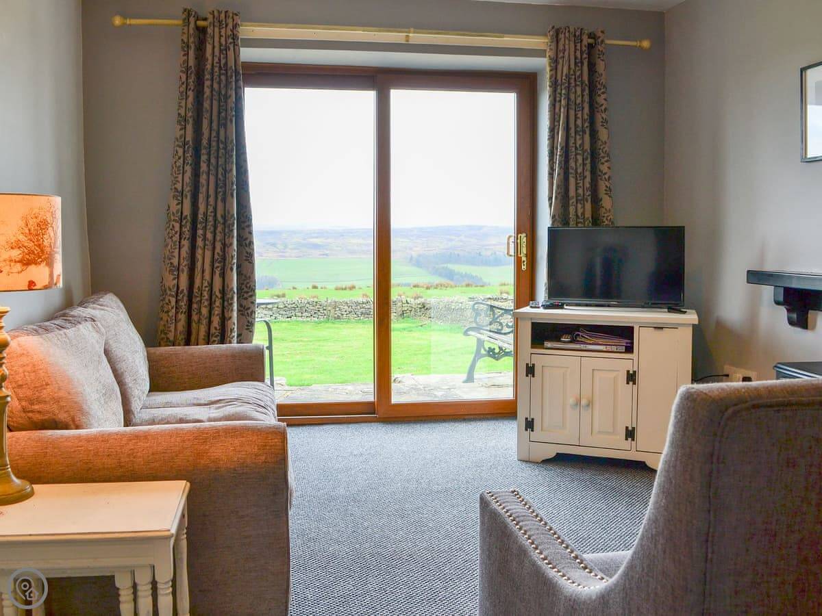 It sleeps four. Two bedrooms and one bathroom. It’s got a 3 Star rating, so it’s comfortable and clean, not luxury. The patio doors from the lounge lead out to your own patio area. It’s a good spot to sit out.