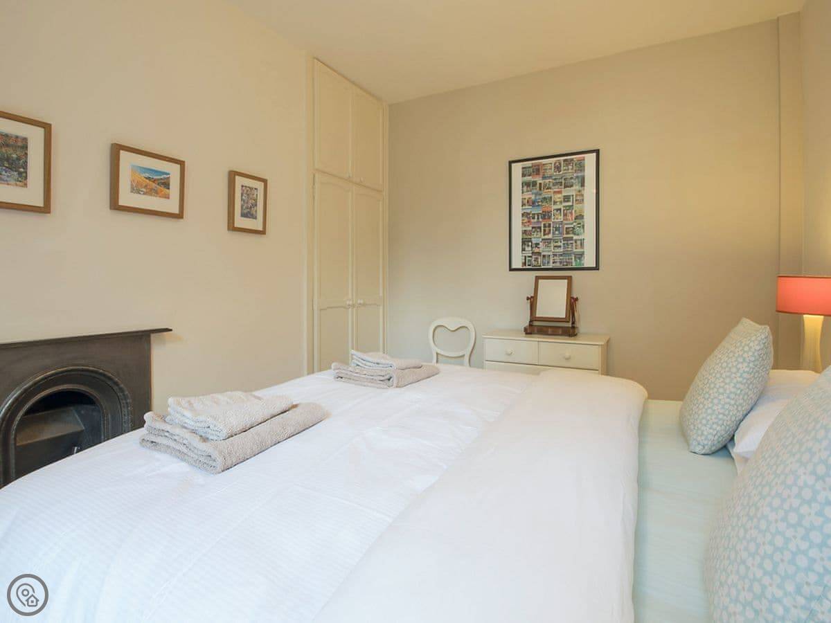 You enter on the middle floor from the street. The kitchen is downstairs, and it opens onto a private, enclosed garden. It's a good spot for a BBQ when the weather's right. Upstairs from the entrance, there are two bedrooms on separate floors. The top bedroom has its own shower room and a little sitting area. The other bathroom is on the middle floor, just across from the second bedroom.