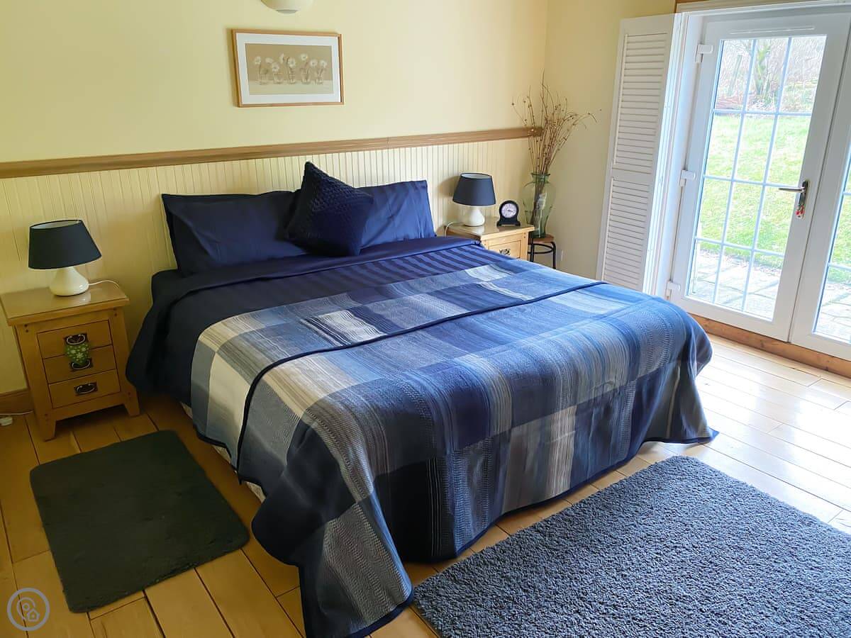 It's a four-star place, sleeps three. One big bedroom, it can be set up as a twin or a super king. Patio doors from the bedroom go straight out to the garden. One bathroom. There's underfloor heating.