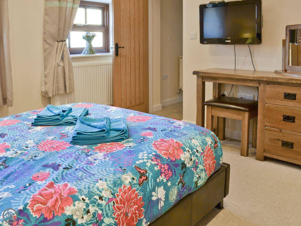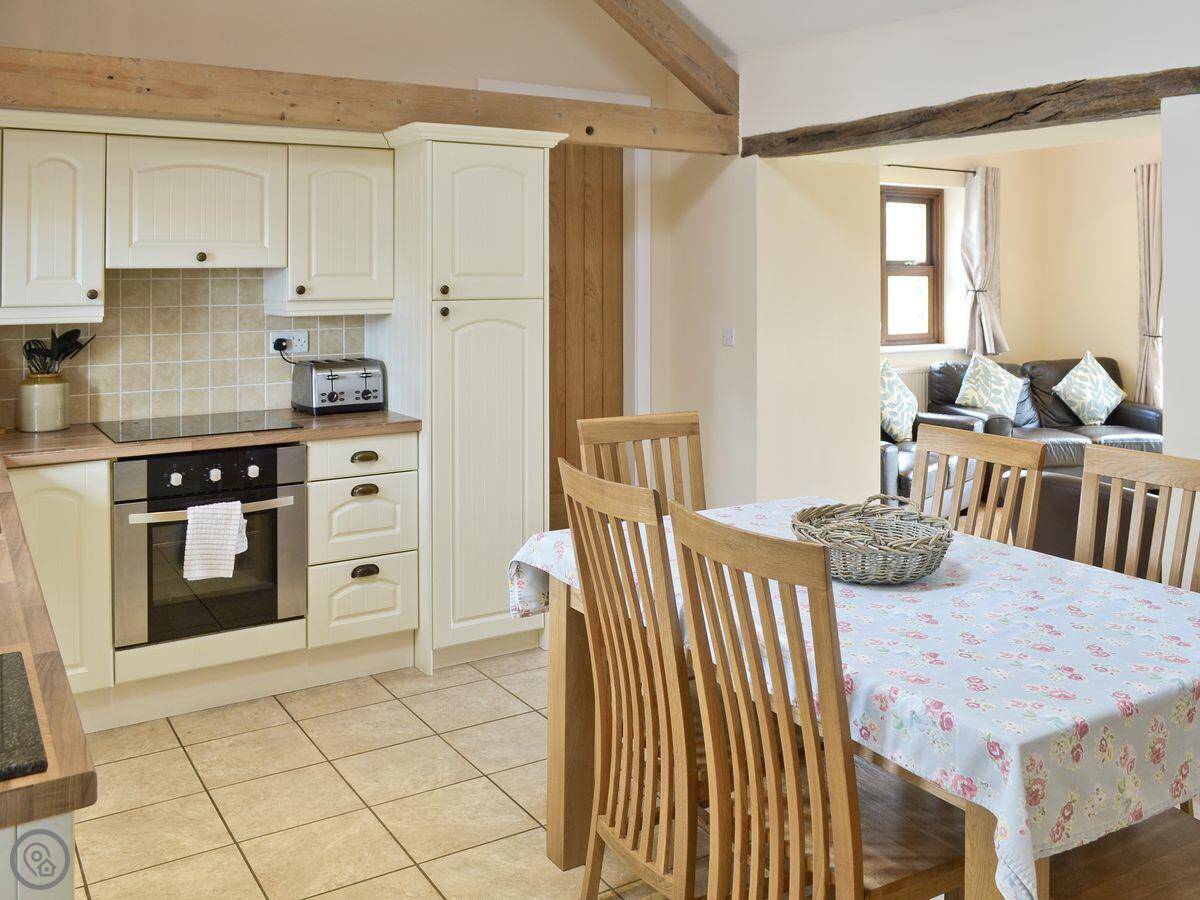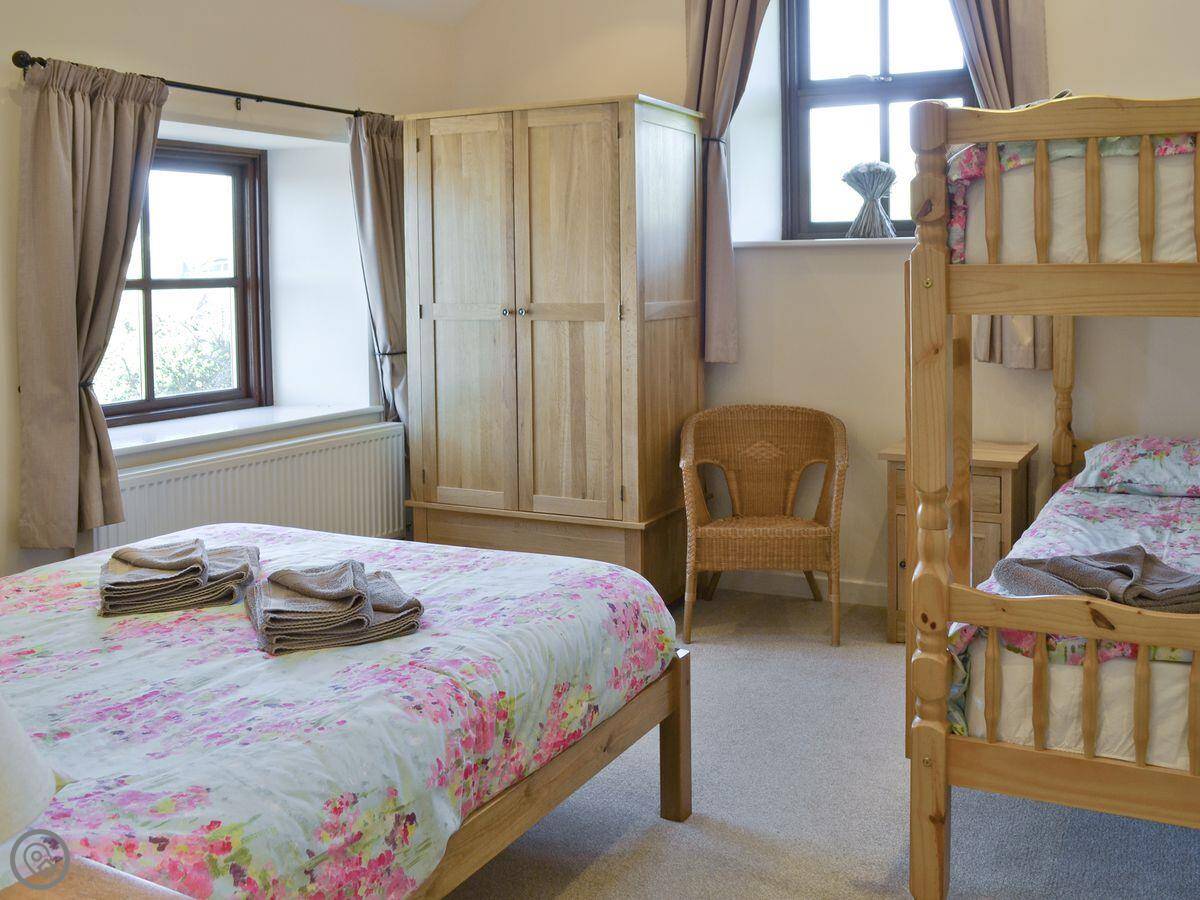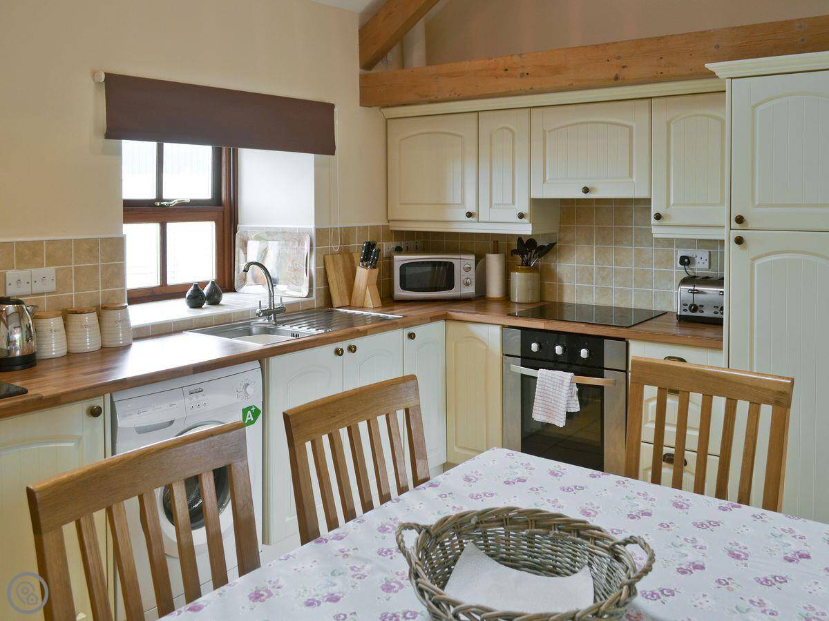 The accommodation comprises a kitchen/dining room which feels light and airy due to the high beamed ceiling, contemporary yet subtle lighting and a neutral colour scheme. The open plan layout leads through to the living room where furnishings are stylish and comfortable. A wood burner is just waiting for kindling to be lit on a cold winter evening. The first bedroom is accessed from the right of the kitchen and has two windows, a double bed, a television and en-suite facilities. The second bedroom is accessed from the left of the kitchen via a small step and has a double bed and bunk beds. There is a very pretty little feature window here high up in the wall. The main bathroom is light and attractive with a shower over bath, toilet and basin. Heated towel rails are provided in both bathrooms. The owner has built in unobtrusive speakers throughout the property so that music may be listened to wherever you are. A complimentary welcome pack comprising milk, eggs, tea and bread will be provided.