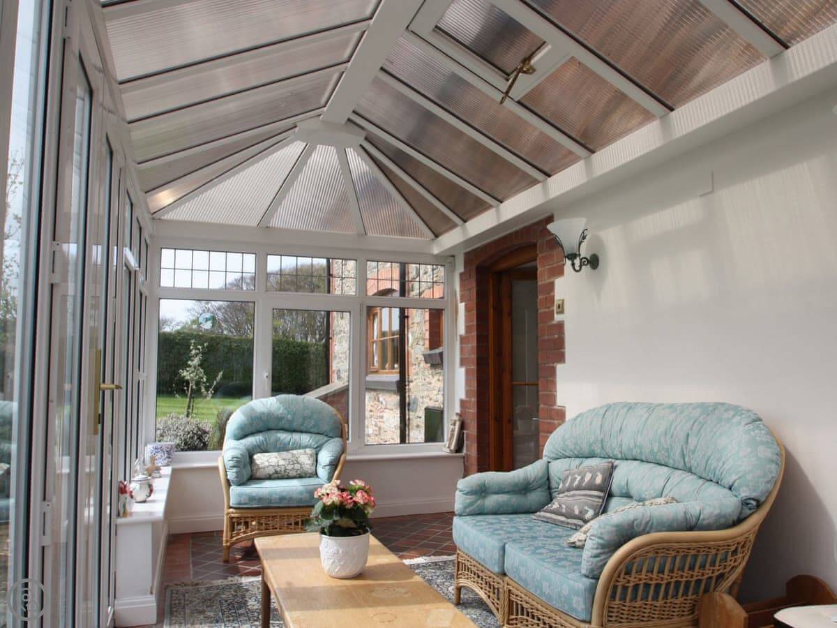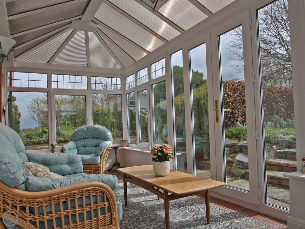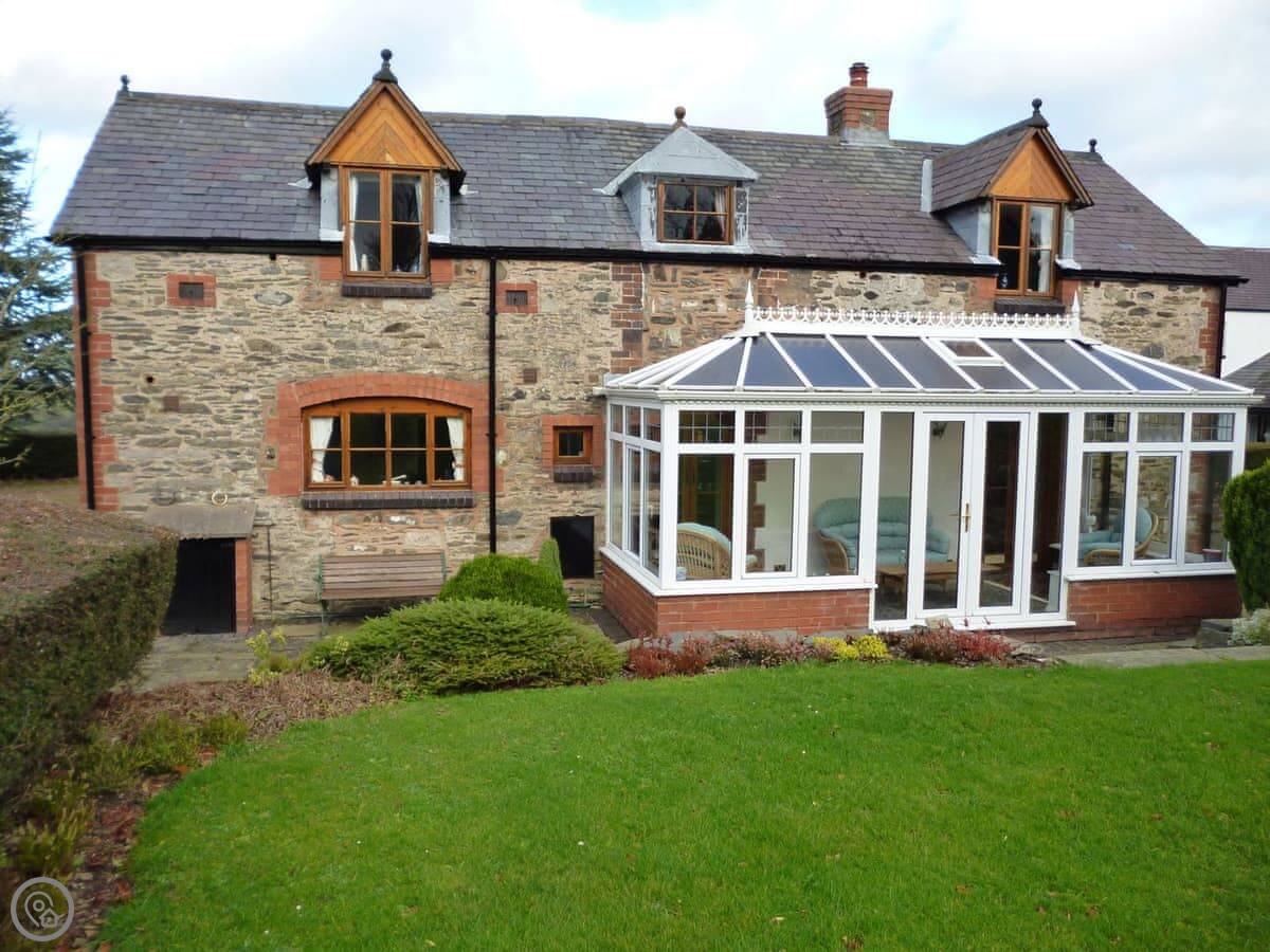 Henfaes Bach is the larger of two cottages situated in a very pretty courtyard next to the owner’s property. Guests have the use of the vast back garden from which the famous Offa’s Dyke path may be accessed via the garden gate. Or if preferable you can drive only a mile or so to reach the car park by Offa’s Dyke which is a haven for walkers and cyclists. If you do take your bikes they may be stored by arrangement at the property. There is also the opportunity of partaking in a spot of Fly Fishing close by. Your holiday retreat is just that. Set amidst rolling countryside just off a narrow lane your holiday can be as peaceful or as energetic as you please. The conservatory is flooded with light and decorated in a clam colour scheme. Ideal if you want some quiet time to relax while other members of your party perhaps prefer to watch the television in the pretty sitting room.