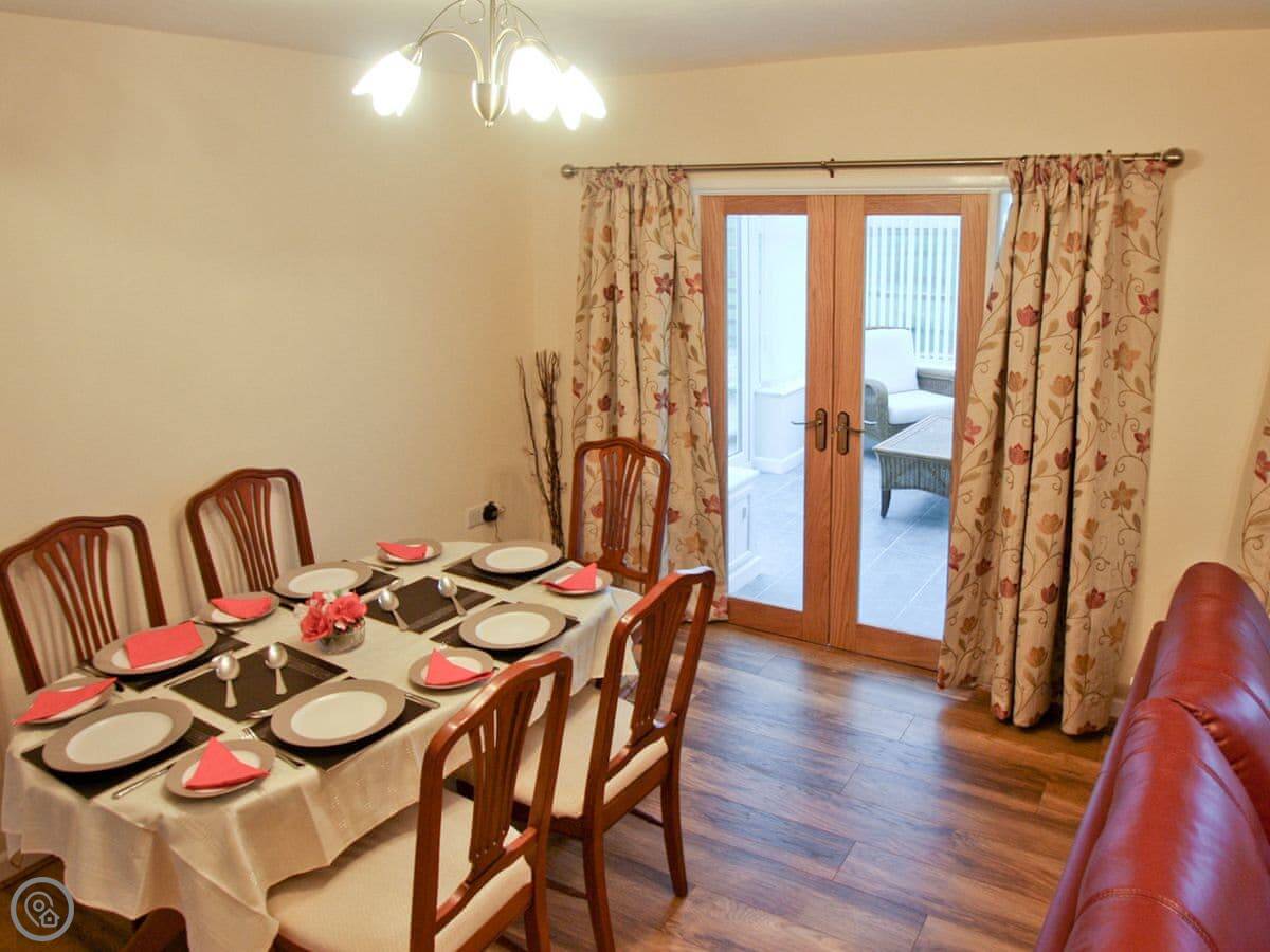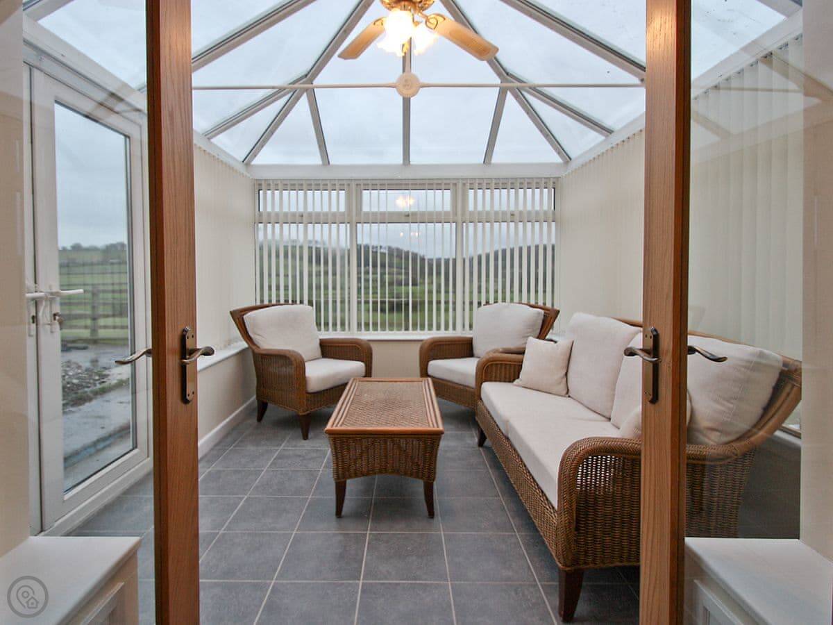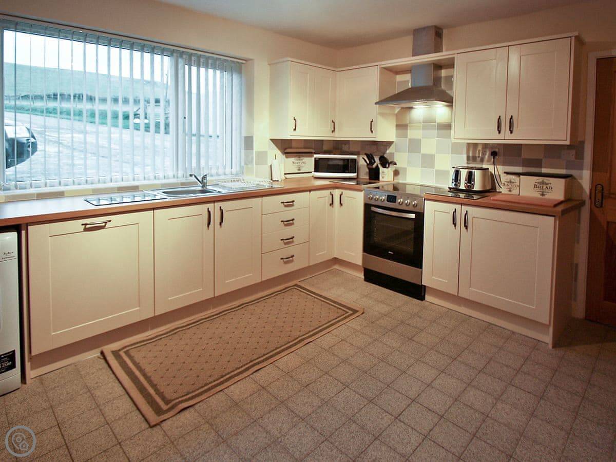 The kitchen has what you need. There's a conservatory off it with French doors, which gets the sun. Outside is a decked area with a table, chairs and a BBQ. You can park three cars off the road. You can store bikes in our barn if you bring them.