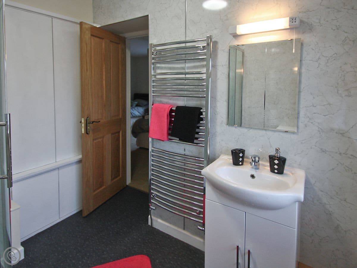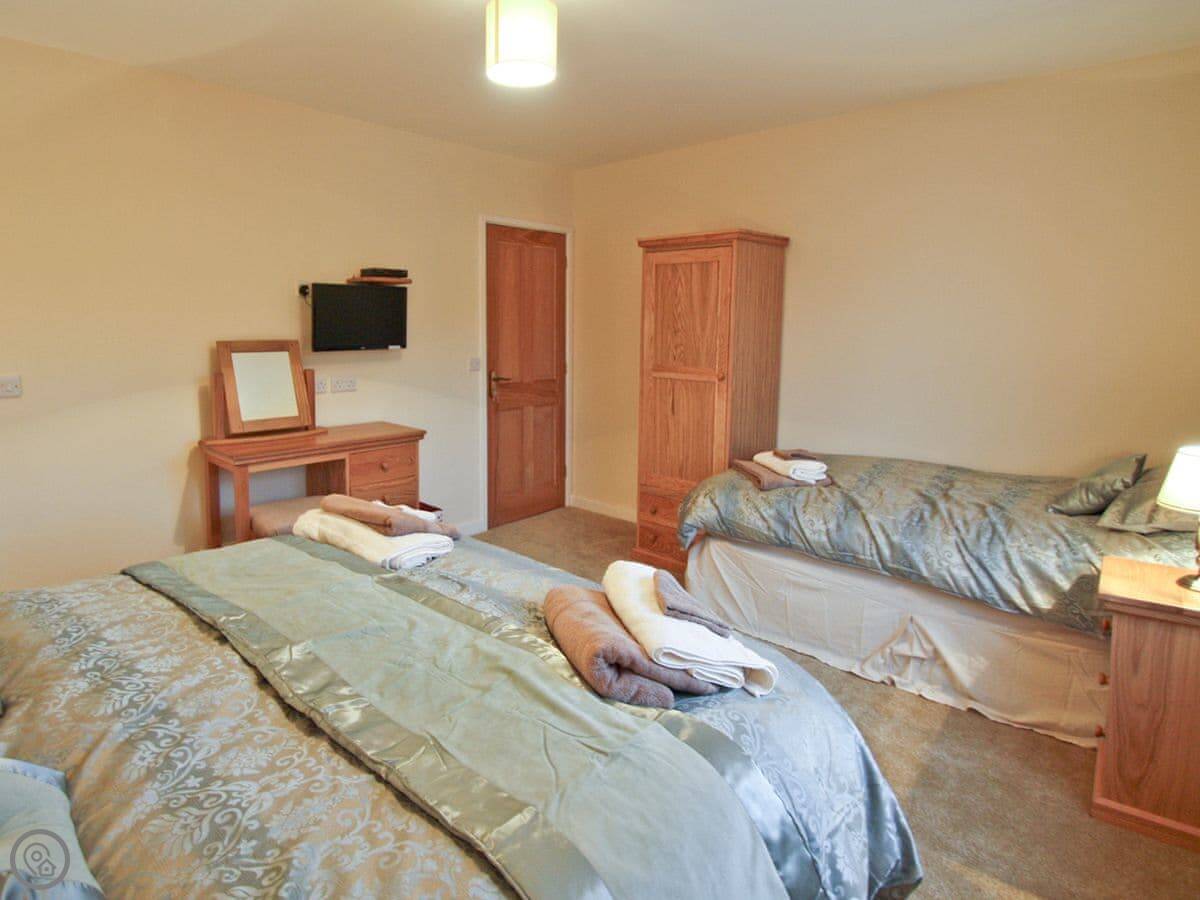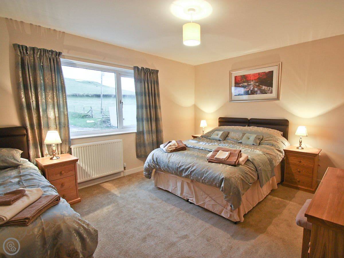 The cottage sleeps six. Two bedrooms, both with their own bathrooms. One has a kingsize bed, the other has a zip and link super king and a single bed. The sofas in the living room are big enough to stretch out on. There's an electric stove that looks like a wood burner.