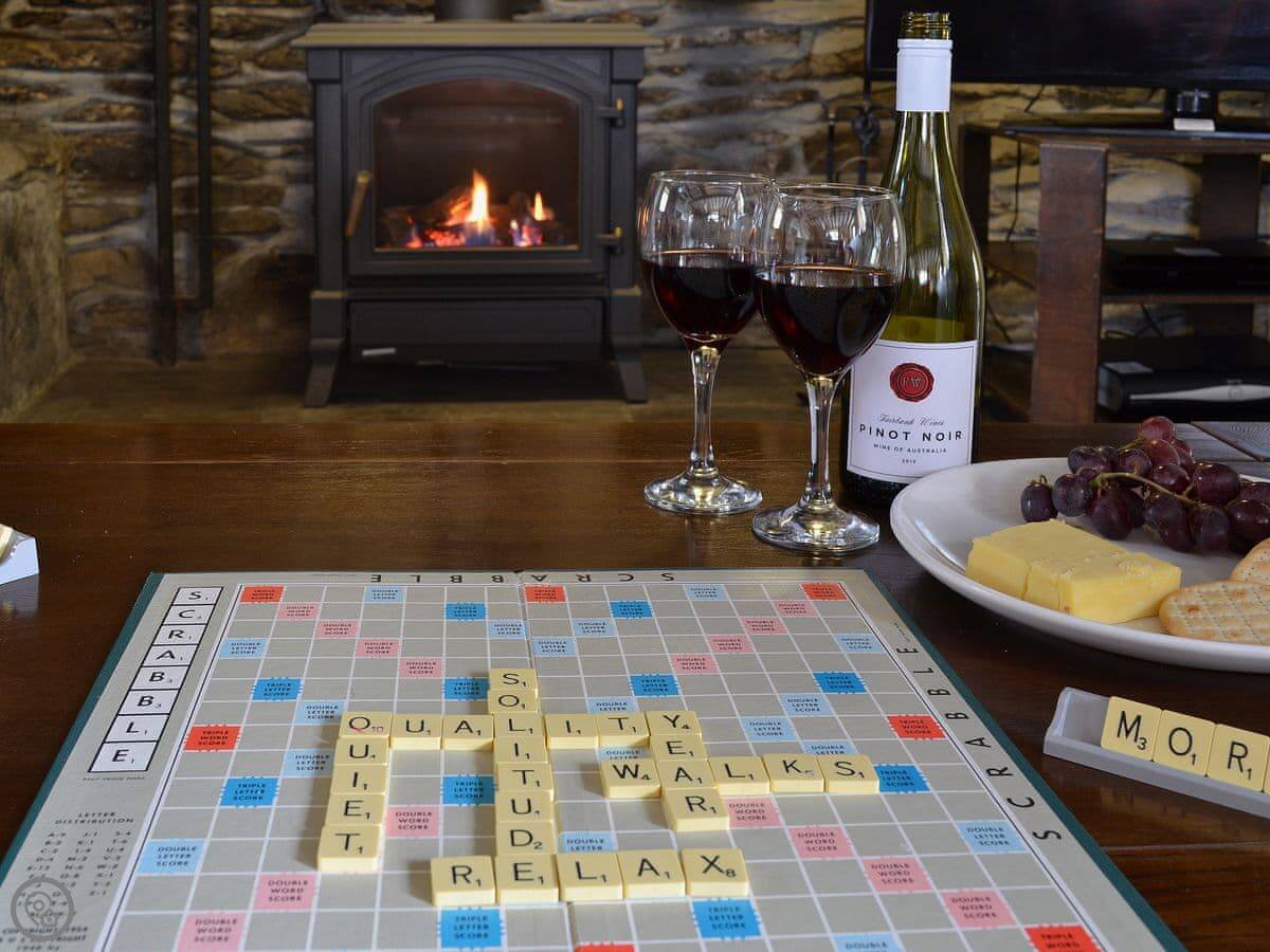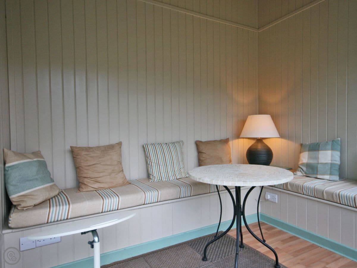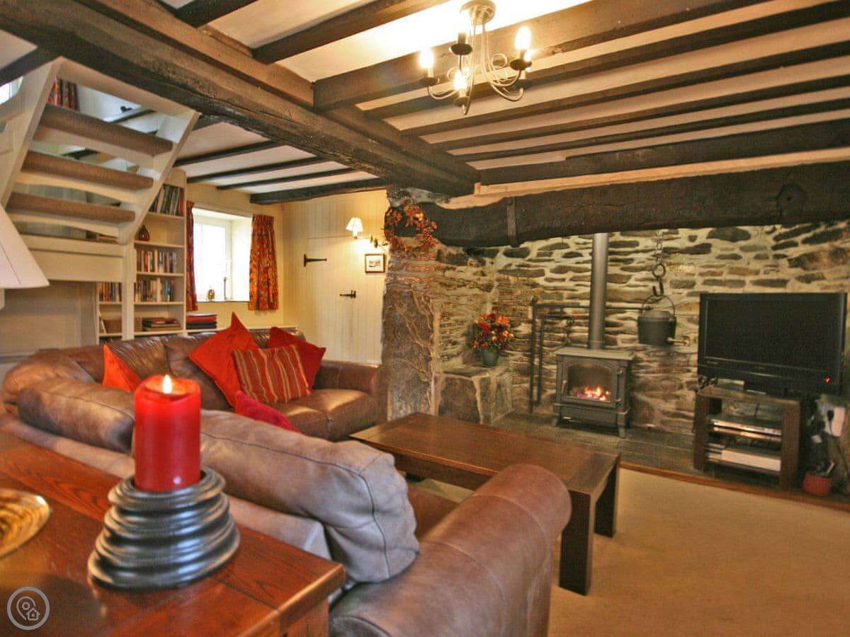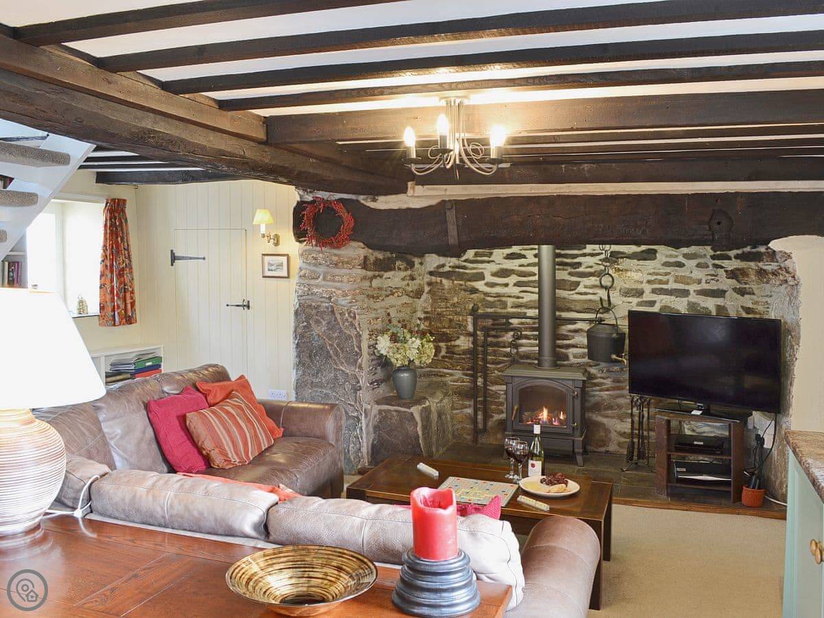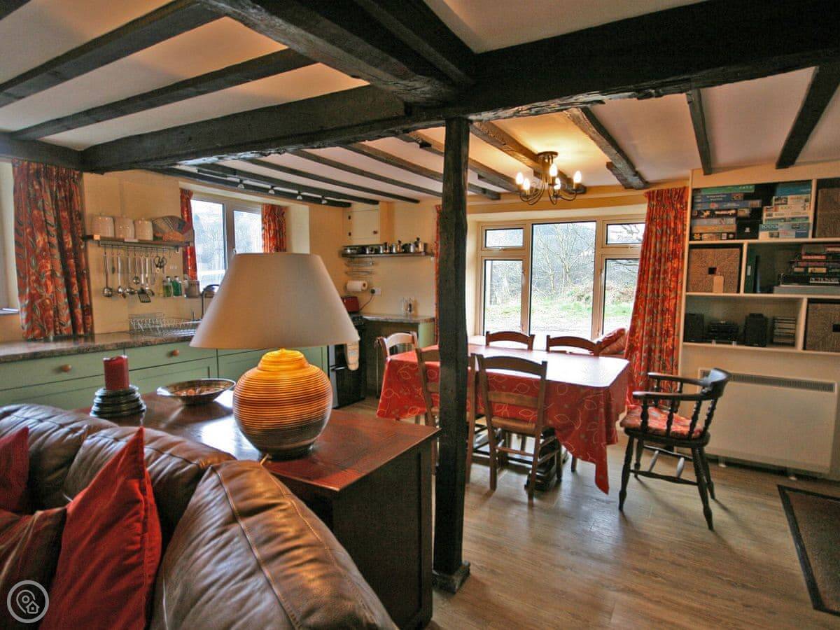 The main room is all open plan. There's a big stone fireplace with an electric stove, the kitchen, and the dining area. The ceiling has the original beams. There's a large picture window with a window seat. The mobile signal isn't great here, so we've left a landline for emergencies.