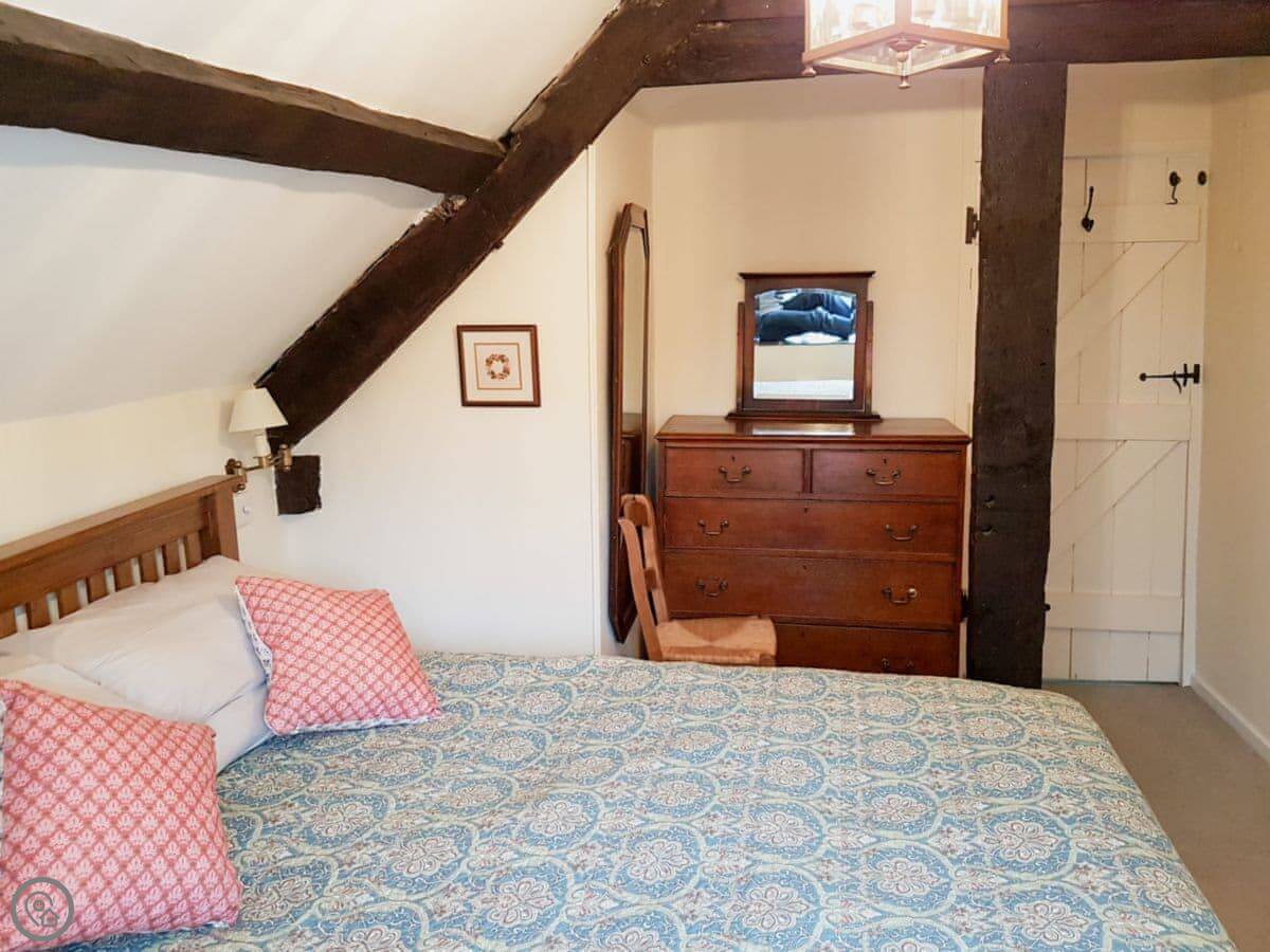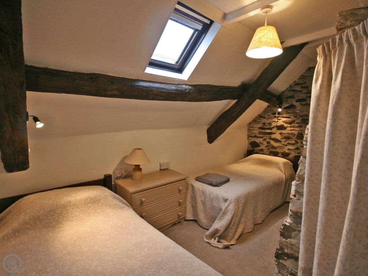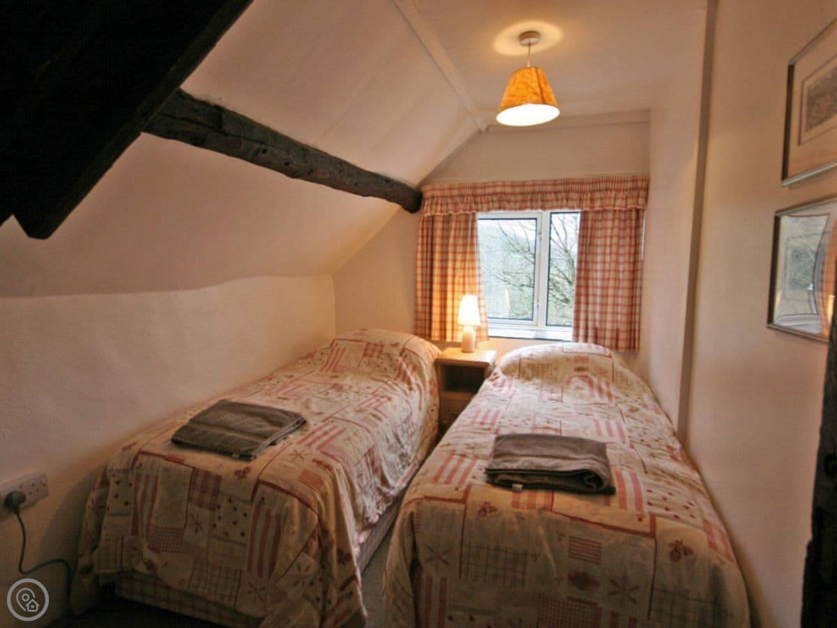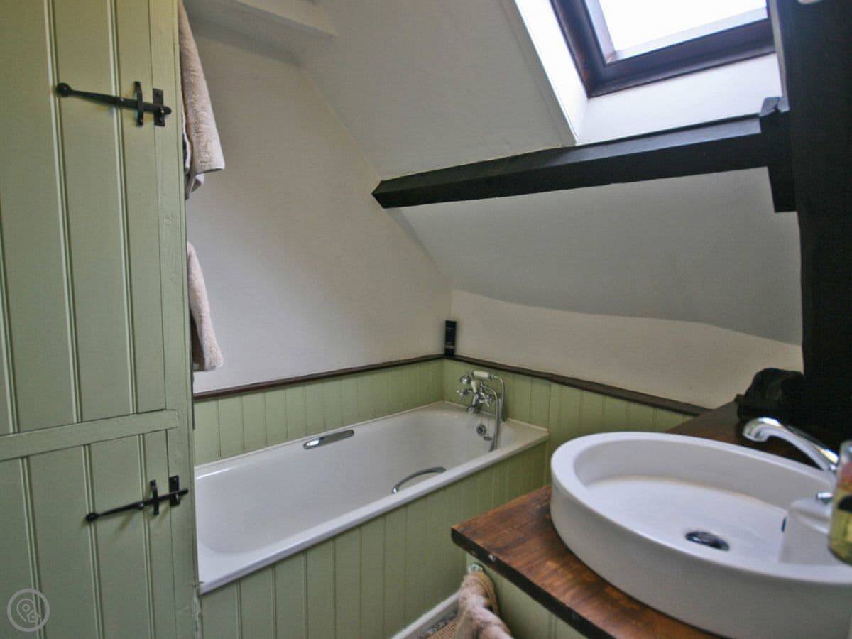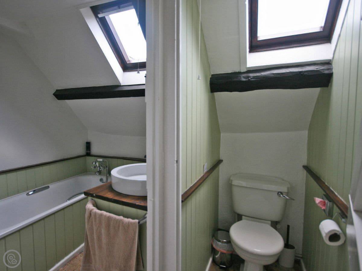 Upstairs there's one king size bedroom and two rooms with twin beds. The bathroom has a bath with a handheld shower attachment, but there's no separate shower cubicle. There's a heated towel rail and a drying cupboard.
