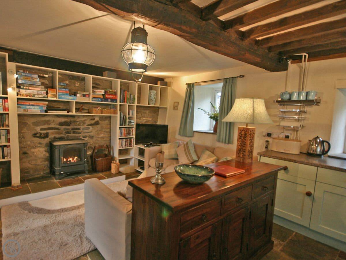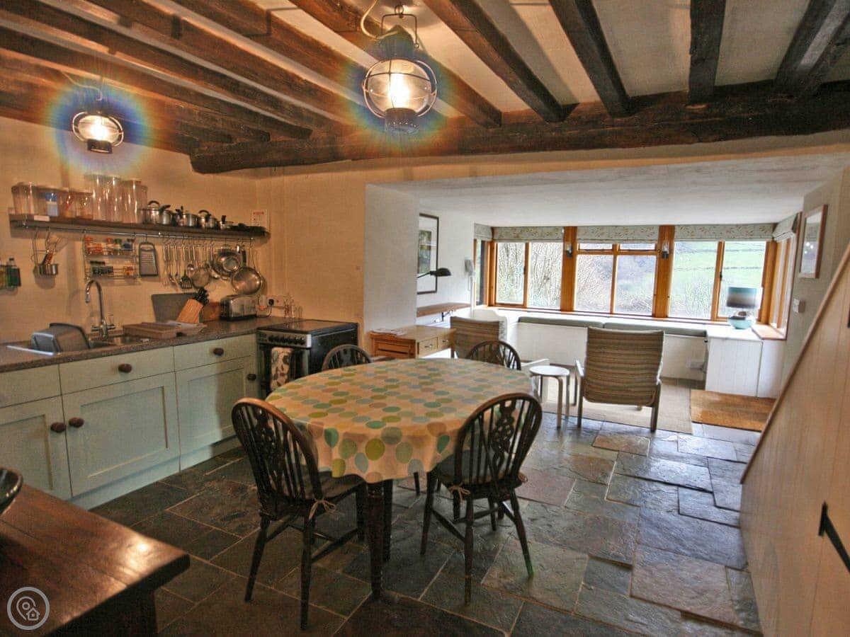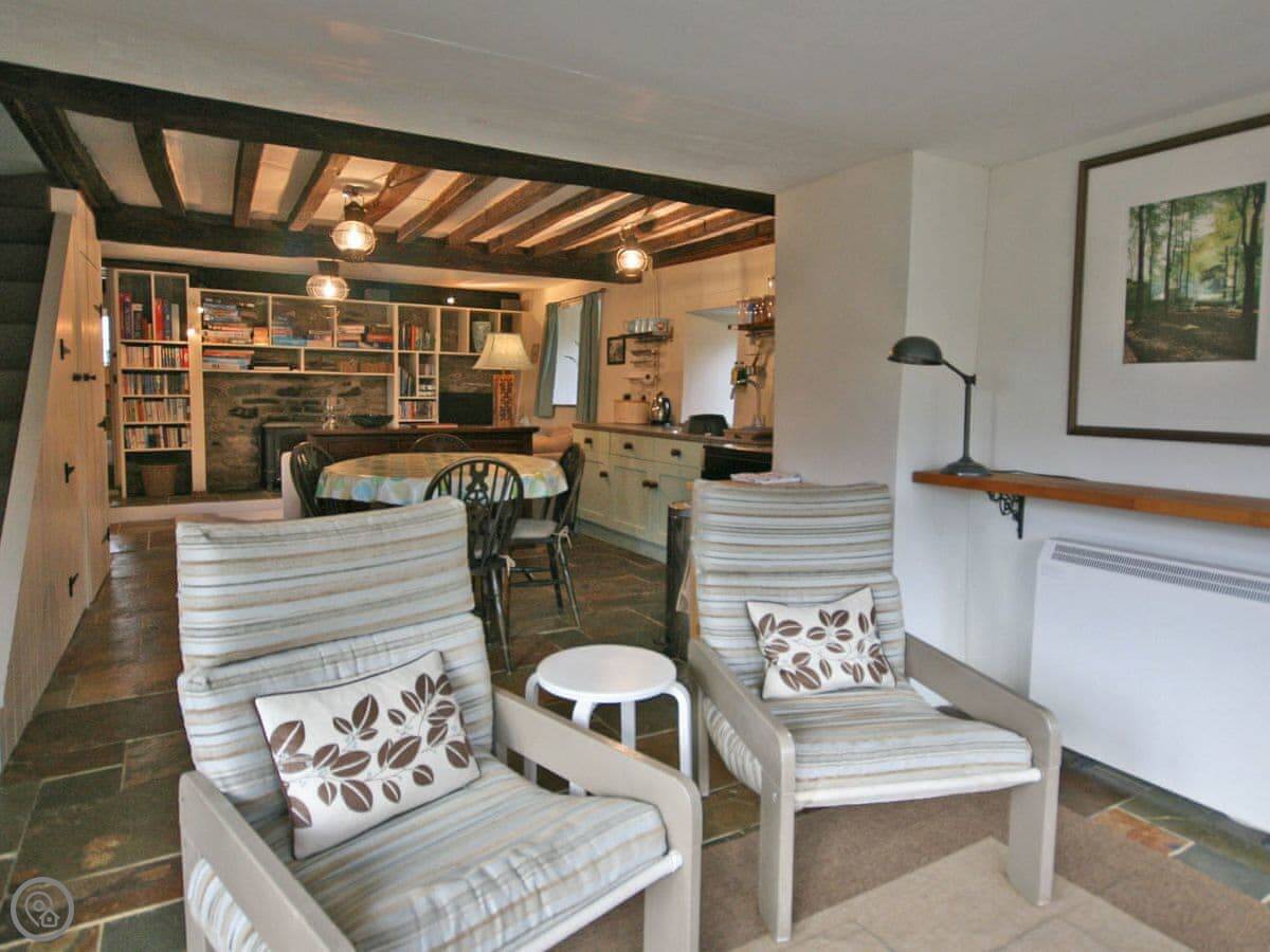 Downstairs is one big room with a slate floor and beams. The kitchen's at one end, the sitting area's at the other with an electric stove. The WiFi is fast, but the mobile signal inside isn't great. There's a landline for emergencies.
