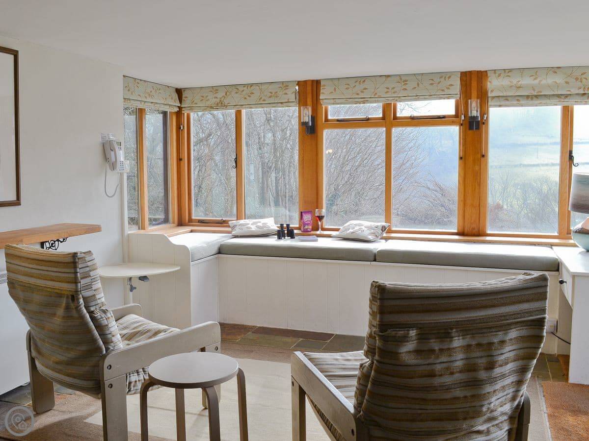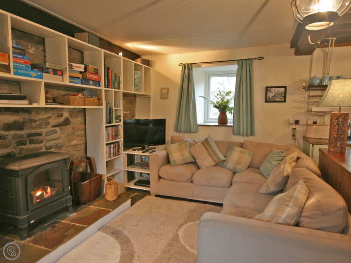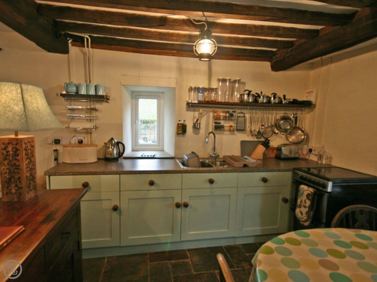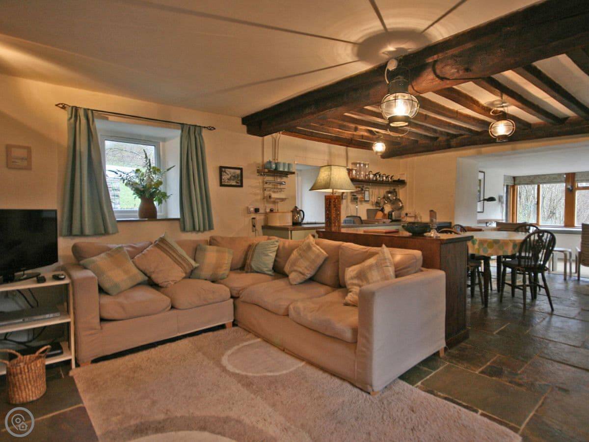 Downstairs is one big room with a slate floor and beams. The kitchen's at one end, the sitting area's at the other with an electric stove. The WiFi is fast, but the mobile signal inside isn't great. There's a landline for emergencies.