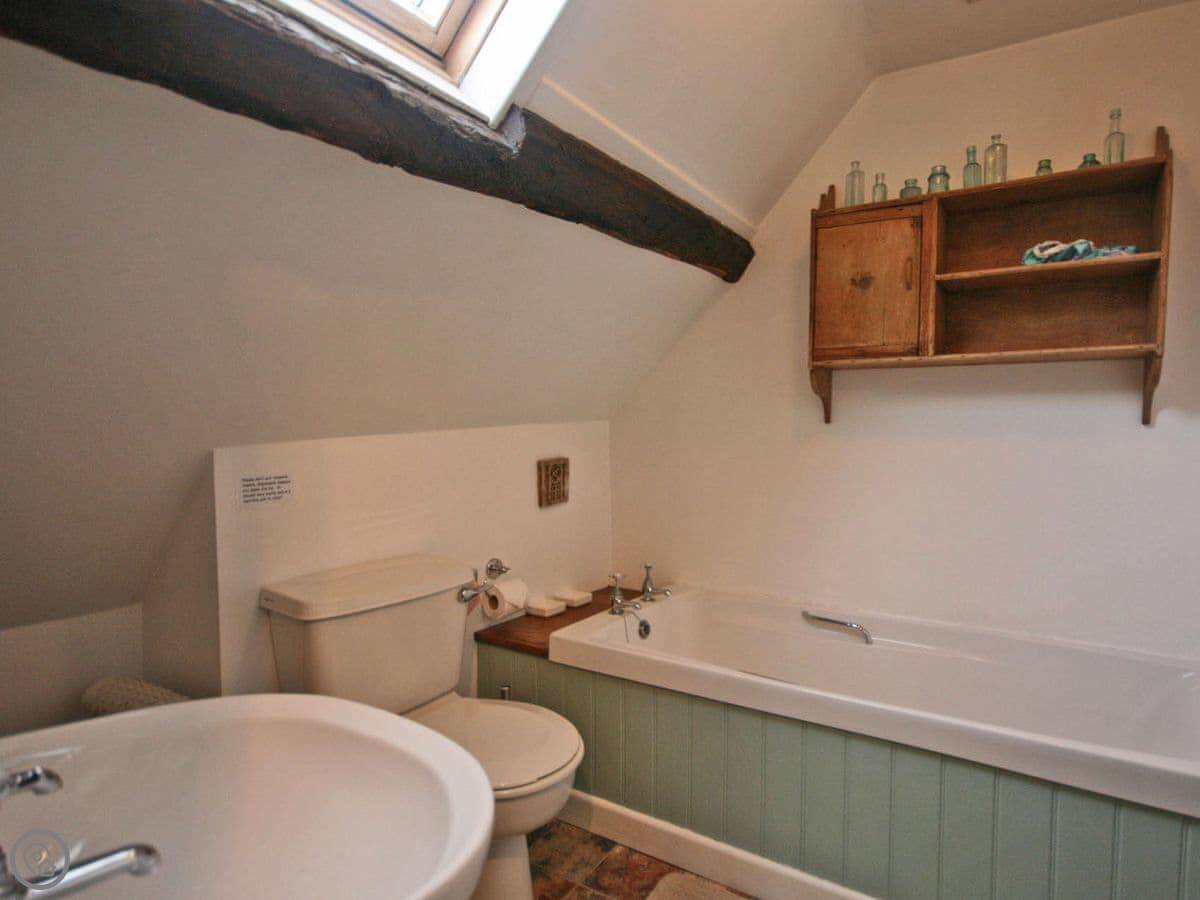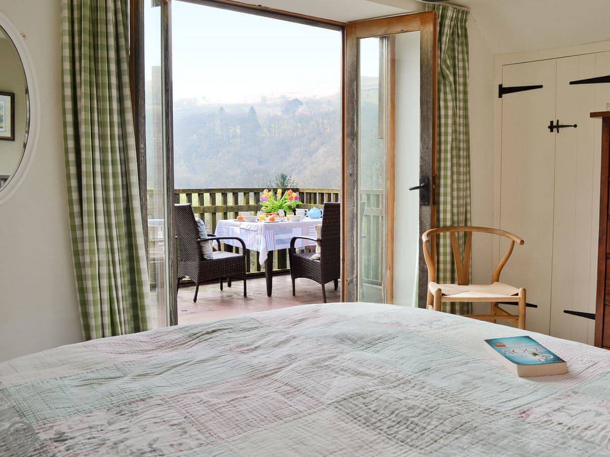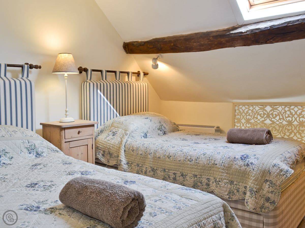 Upstairs, the main bedroom has a king-size bed and a private balcony you can sit out on. The second room has twin beds. The bathroom has a bath with a handheld shower attachment, but there isn't a separate shower cubicle. The stairs are the original cottage ones, so they're a bit steep and narrow.