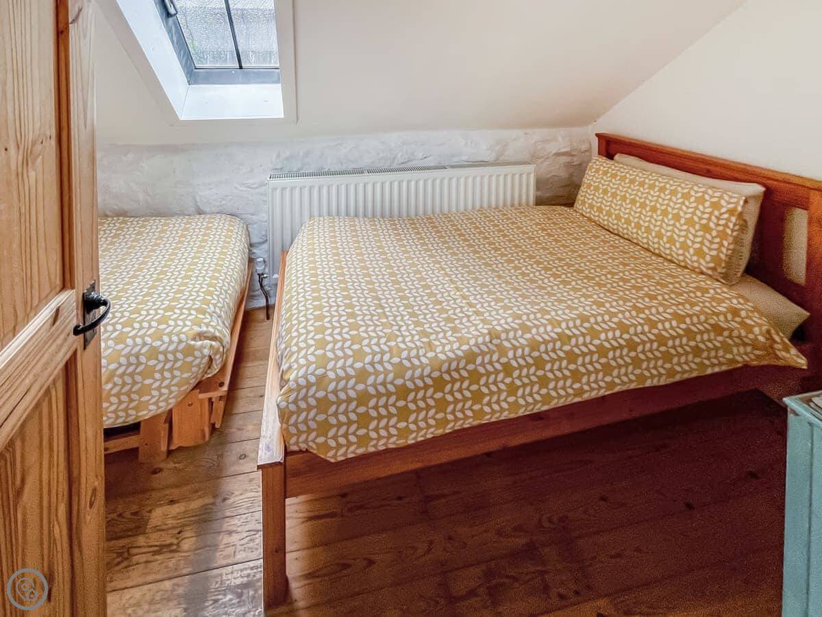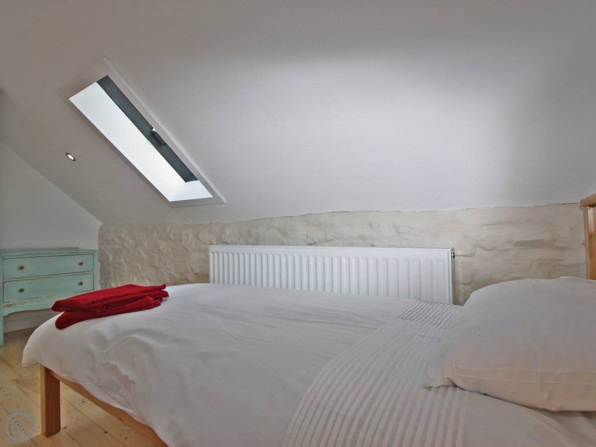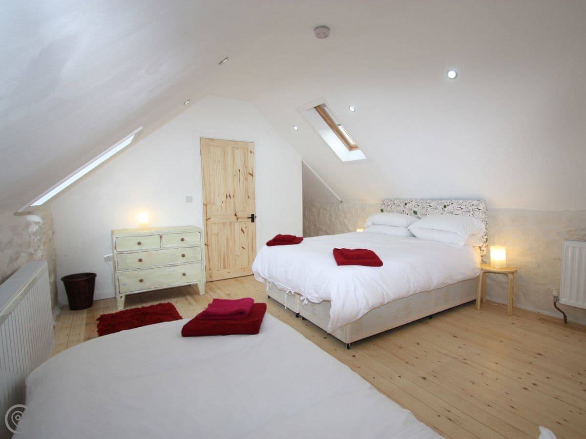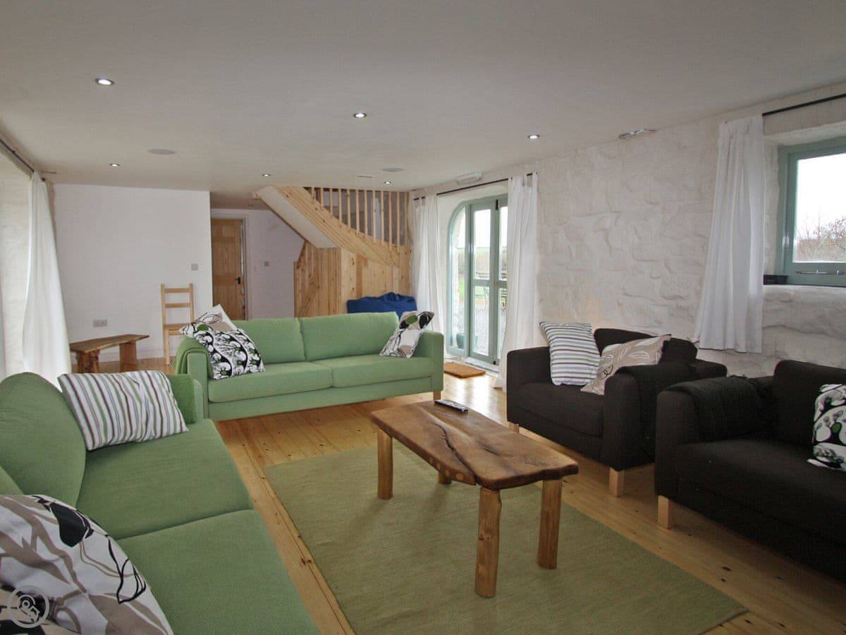 The Barn is on the headland in Talbenny, just outside Little Haven. It's about a mile from the sea. It's a converted stone barn, so the walls are thick. It sleeps eight, in three bedrooms. There are two bathrooms.