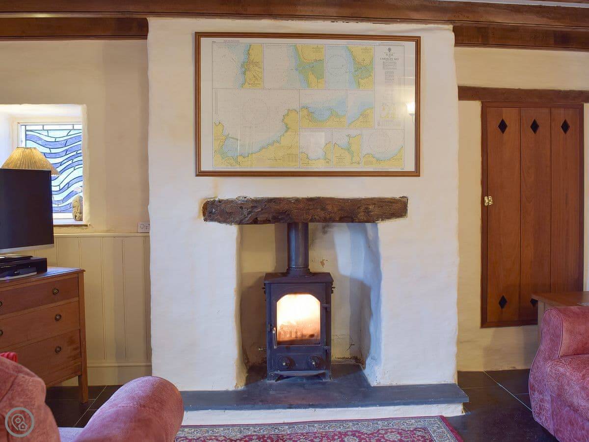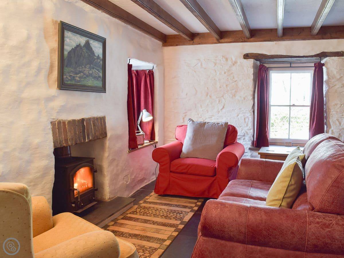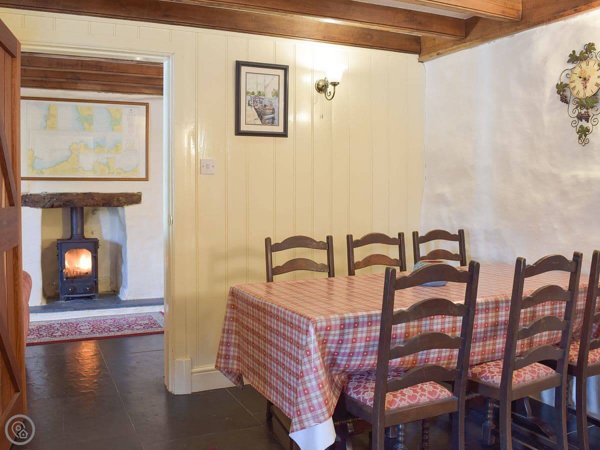 Downstairs has slate floors and two living areas, both with wood burners. Underfloor heating too, so it's never cold.