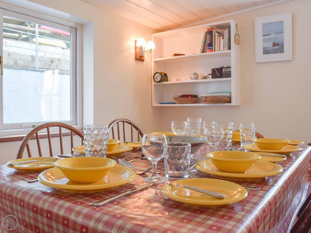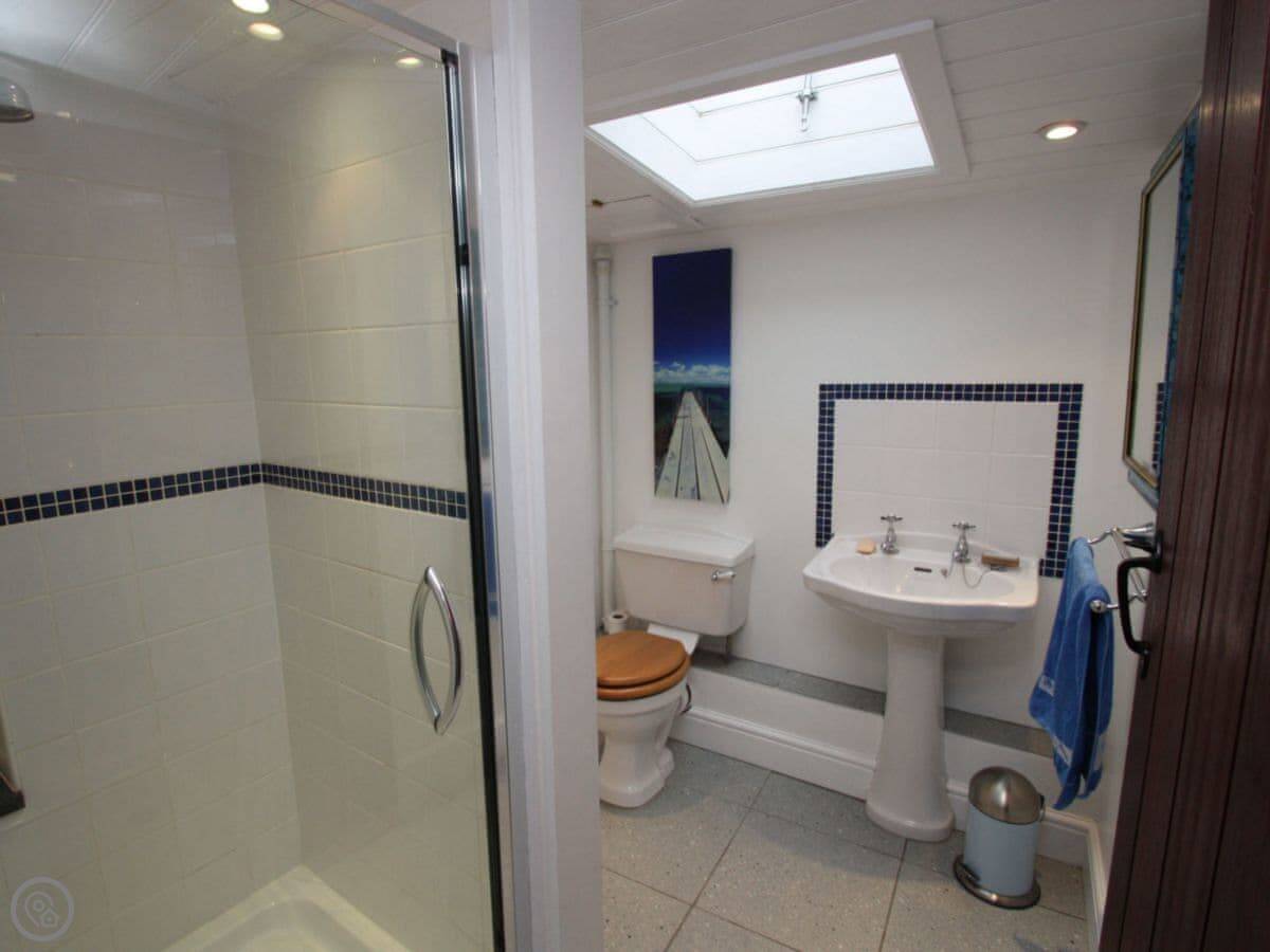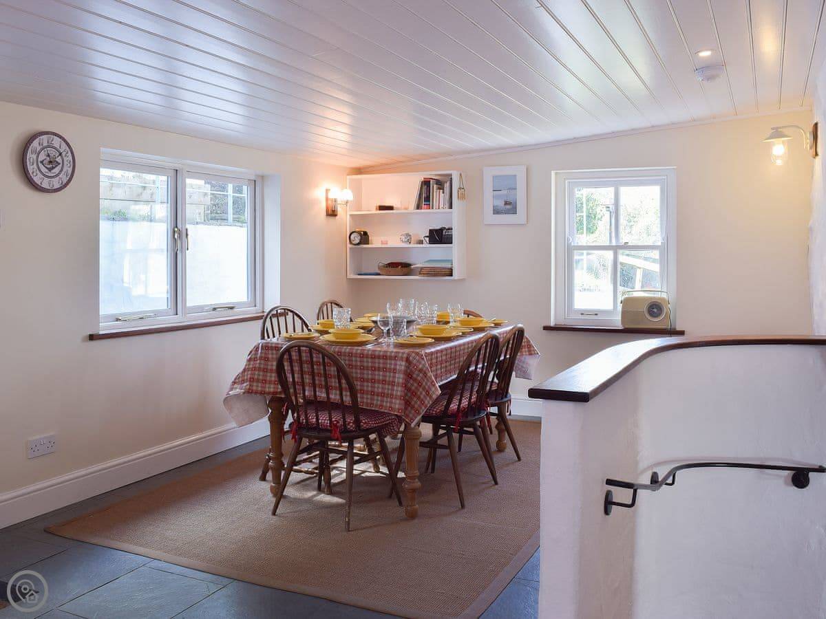 Downstairs has slate floors and two living areas, both with wood burners. Underfloor heating too, so it's never cold.