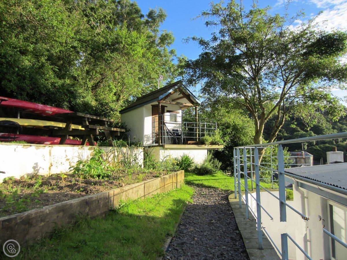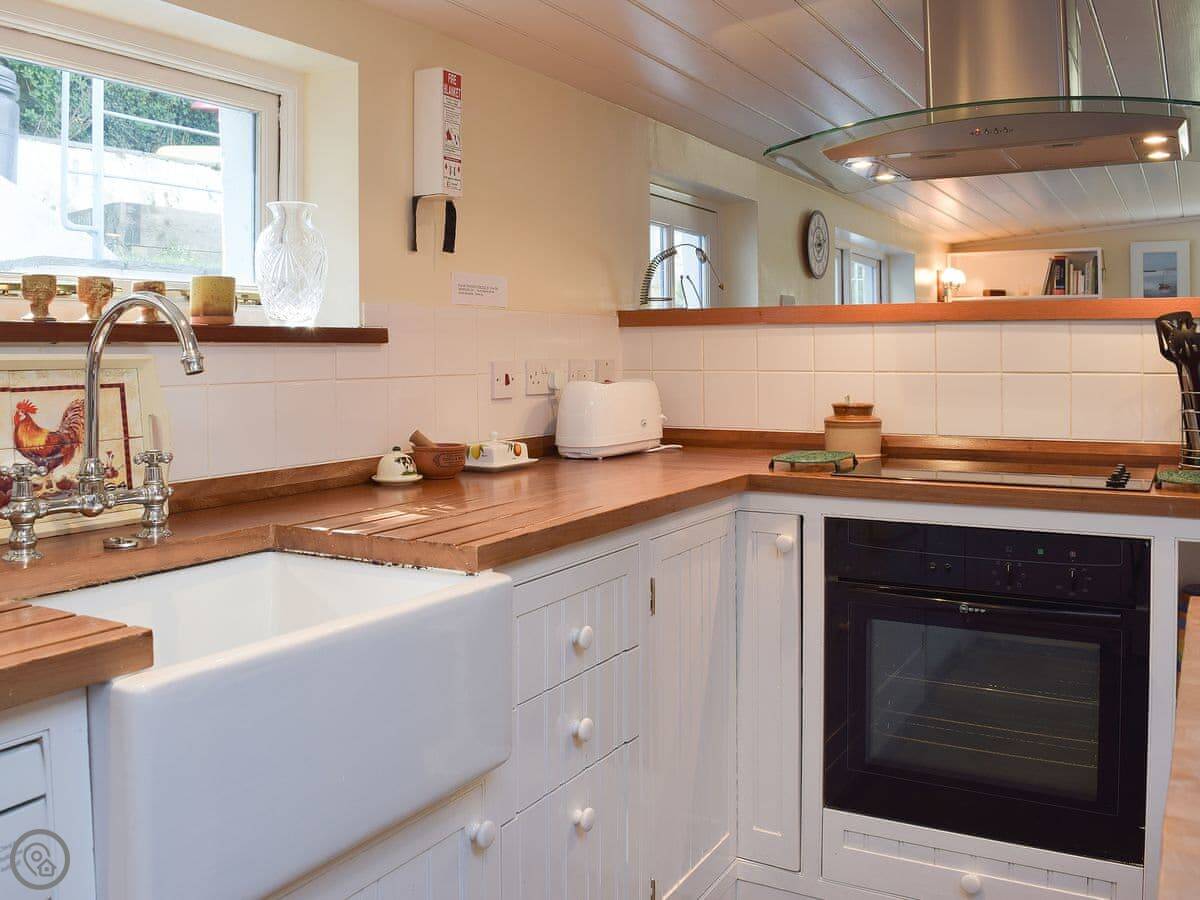The kitchen's up a short, curved staircase from the living room. It's a good size, has everything you'd need. The back door from the kitchen leads out to the garden. It's split-level, looks over the harbour. Good spot for the BBQ.