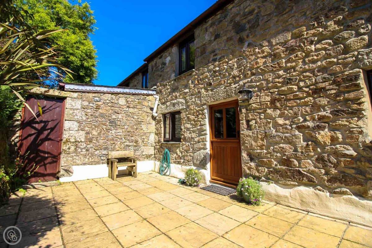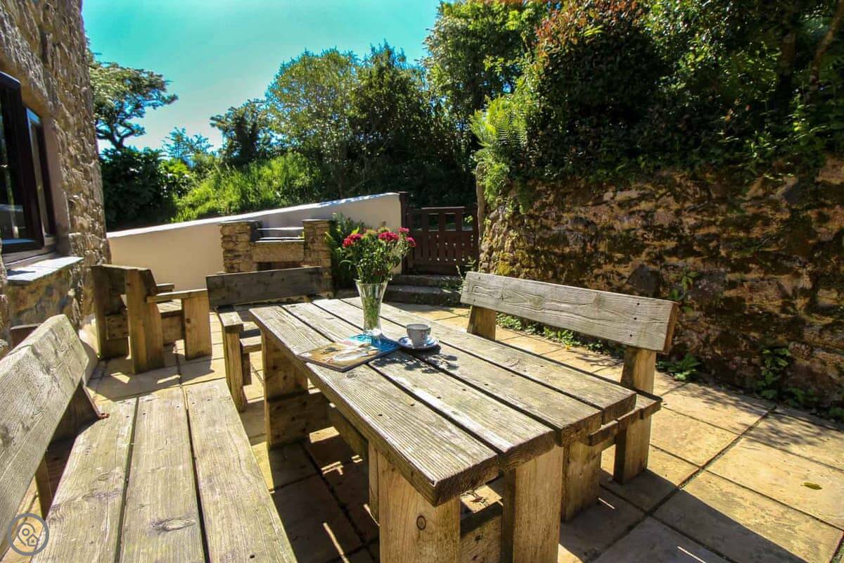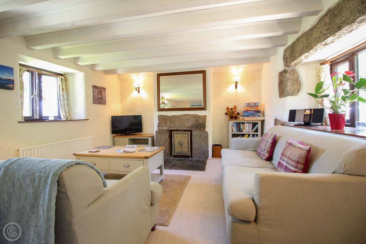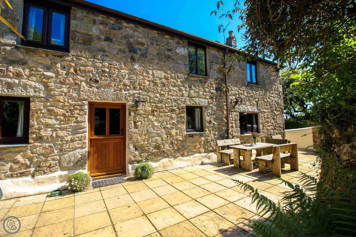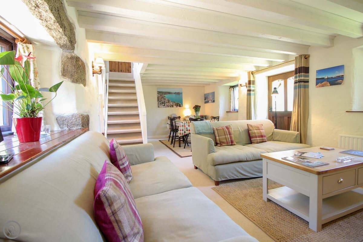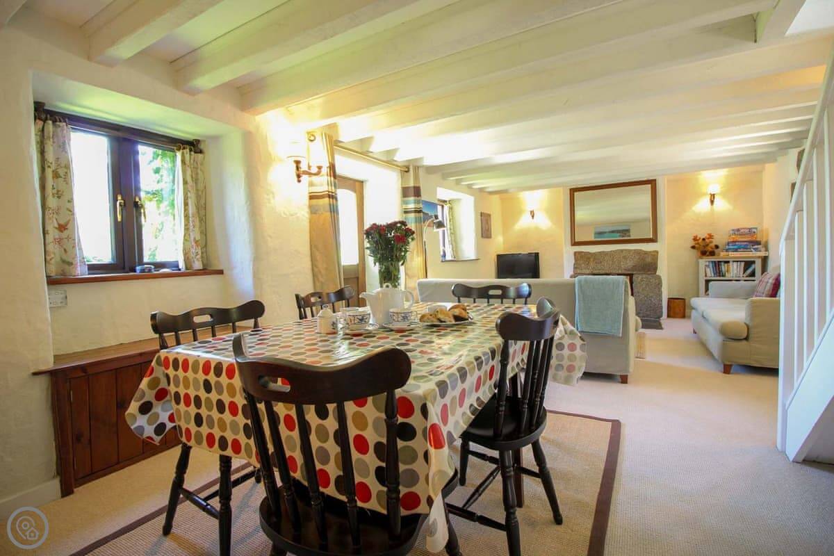 Ruby Farm Cottage nestles behind the main farmhouse and is a stunning traditional granite Cornish Cottage, surprisingly spacious inside with plenty of character features including exposed beams and a stone fireplace . Outside there is a terraced patio, complete with table, chairs and a barbecue, a hidden garden can be discovered up some granite steps which is a delightful spot to soak up the evening sunlight while enjoying a glass of wine. To the front of the main farmhouse is a communal area that is shared with the other two cottages at Ruby Farm, Kernyk cottage and Dingley cottage. There are various outdoor games that the family can enjoy & seats to relax on.