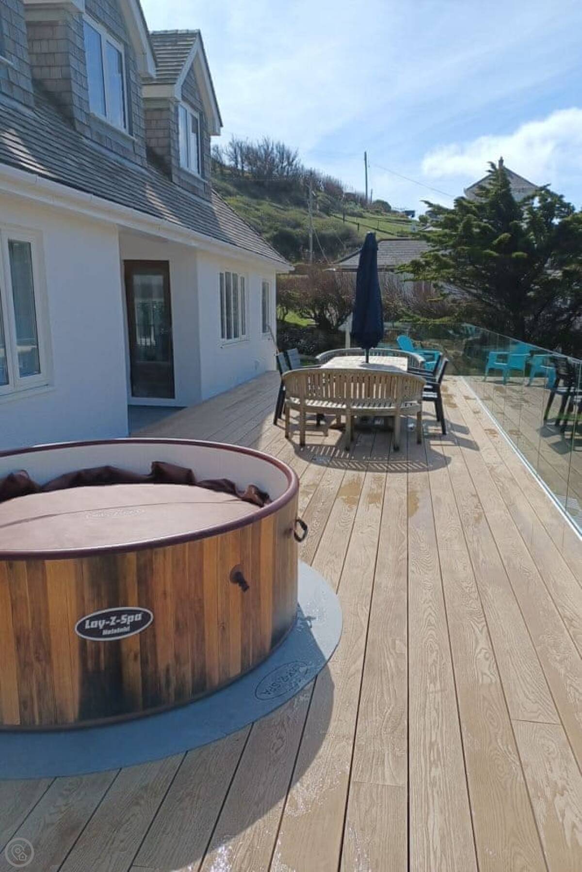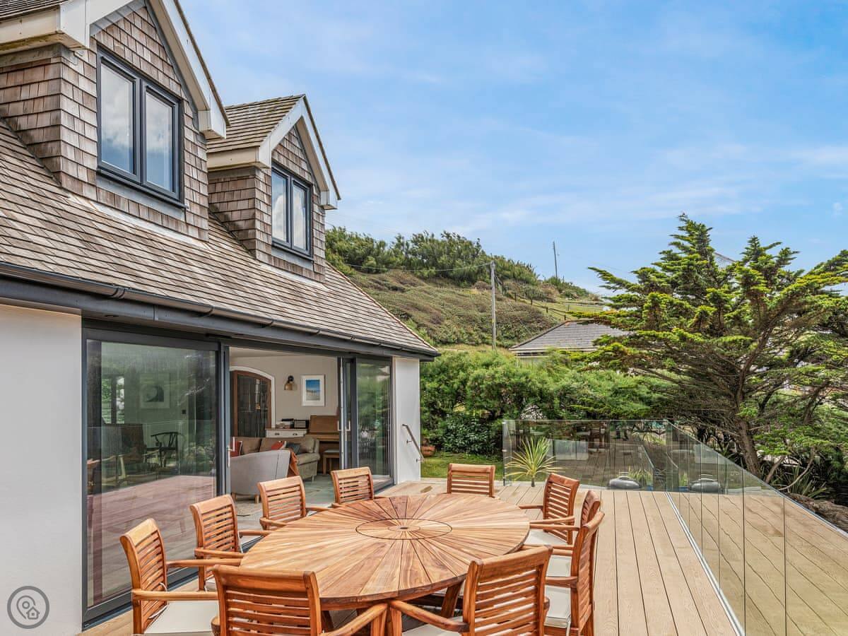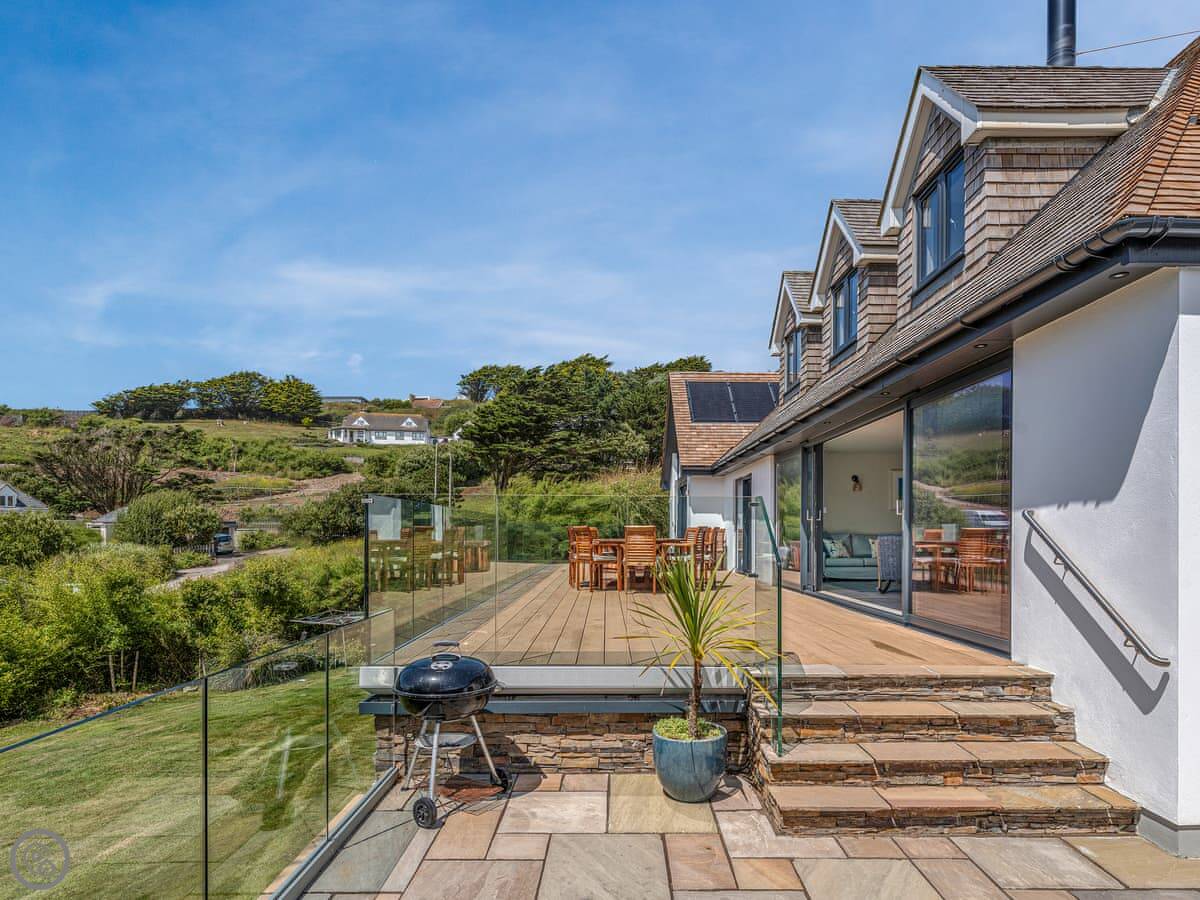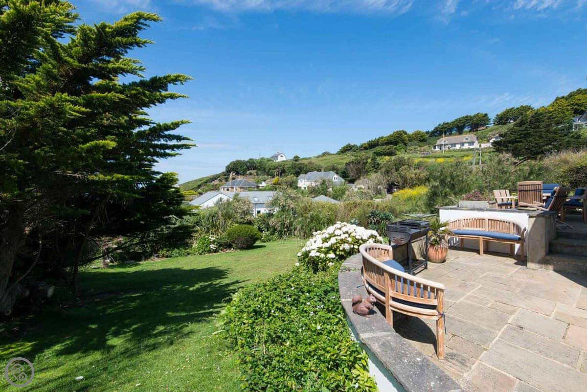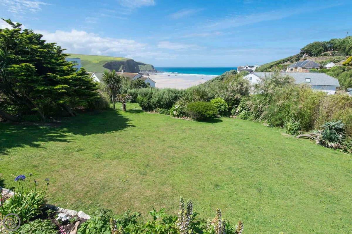 The garden is large, about a third of an acre, and slopes down towards the sea. There's a stream at the bottom. The deck gets the sun most of the day. You can walk to the beach in about five minutes from the garden gate. When you come back, there's an outdoor shower to wash the sand off.