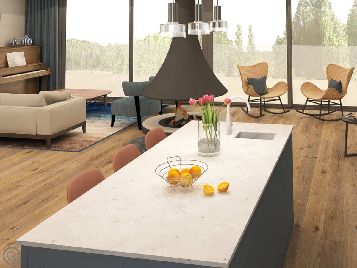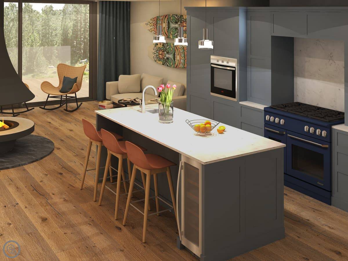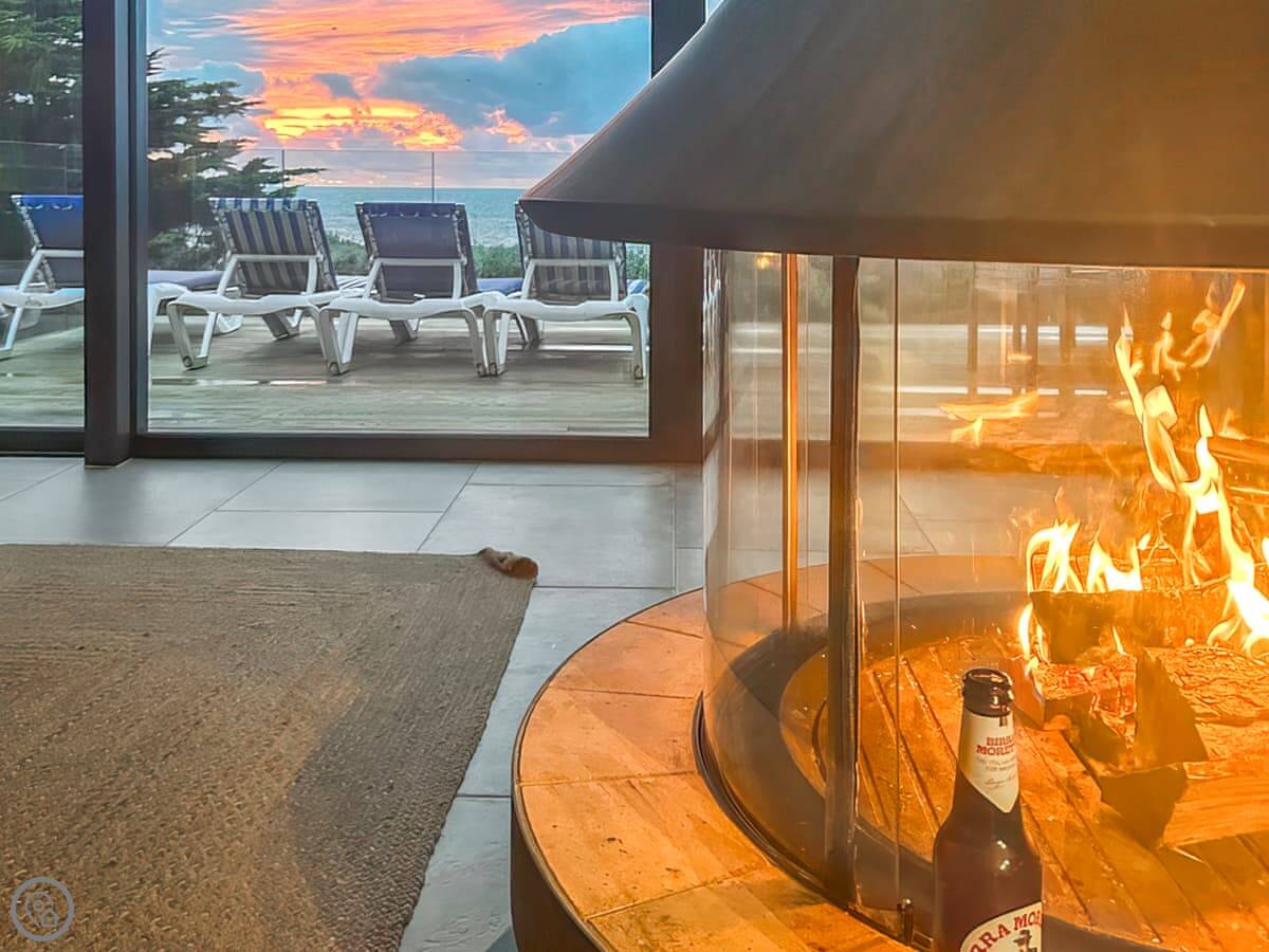 Inside, it's open plan with big sliding doors to let the outside in. There's a circular fireplace for cooler nights. The kitchen is well kitted out. Upstairs, one of the bedrooms has the best view of the lot.