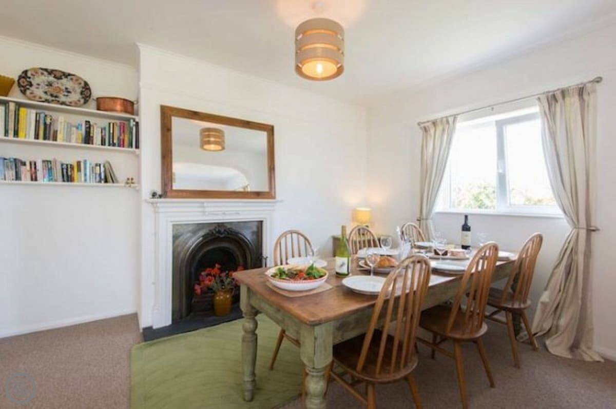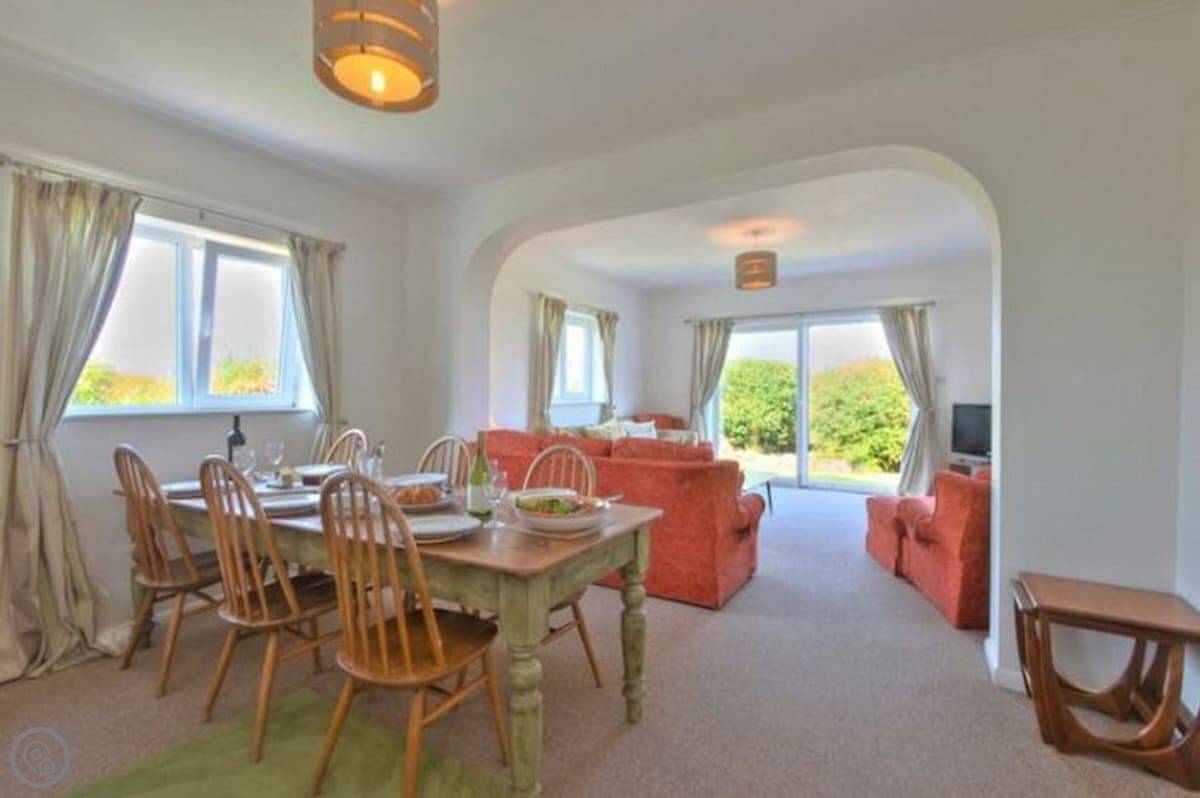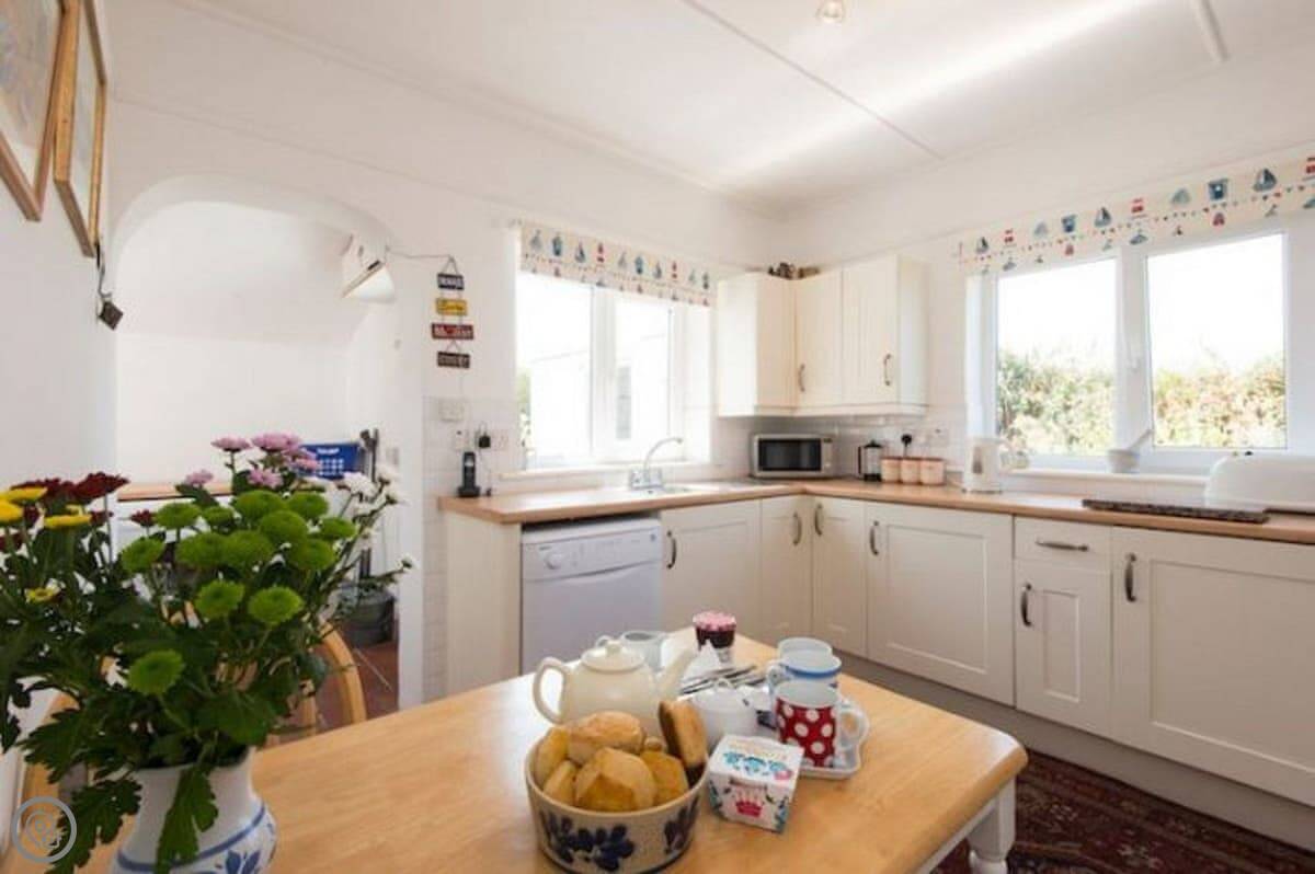 Dunroamin is a well presented, four bed house, with a light and airy feel and all modern amenities. It is ideally suited to a family group with the upstairs bedroom making a perfect room for children with two or three single beds, one is a pull-out bed. The large, double aspect, living/dining room has a patio door to the garden which in turn has views across fields to the sea. What better way to enjoy your holiday on a balmy summer’s evening, with a barbeque simmering in the background, the golden sun easing down towards the sea on the horizon, a lovely glass of your favourite tipple in hand while surrounded by friends and family.