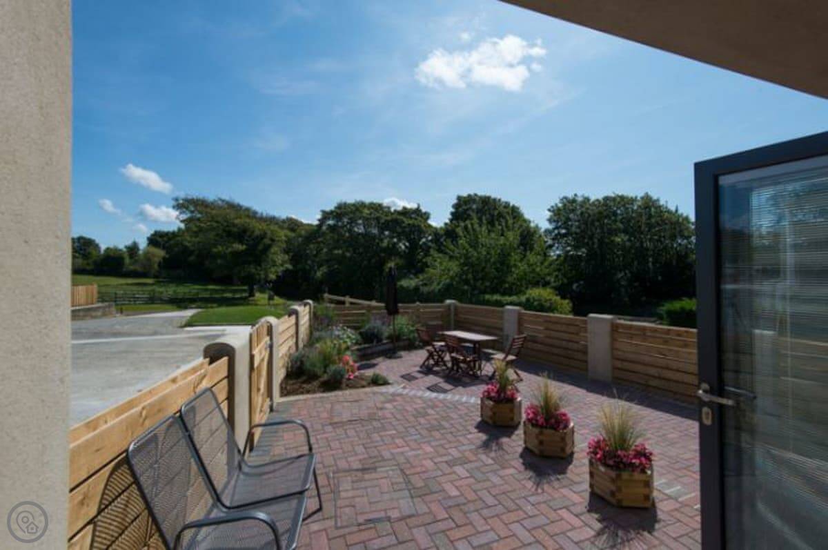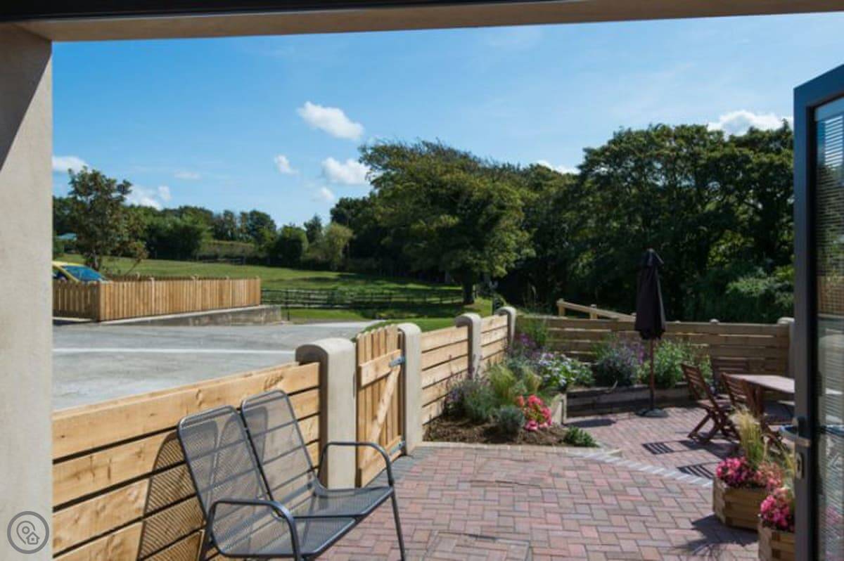Outside is a small, enclosed courtyard garden. It gets the sun and has a barbecue. The view is over the valley.