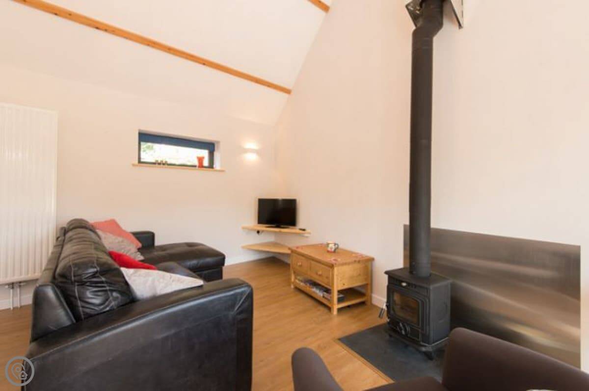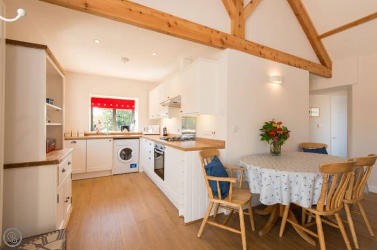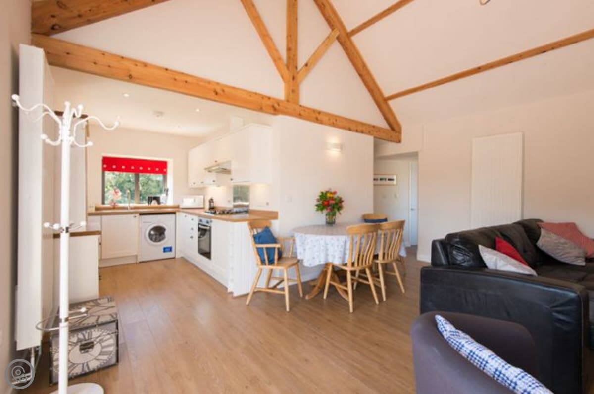 Inside, it's one big open space with a high ceiling, so it feels quite airy. There's a wood burner for cooler evenings. The kitchen has a dishwasher and washing machine. You get bedding and towels.