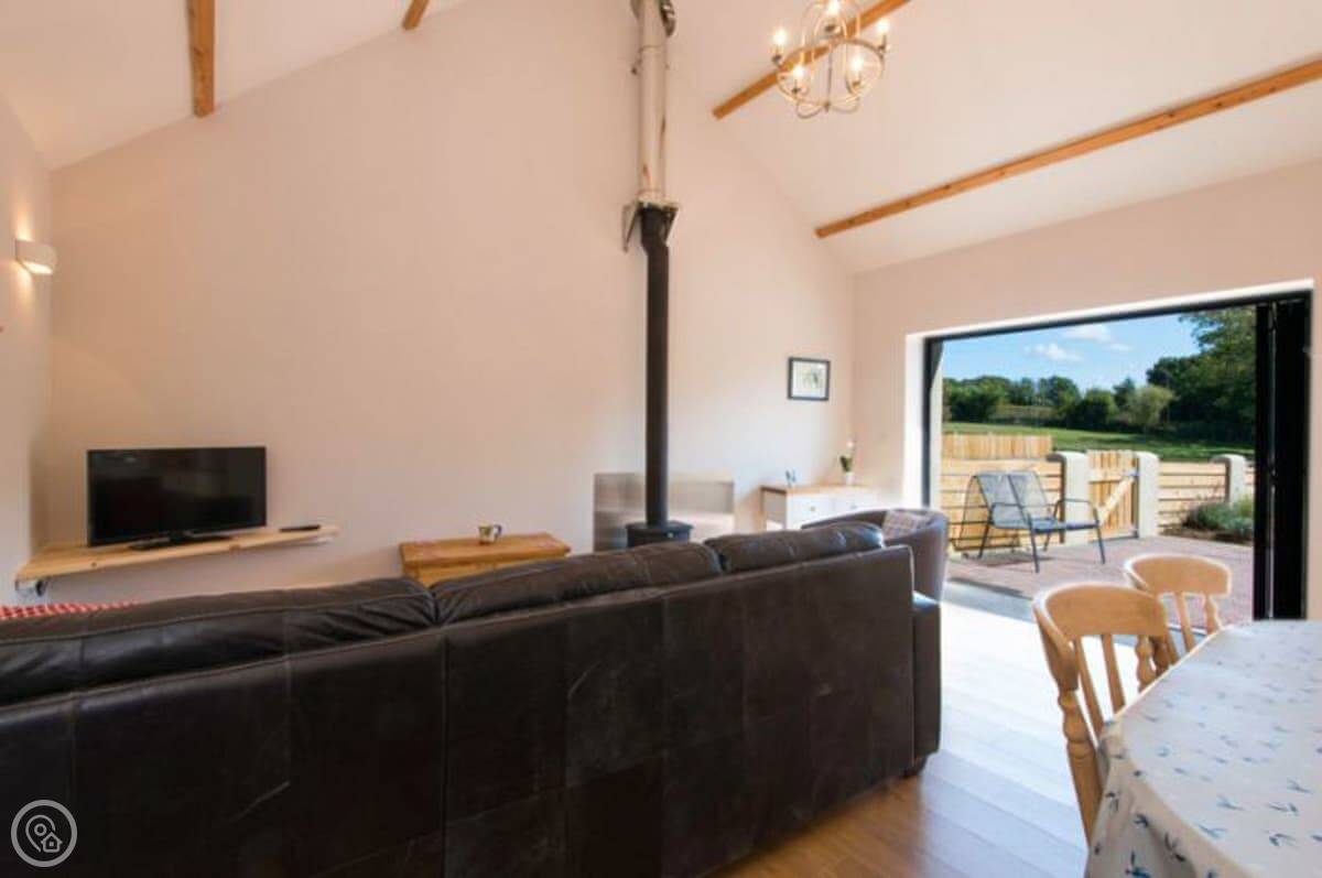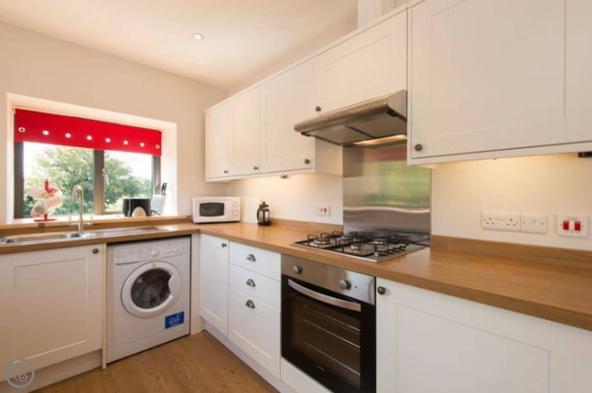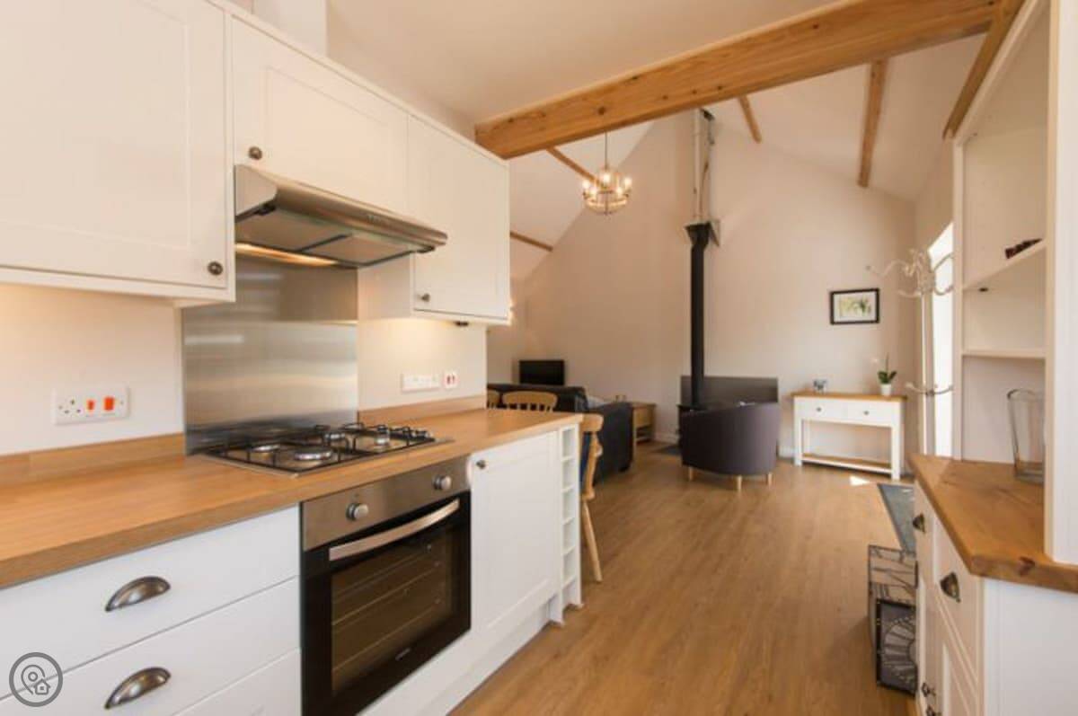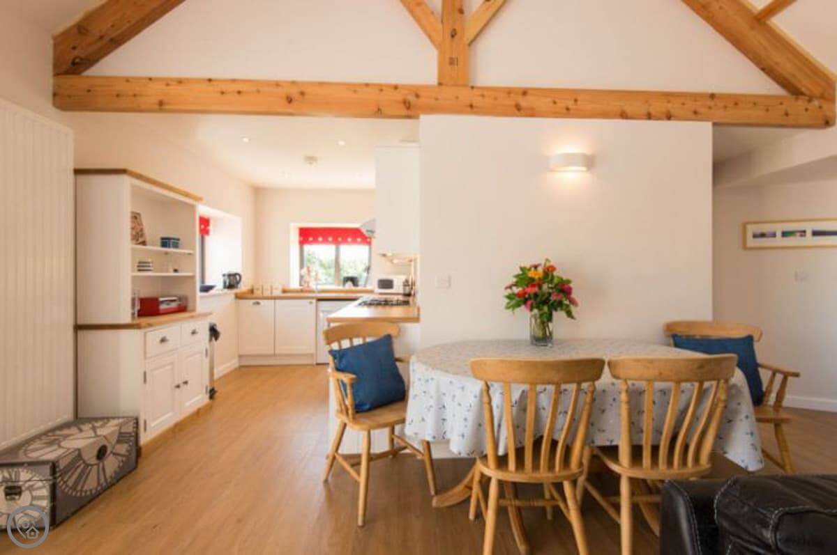 Inside, it's one big open space with a high ceiling, so it feels quite airy. There's a wood burner for cooler evenings. The kitchen has a dishwasher and washing machine. You get bedding and towels.