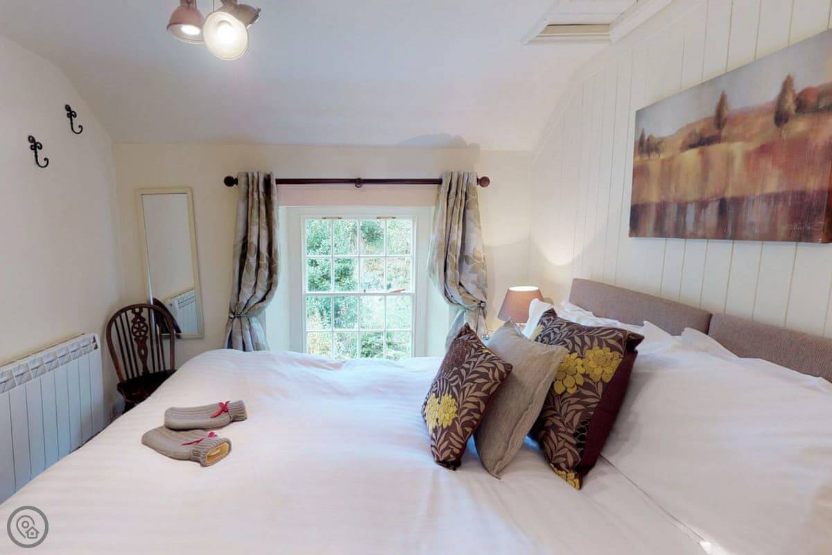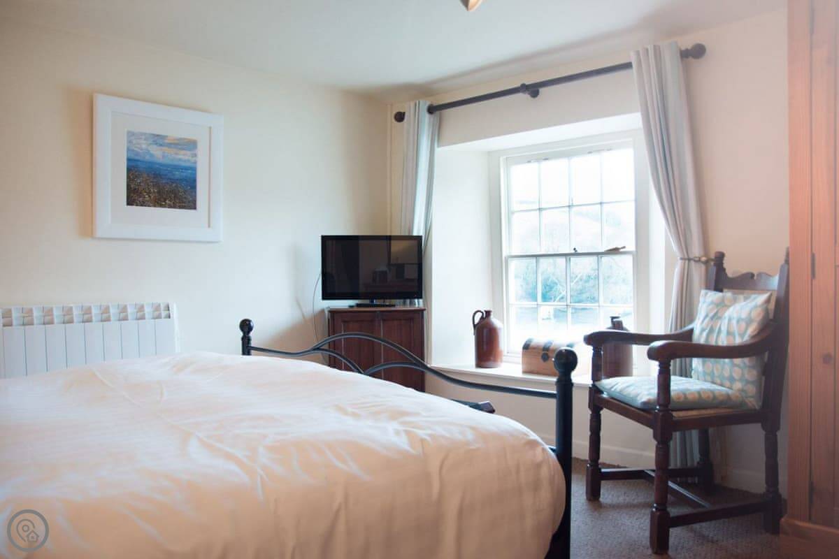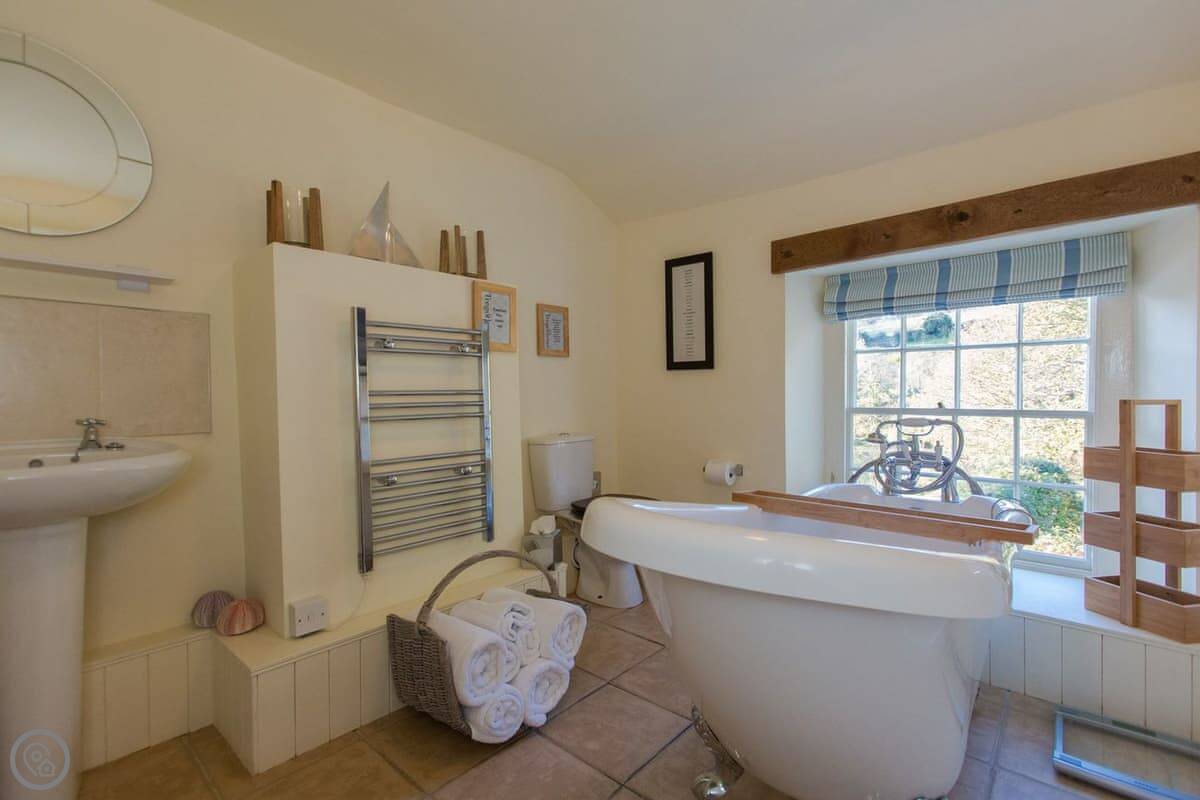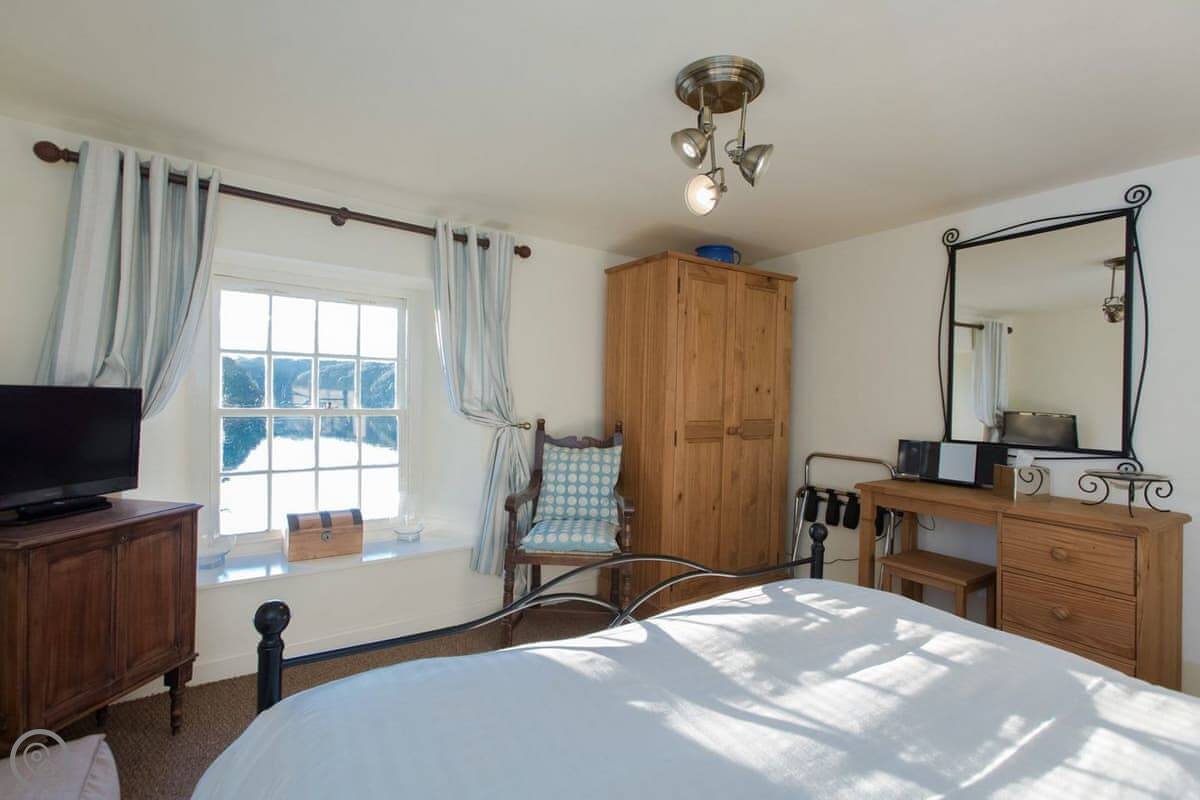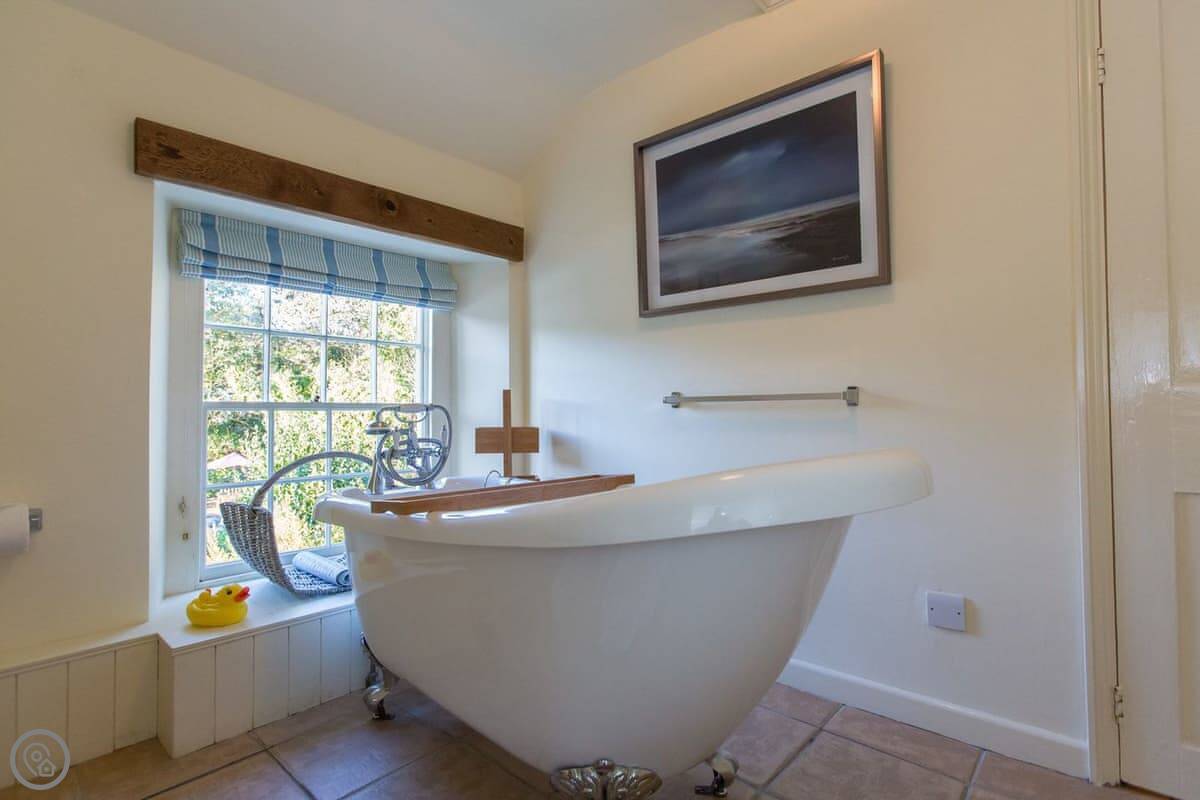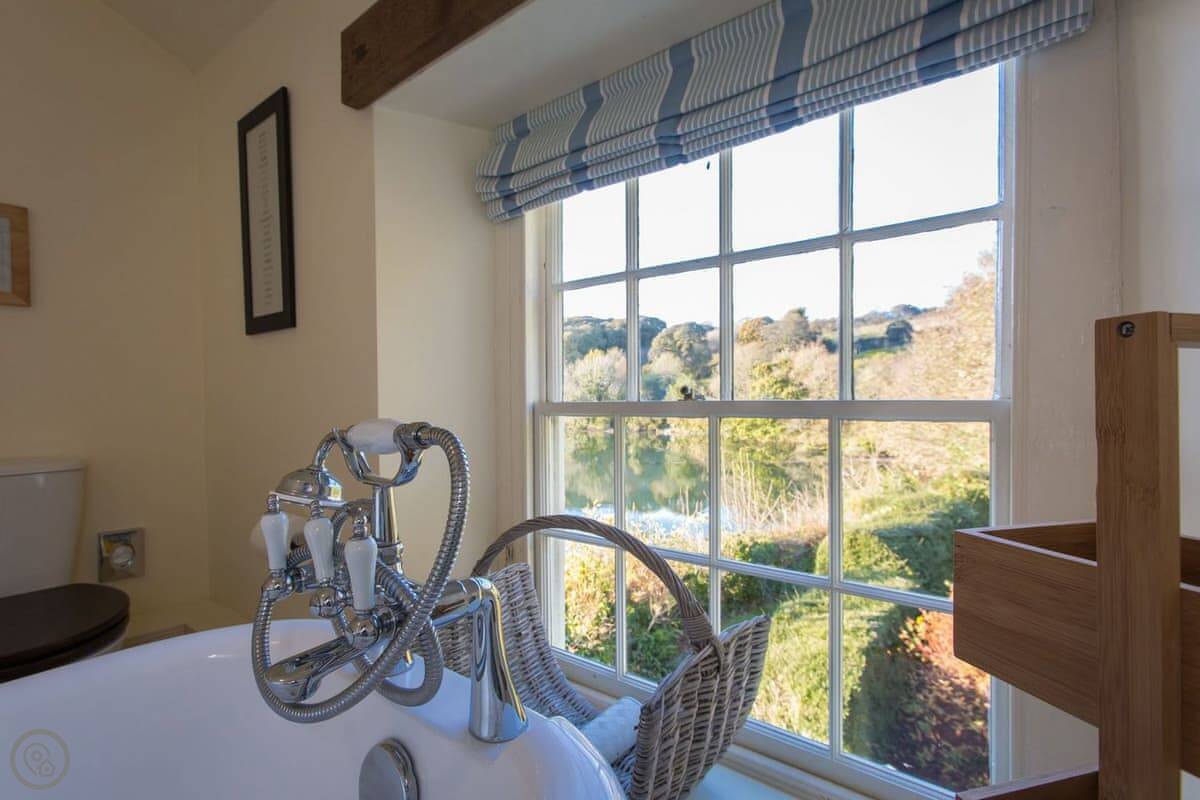 It sleeps four. Two bedrooms, both with kingsize beds, and two bathrooms. The main bedroom looks out over the river, which is nice. There's a bathroom with a big slipper bath where you can look at the view. The place has been done up recently.