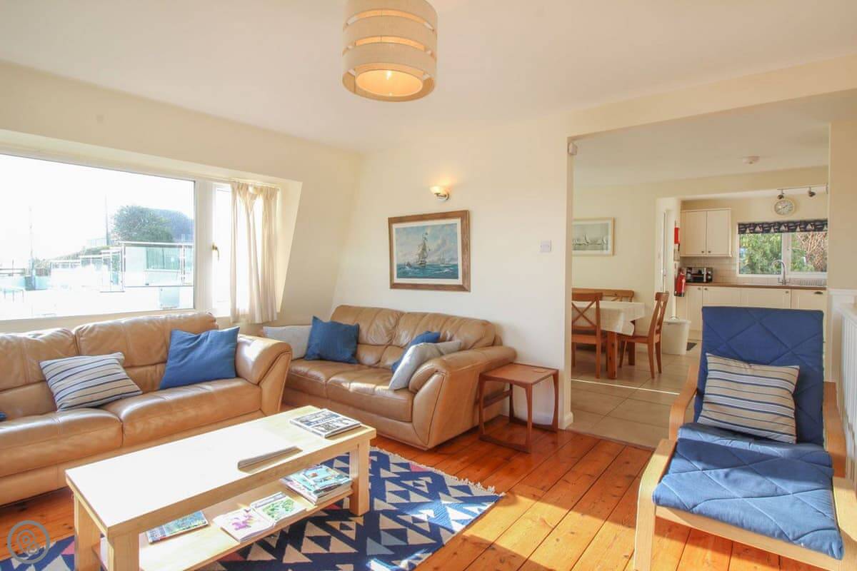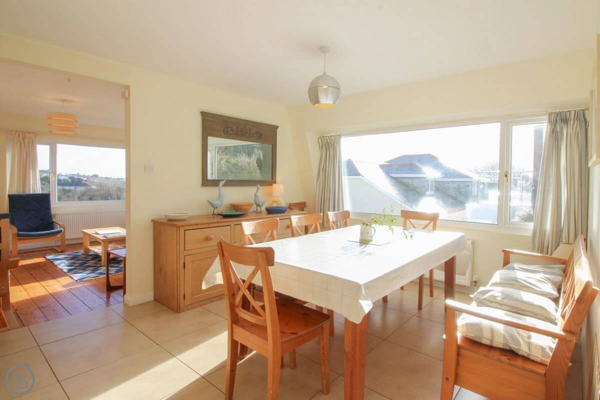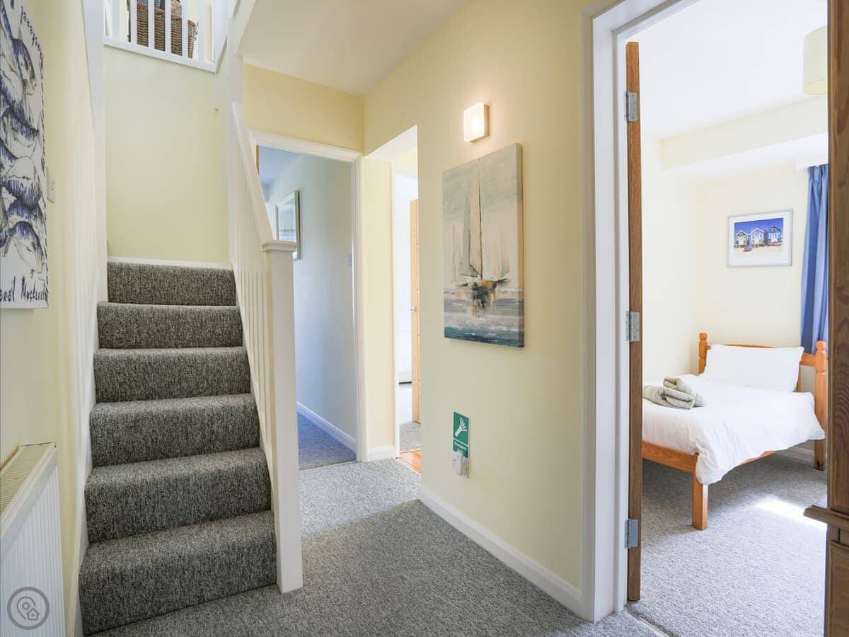 The layout is upside down, so the main living area is upstairs. That's where the kitchen, dining table, and sitting room are. The view from the deck there is good, you look out across the water. It's enclosed, so it's safe. Downstairs are the four bedrooms: two doubles with king-size beds and two twins.