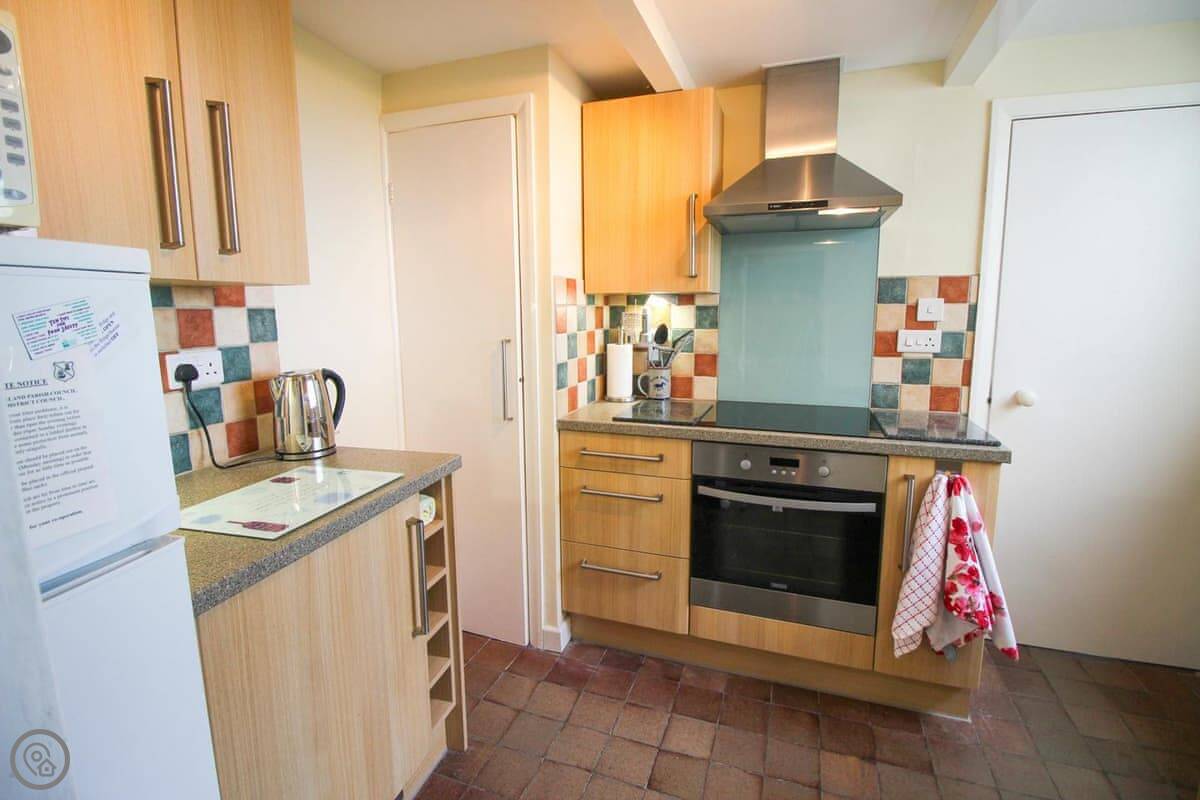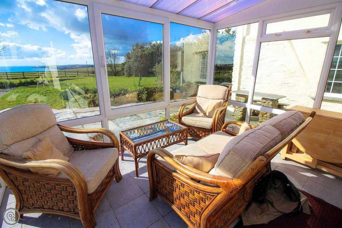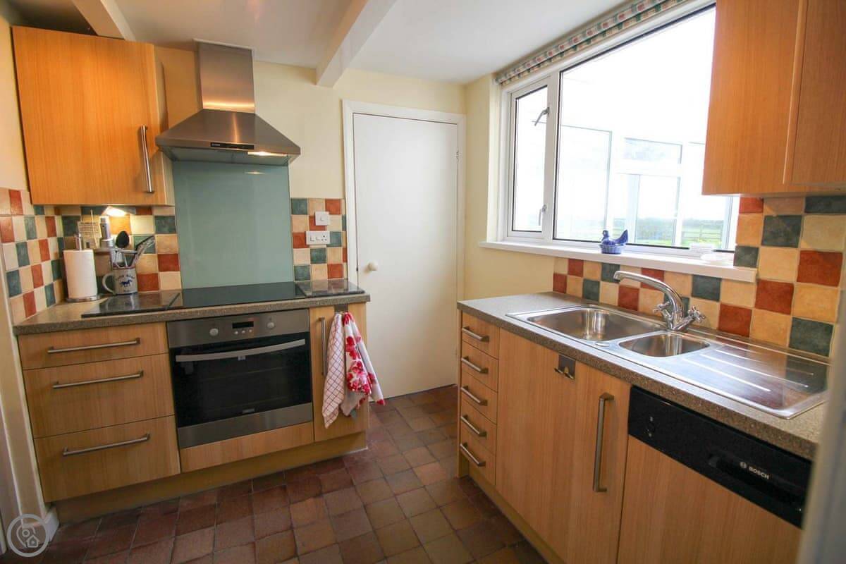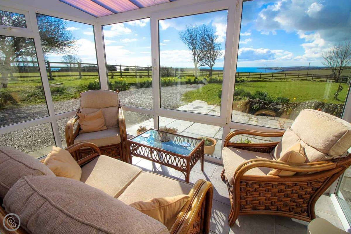 Downstairs there's a living and dining room with an open fire. The kitchen has what you'll need. There's also a conservatory with sofas, which is a nice spot when the sun's out.