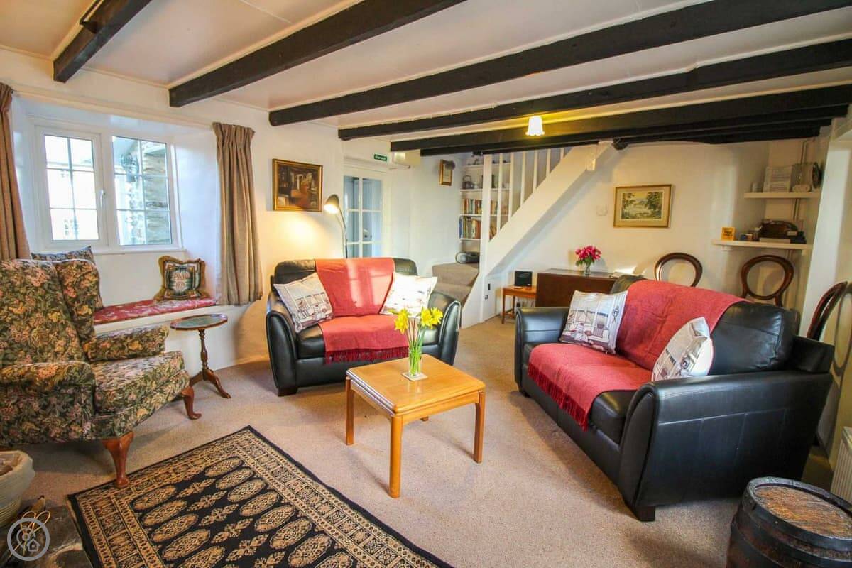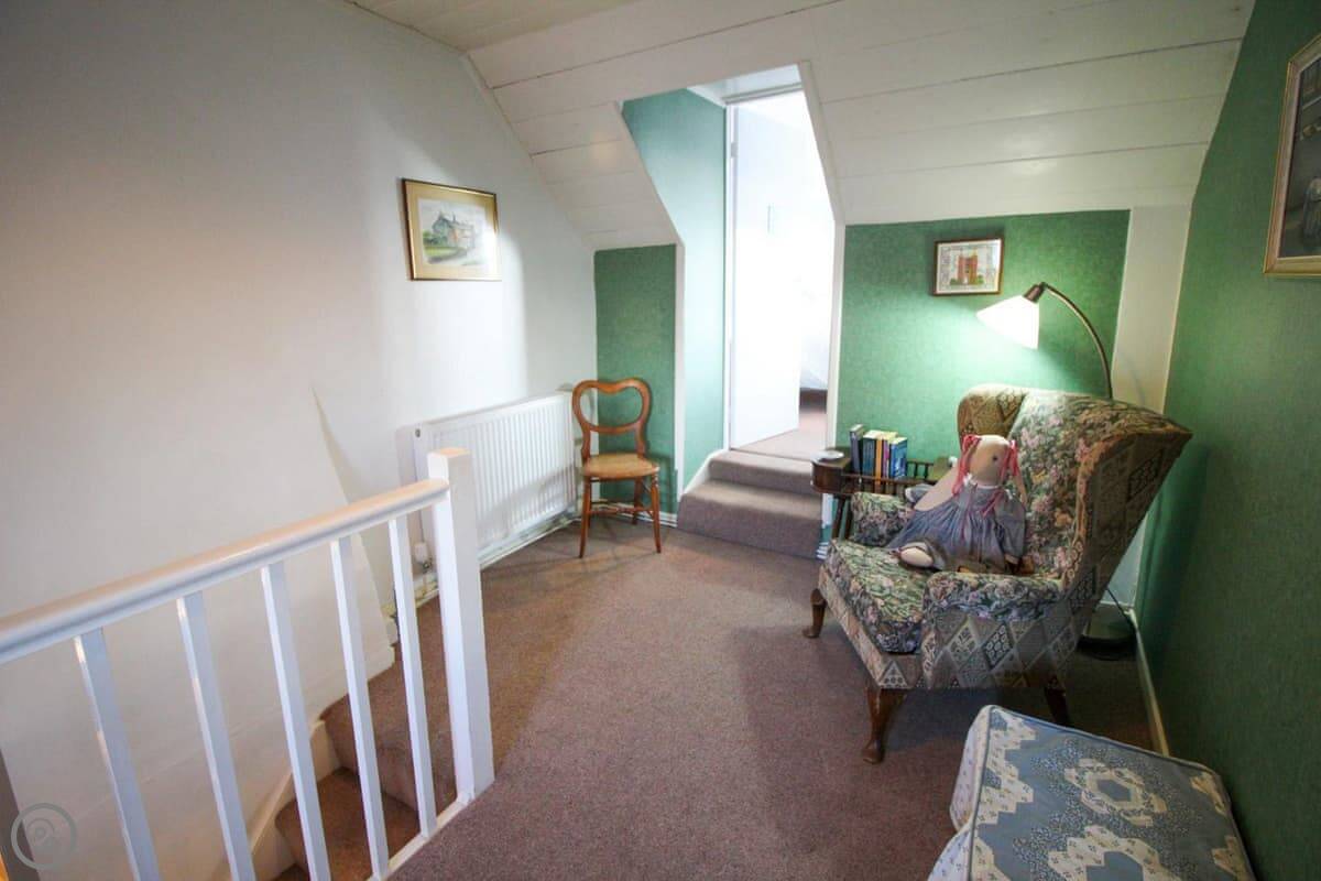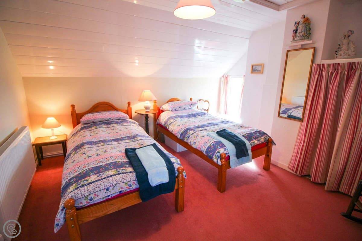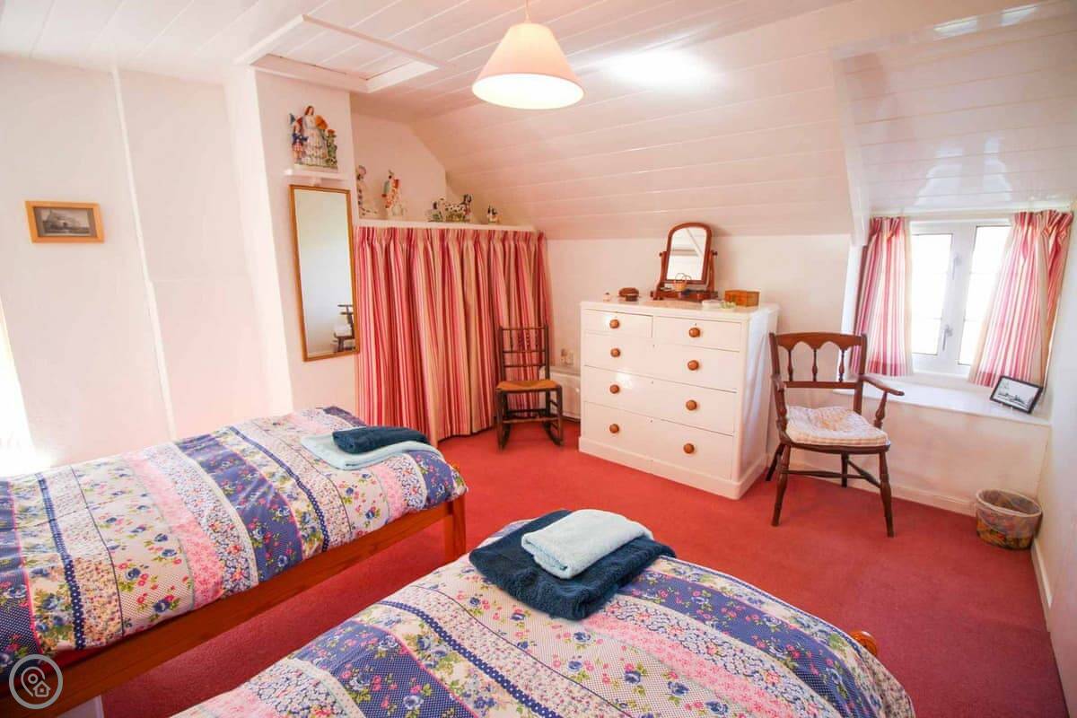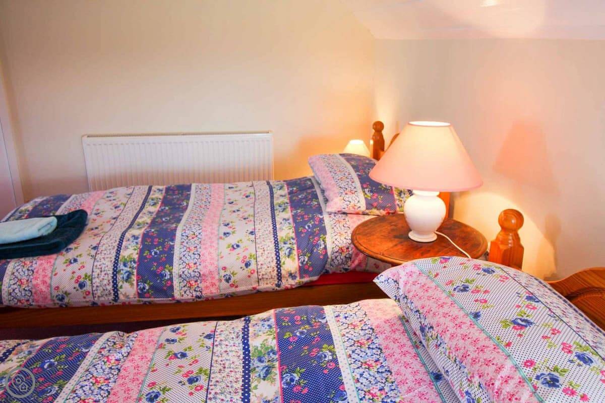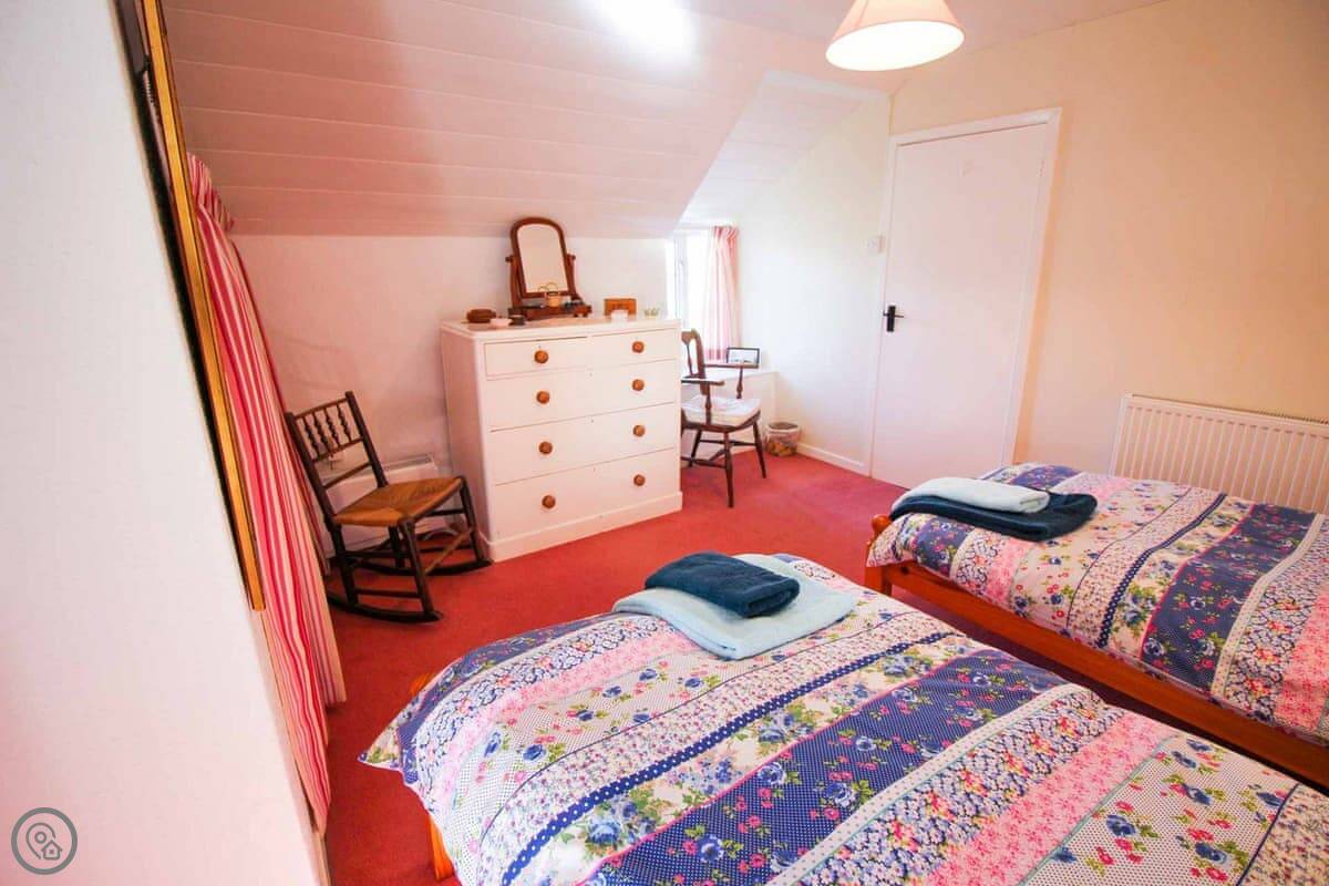 It sleeps four. There are two bedrooms upstairs, one double and one twin. The double room has a wash basin. There's one bathroom, which is downstairs. The decor is traditional. There are some beams. It's a 4 Star place, so it's comfortable and well looked after.