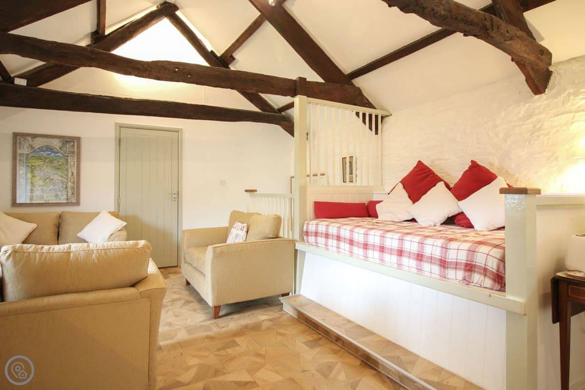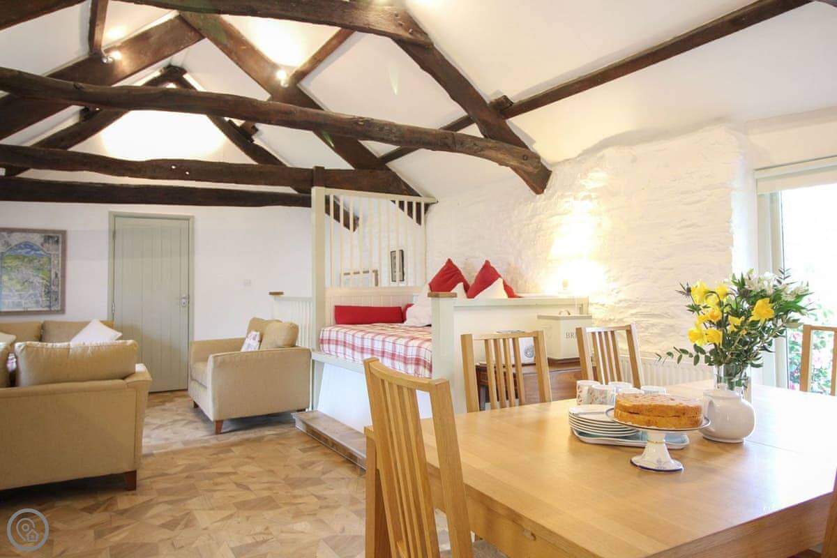 Situated at the end of the row of cottages, the entrance to Tor View is up a flight of wooden steps, as the entrance is on the first floor through a stable door situated on the cottage’s sunny balcony. In the living area there are three small, shuttered windows overlook the Manor’s courtyard. Neighbouring cottage, Lambs Barn at Trevadlock Manor can be ideal for larger parties as it has a co-joining door with Tor View so that the two are interlinked upstairs and the shared space can then sleep up to ten. The Granary at Trevadlock Manor offers an open plan living space with exposed beams and painted stone walling provides a huge amount of atmosphere. The living area is spacious and comfortable and there are French doors open onto Juliette balcony. The Forge at Trevadlock Manor is second in the row and offers two bedrooms, one double and one twin. and the open plan living space is spacious and comfortable. The Dairy at Trevadlock Manor is furnished to a high standard and offers two bedrooms, one double and one twin. The West Wing at Trevadlock Manor offers a step into history. From the ancient front door, a flagstone floored hallway takes you through to the stunning living and dining room with enormous Delabole slates on the floor and a granite lined open fireplace. There are historic features all around this beautiful section of the house, and upstairs there are two airy bedrooms with comfortable beds.