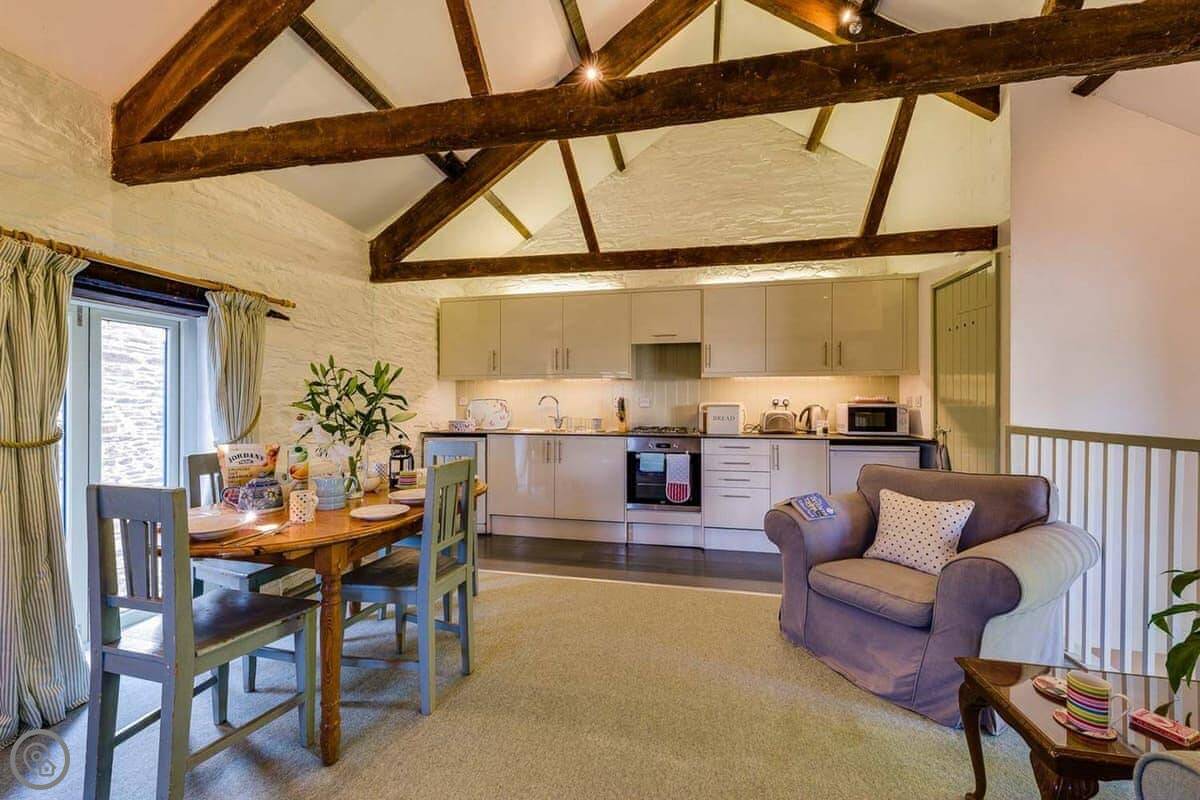 Situated at the end of the row of cottages, the entrance to Tor View is up a flight of wooden steps, as the entrance is on the first floor through a stable door situated on the cottage’s sunny balcony. In the living area there are three small, shuttered windows overlook the Manor’s courtyard. Neighbouring cottage, Lambs Barn at Trevadlock Manor can be ideal for larger parties as it has a co-joining door with Tor View so that the two are interlinked upstairs and the shared space can then sleep up to ten. The Granary at Trevadlock Manor offers an open plan living space with exposed beams and painted stone walling provides a huge amount of atmosphere. The living area is spacious and comfortable and there are French doors open onto Juliette balcony. The Forge at Trevadlock Manor is second in the row and offers two bedrooms, one double and one twin. and the open plan living space is spacious and comfortable. The Dairy at Trevadlock Manor is furnished to a high standard and offers two bedrooms, one double and one twin. The West Wing at Trevadlock Manor offers a step into history. From the ancient front door, a flagstone floored hallway takes you through to the stunning living and dining room with enormous Delabole slates on the floor and a granite lined open fireplace. There are historic features all around this beautiful section of the house, and upstairs there are two airy bedrooms with comfortable beds.