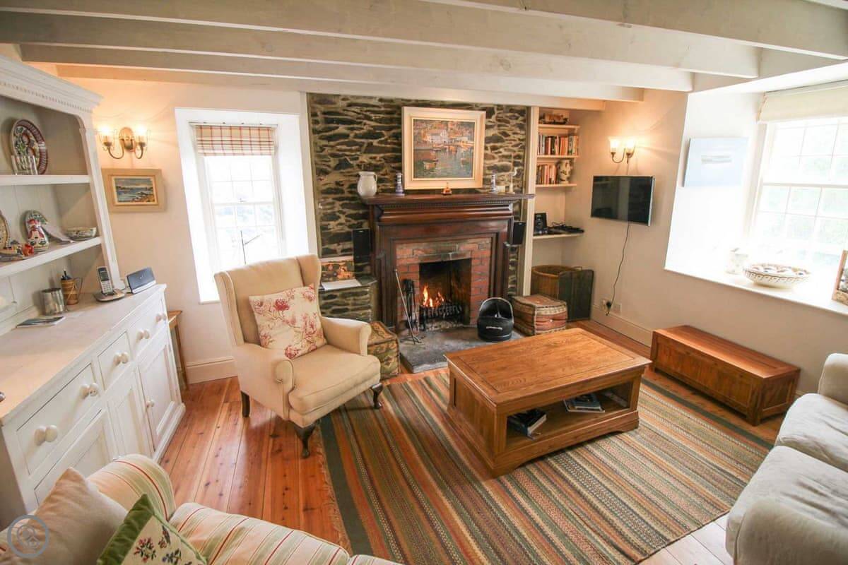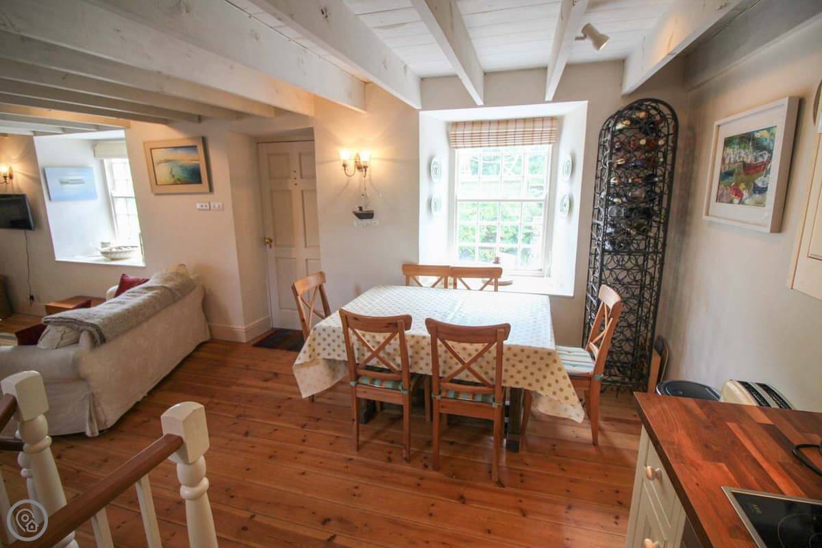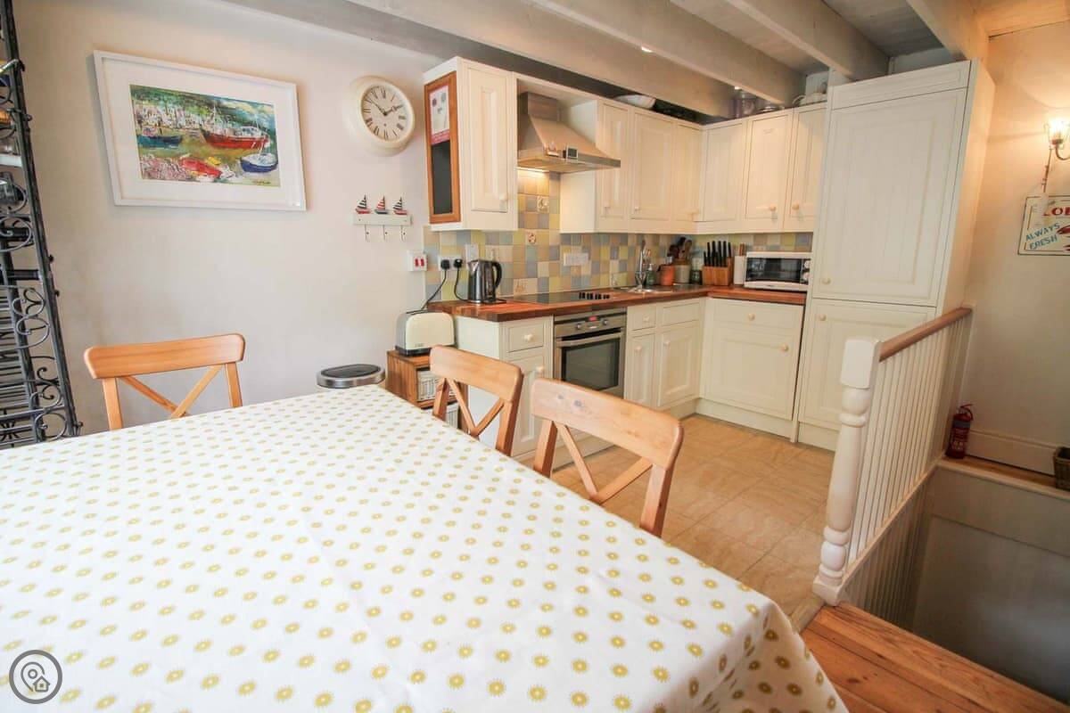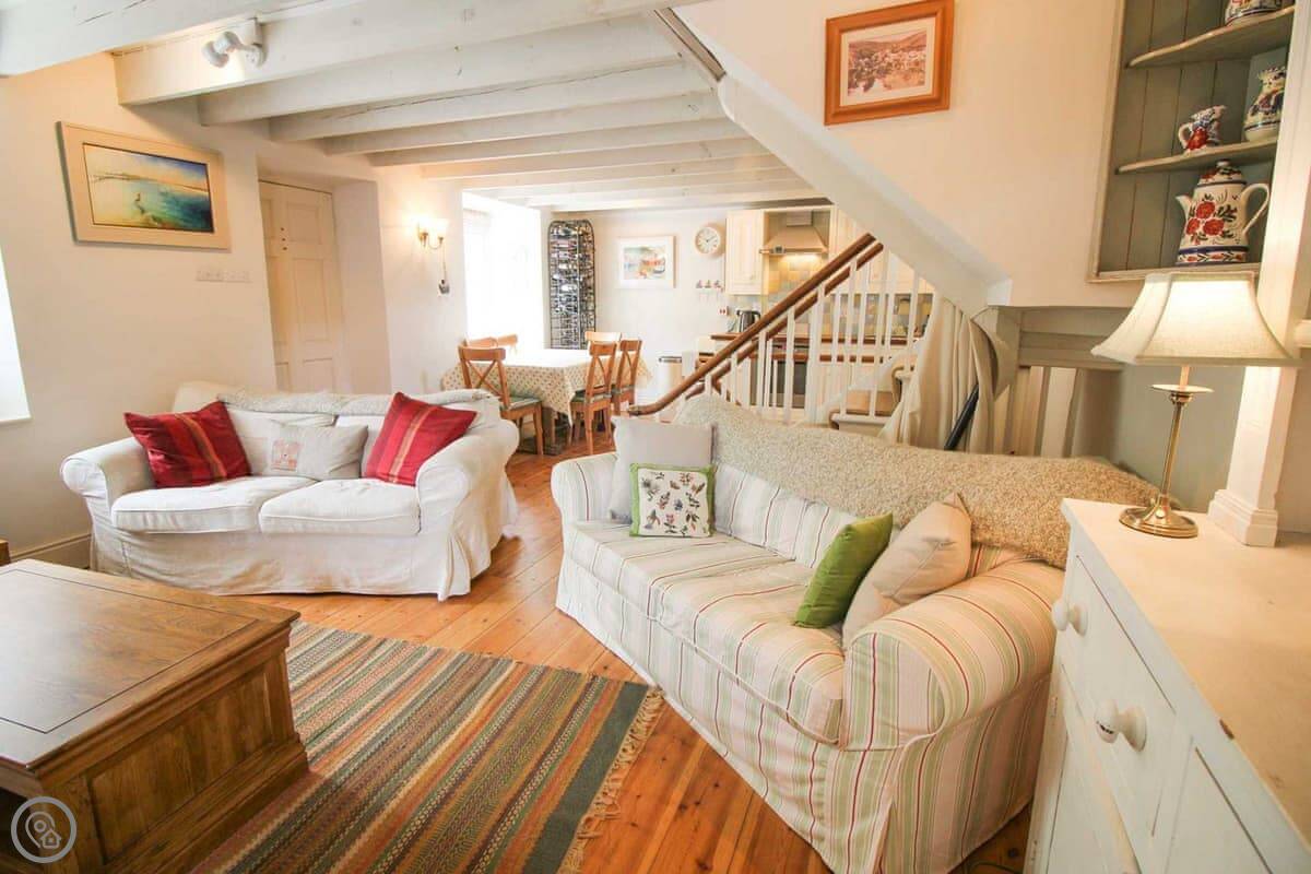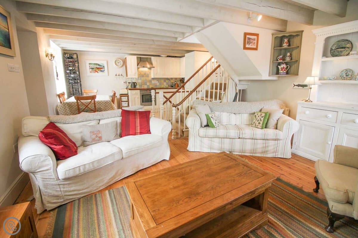 Cove Cottage is brilliantly located a stone’s throw from the harbour and beach right in the heart of the quintessential Cornish fishing village of Portloe. The entrance level is open plan with a spacious living area at one end and kitchen and dining areas at the other. There is an open fire in the living area to keep you warm in the winter and the TV only has on demand TV there is no Freeview. The terrace makes a great suntrap and is surprisingly quiet being this close to the harbour, there is also a raised decked area with amazing views.