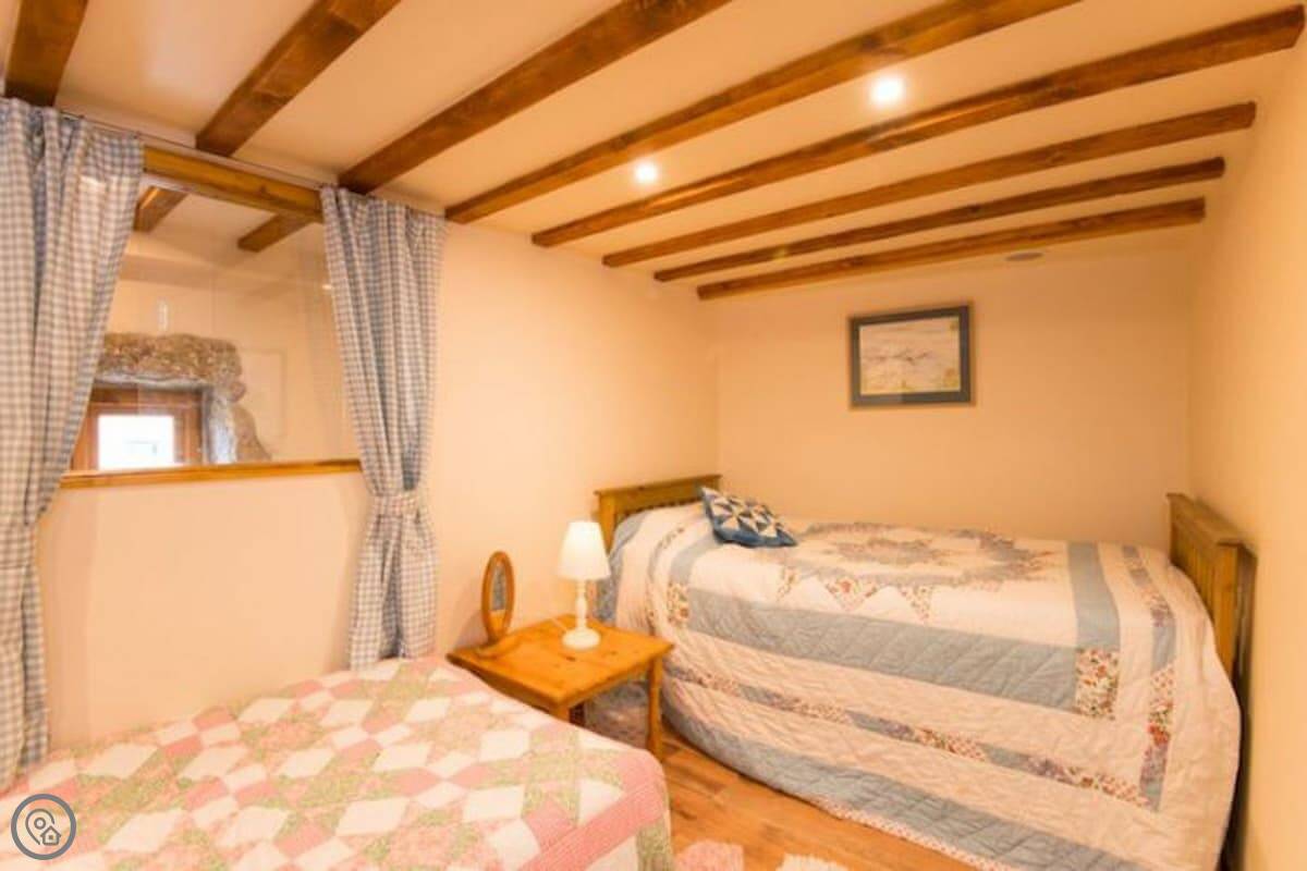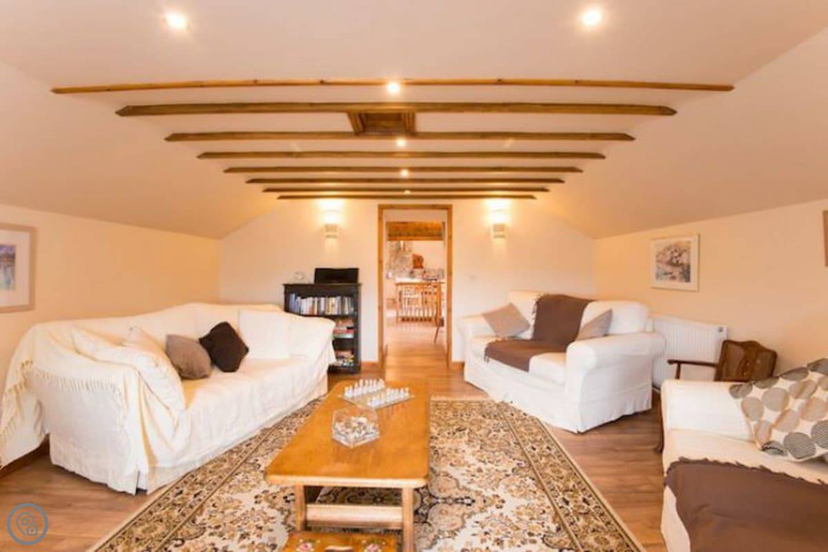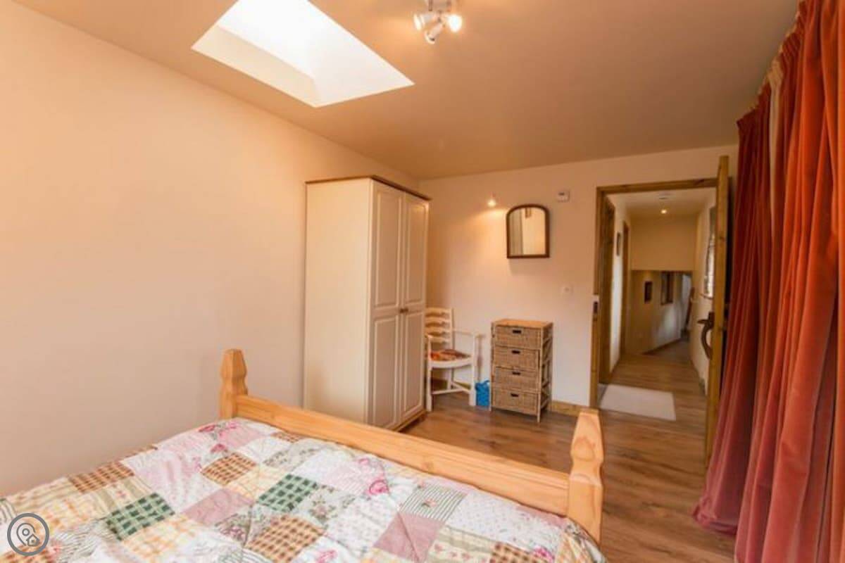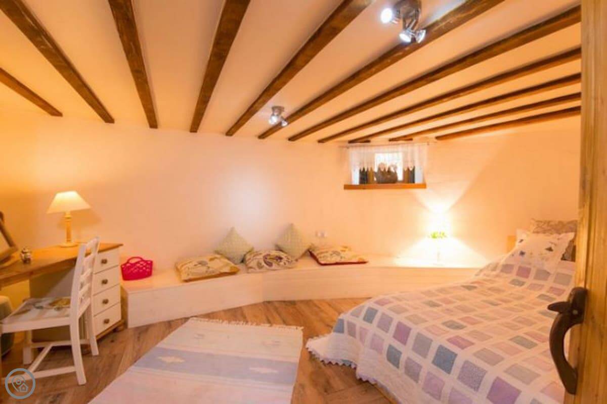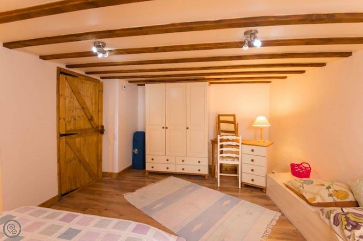 It sleeps six. There are three bedrooms and two bathrooms, which is handy with that many people. It's got a 4 Star rating. The master bedroom and the main living room are partly round, which is unusual. There are some low beams and odd corners, which you'd expect. It feels like a barn, not a normal house.