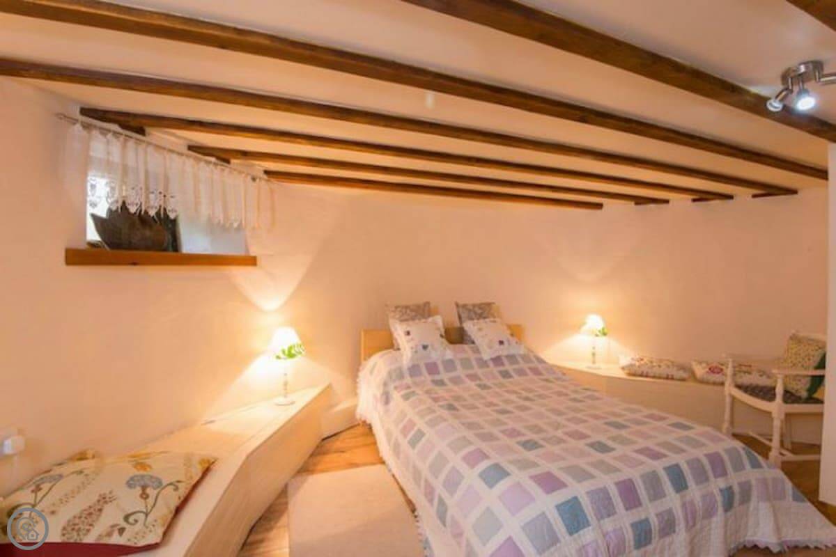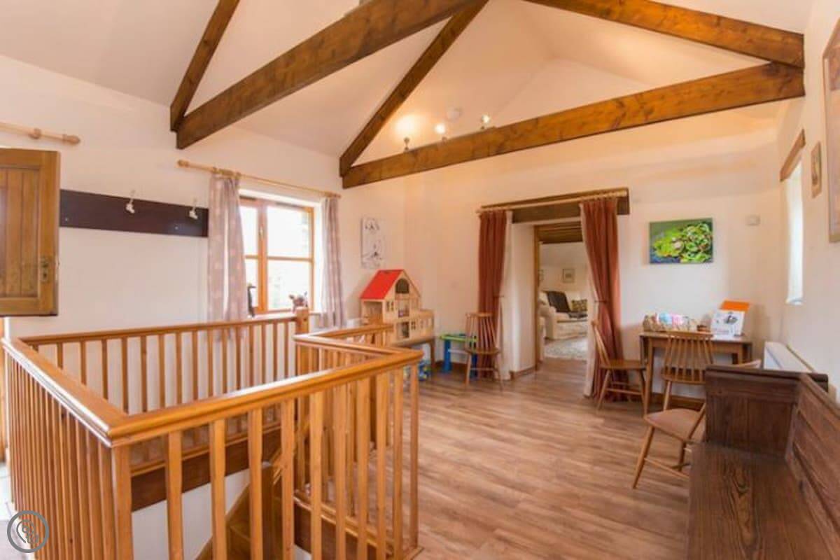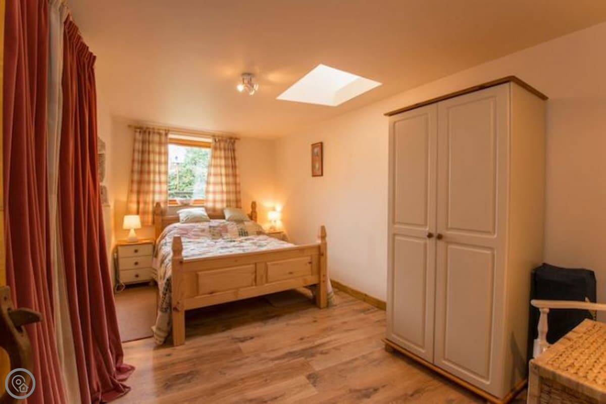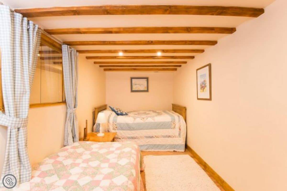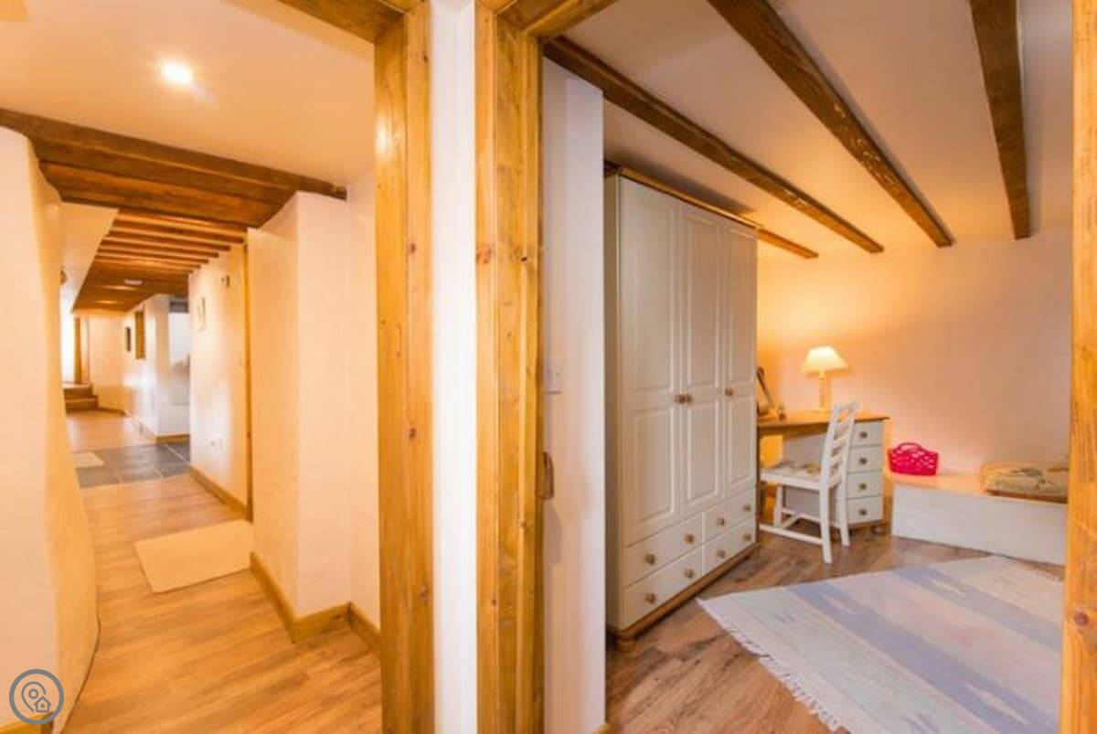 It sleeps six. There are three bedrooms and two bathrooms, which is handy with that many people. It's got a 4 Star rating. The master bedroom and the main living room are partly round, which is unusual. There are some low beams and odd corners, which you'd expect. It feels like a barn, not a normal house.