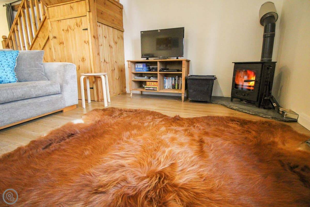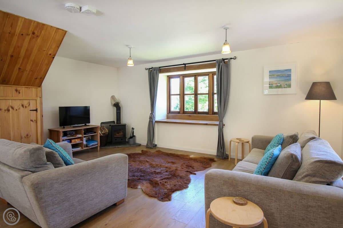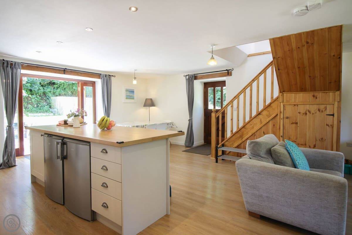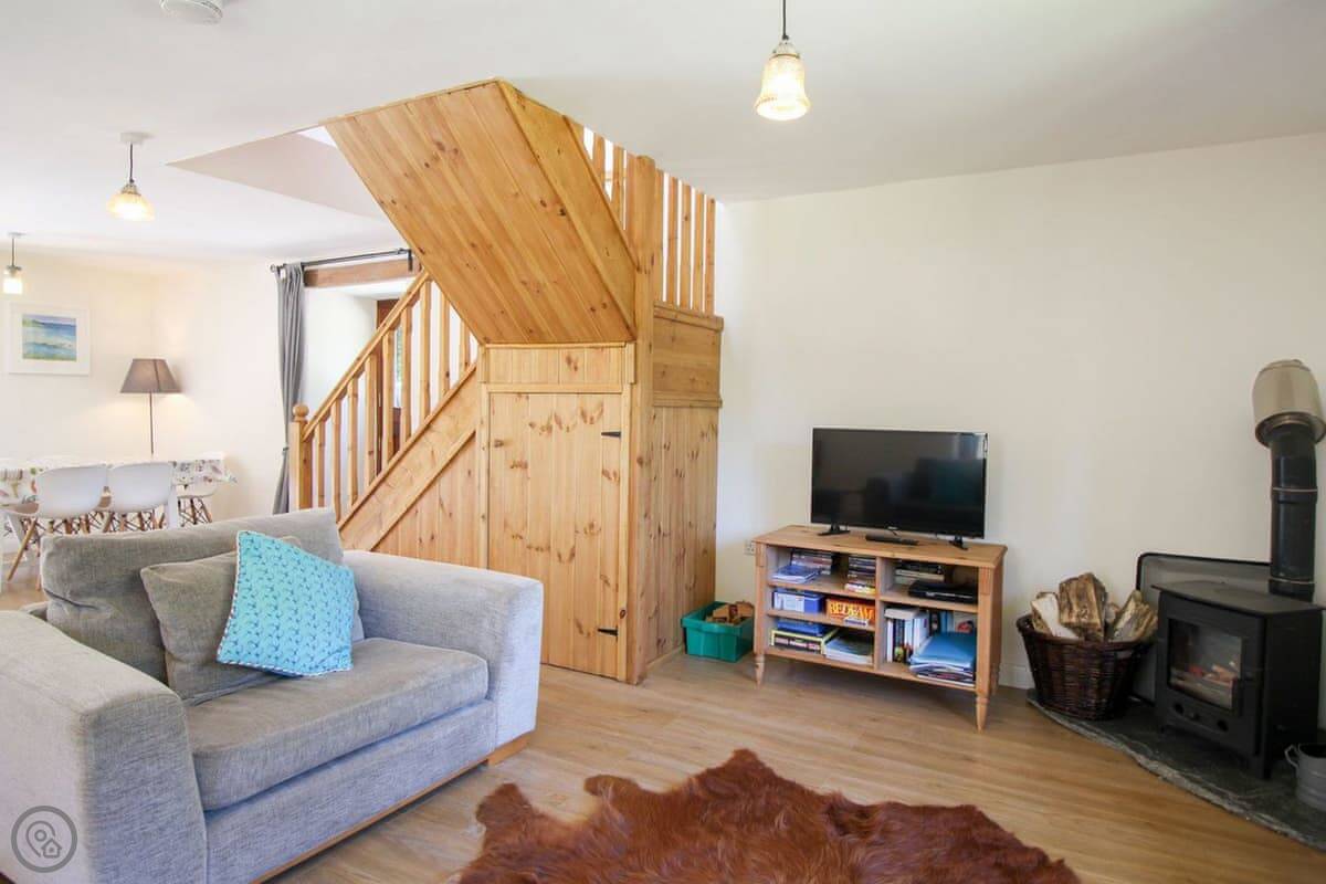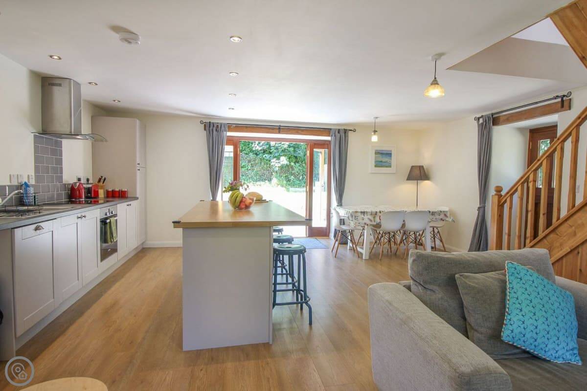 Downstairs is all open plan, with French doors out to the garden. There's a wood burner for cooler evenings. The garden is enclosed, which is good if you're bringing dogs. We allow up to two.