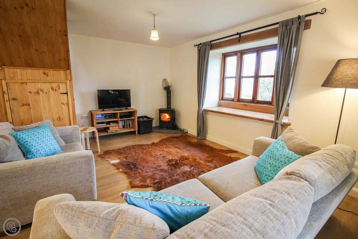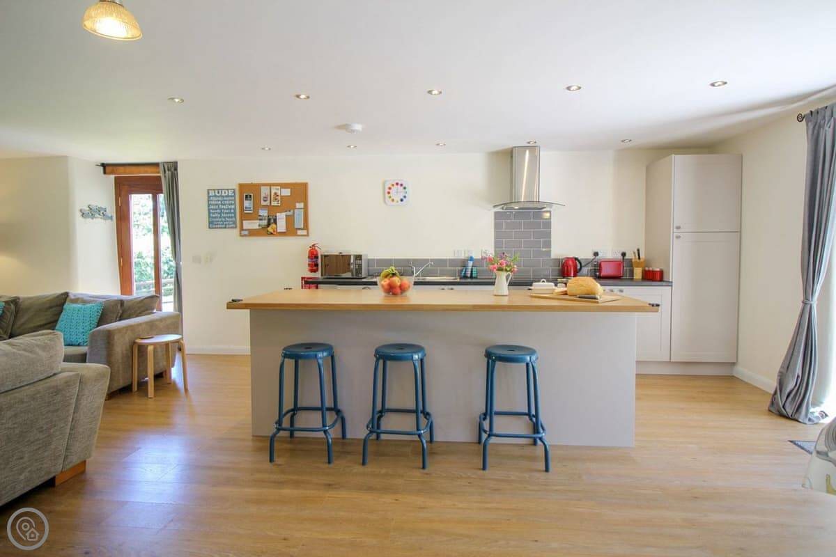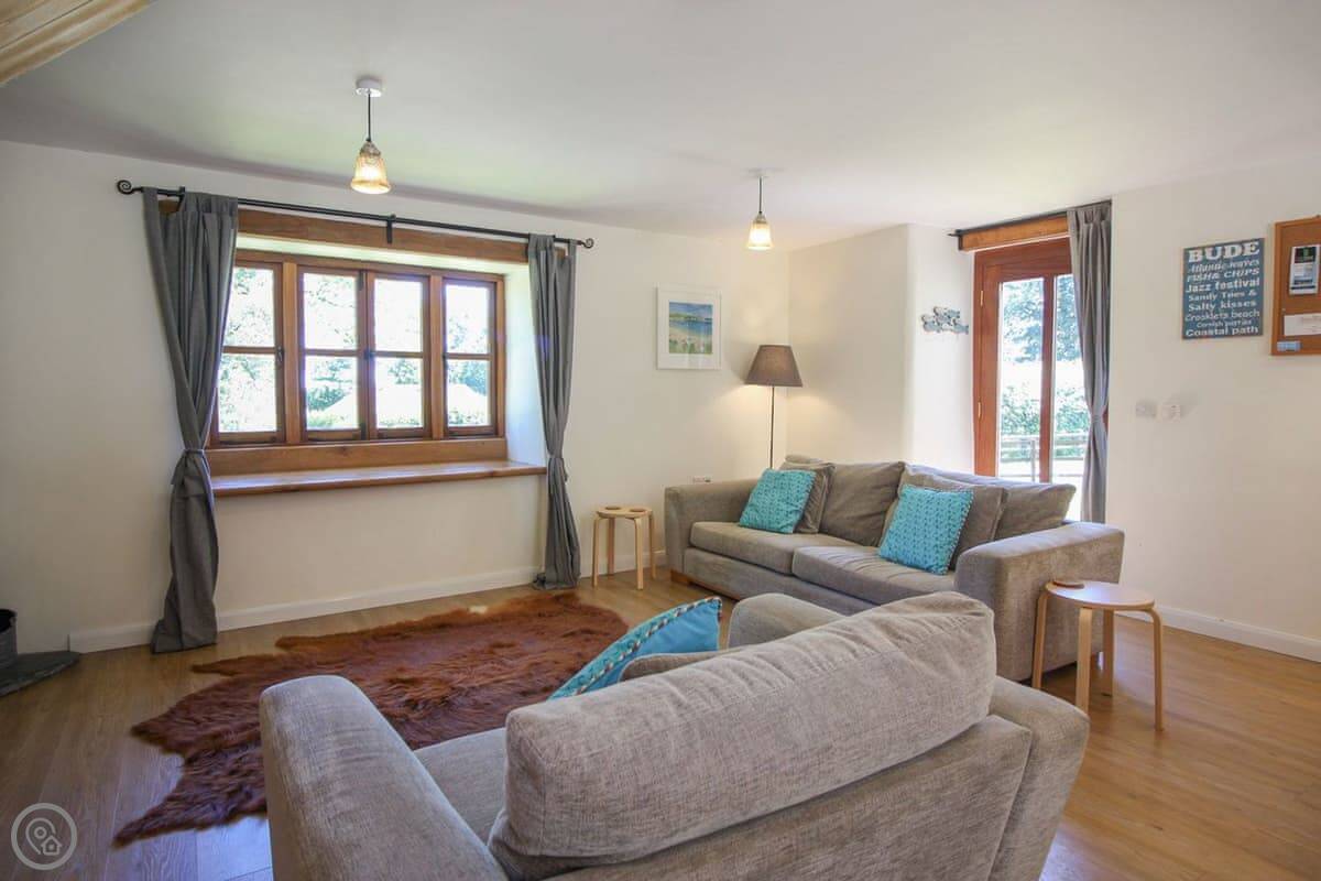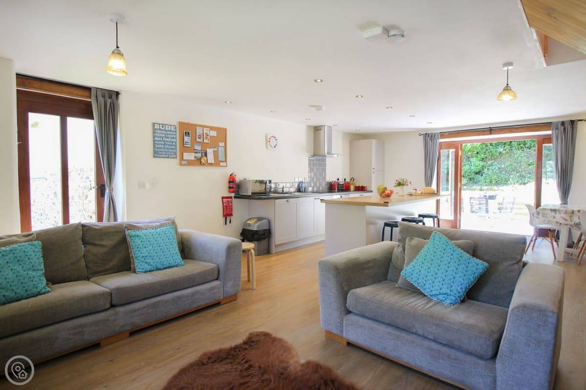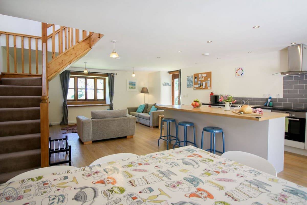 Downstairs is all open plan, with French doors out to the garden. There's a wood burner for cooler evenings. The garden is enclosed, which is good if you're bringing dogs. We allow up to two.