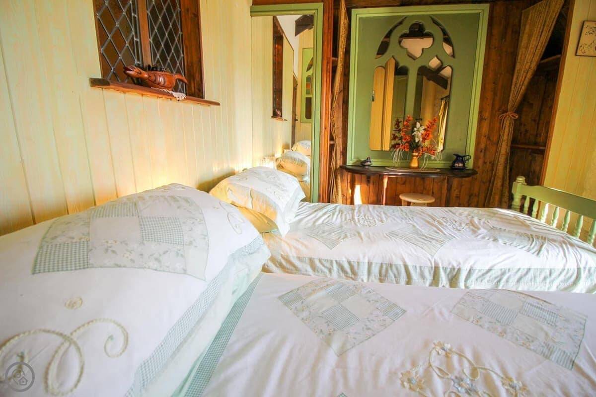 It sleeps five. Three bedrooms and two bathrooms, which is handy. It's a 3 Star place. It's comfortable and homely, not a show home. There's a wood burner in the living room for cooler evenings.