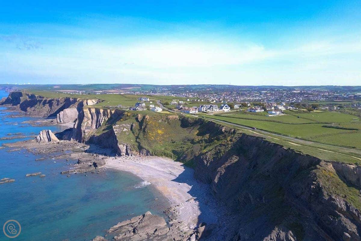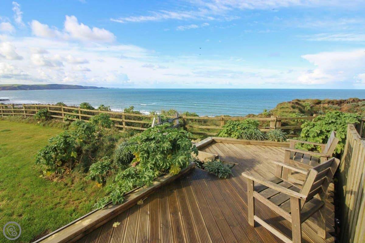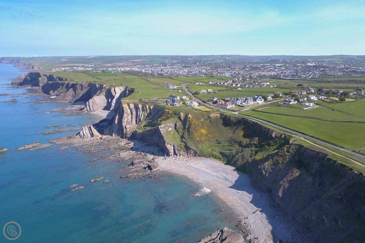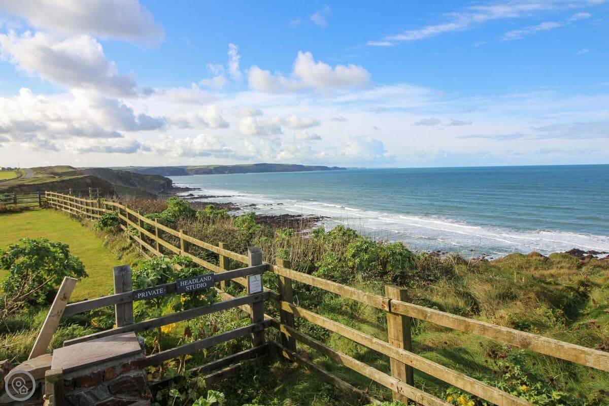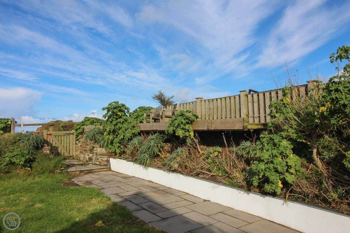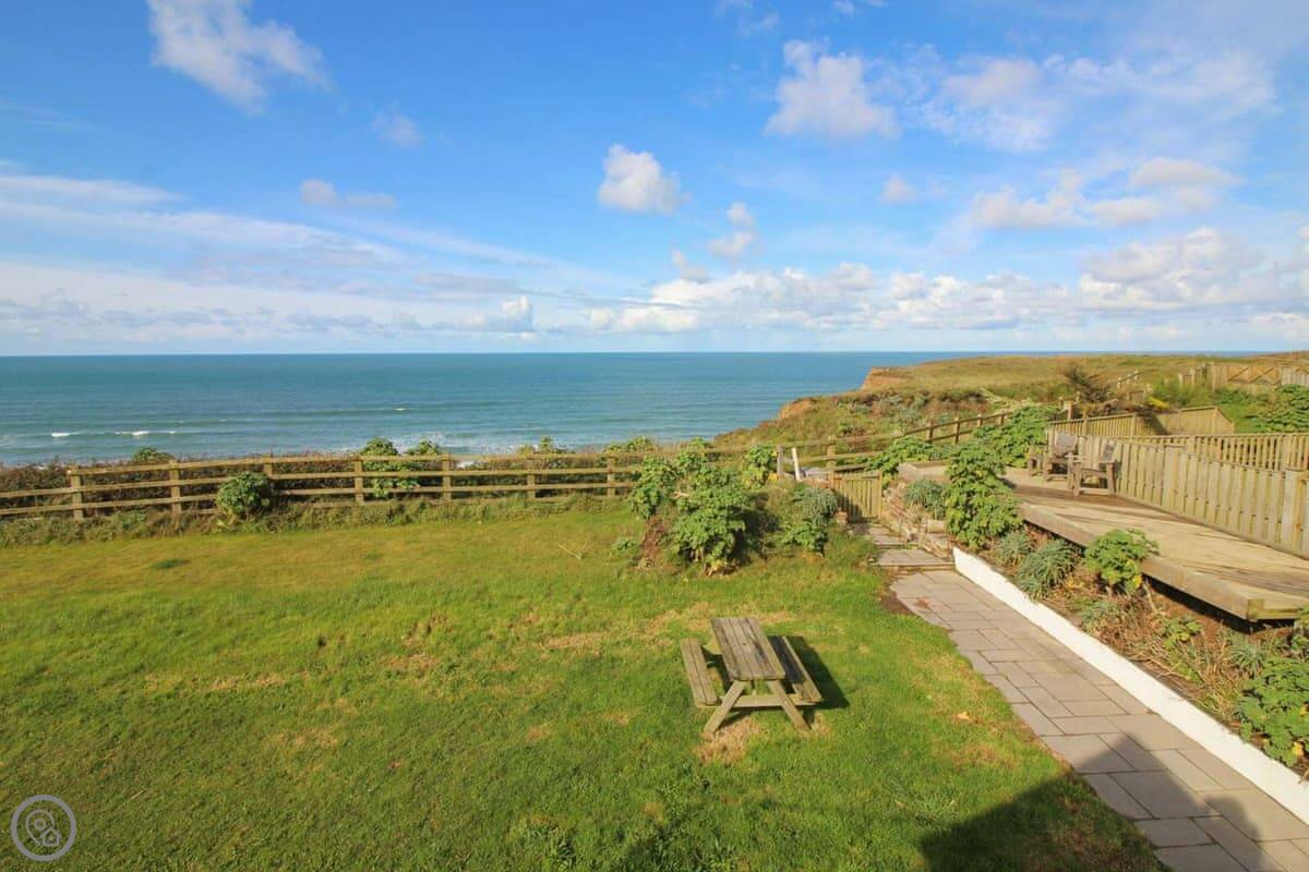 You've got your own bit of garden. There's a gate from it that leads straight onto the coastal footpath. You can walk down a cliff path to Upton beach from there. It's a shingle beach with rock pools. When the tide's out, there's some sand. It's not a lifeguarded beach, but people surf there. For safer swimming, Widemouth Bay or Summerleaze in Bude are both close. They're sandy.