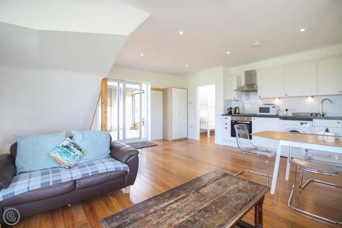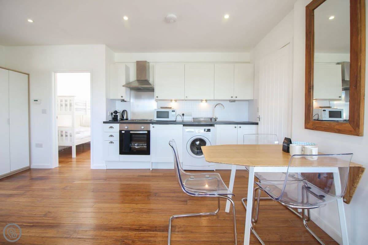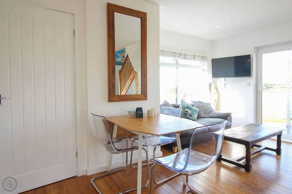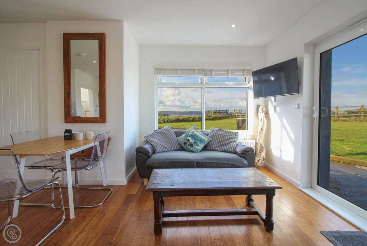 Inside, it's open plan. There's a kitchen area, a dining table, and the sitting area. It has WiFi, a TV, a washing machine. Bedding and towels are included. There's parking. We can provide a cot and highchair if you need them. You can bring two dogs.