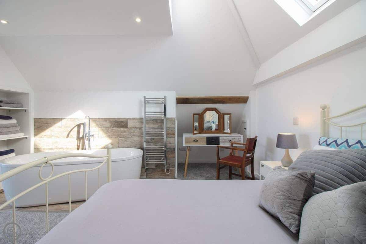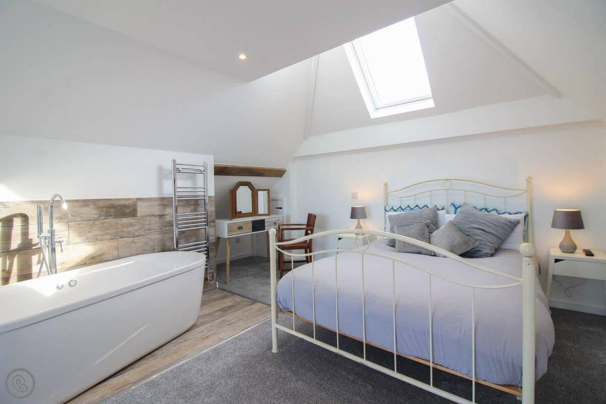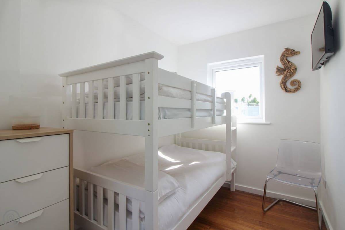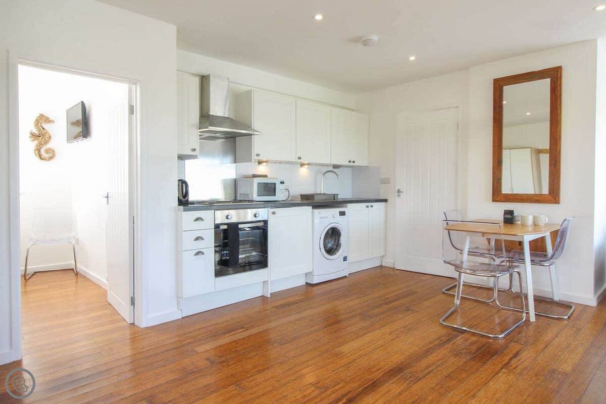 Inside, it's open plan. There's a kitchen area, a dining table, and the sitting area. It has WiFi, a TV, a washing machine. Bedding and towels are included. There's parking. We can provide a cot and highchair if you need them. You can bring two dogs.