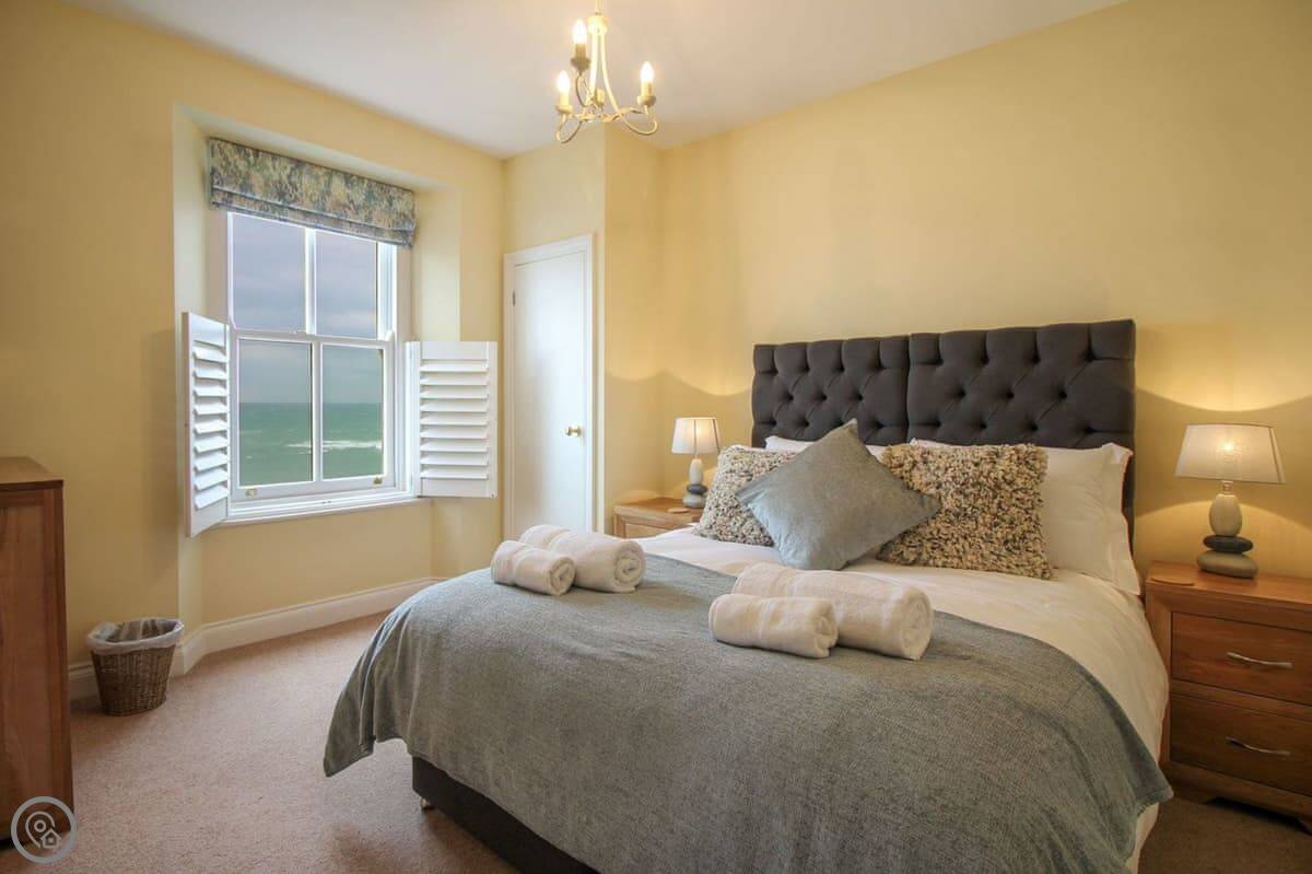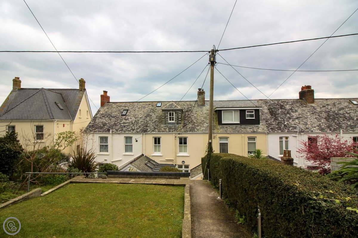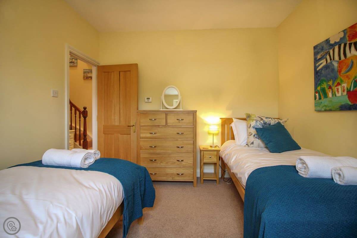 Two of the bedrooms face the front and have views of the sea. The third twin bedroom is at the back. The gardens slope down prettily at the front. There’s a patio that gets the sun.