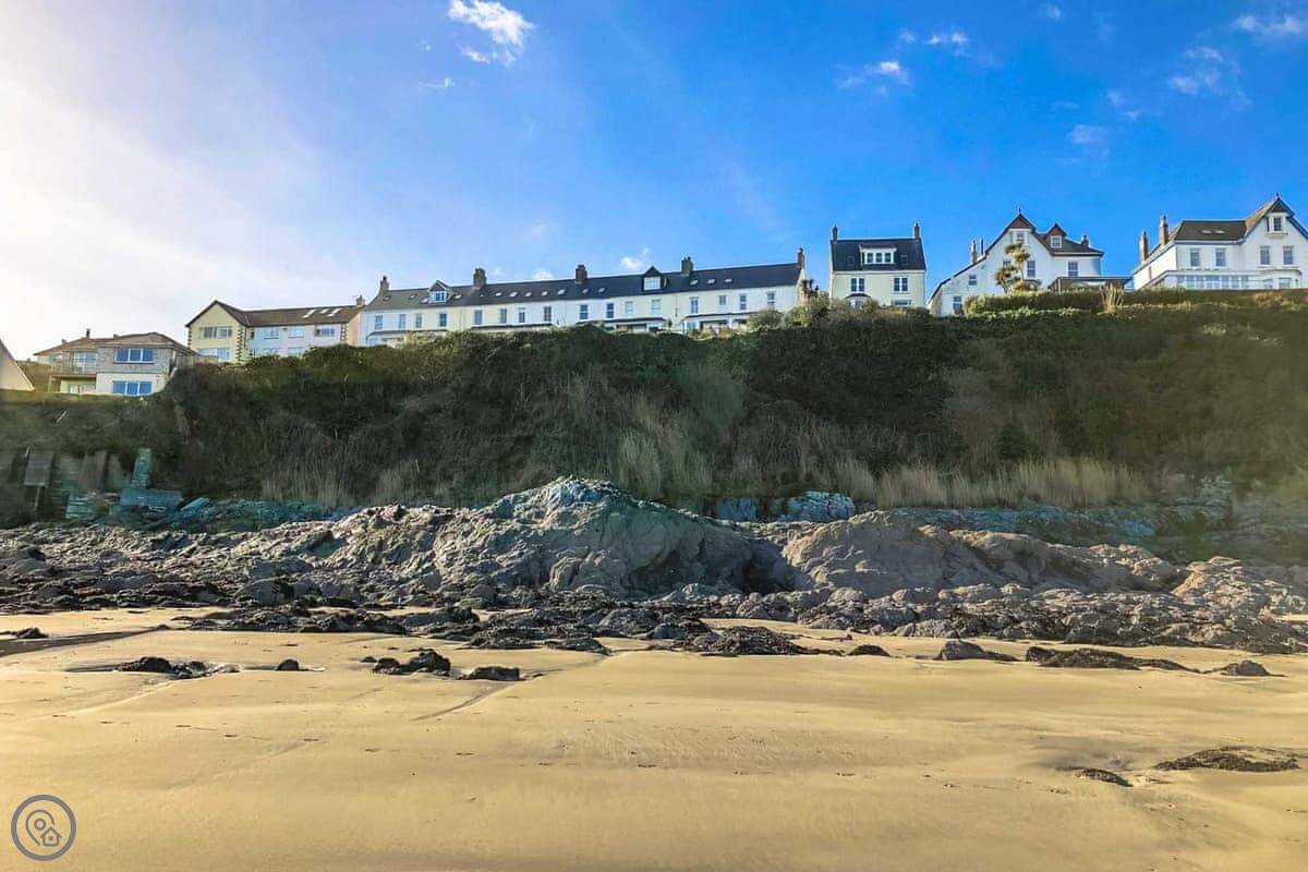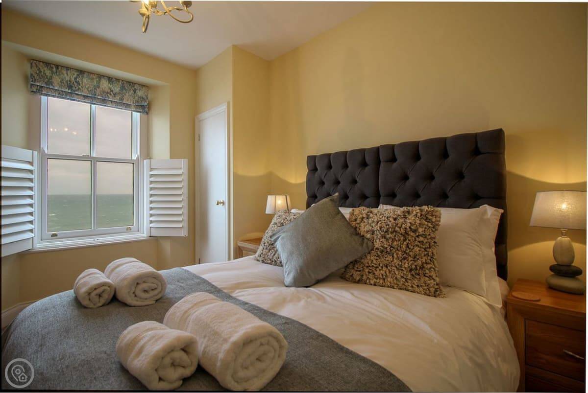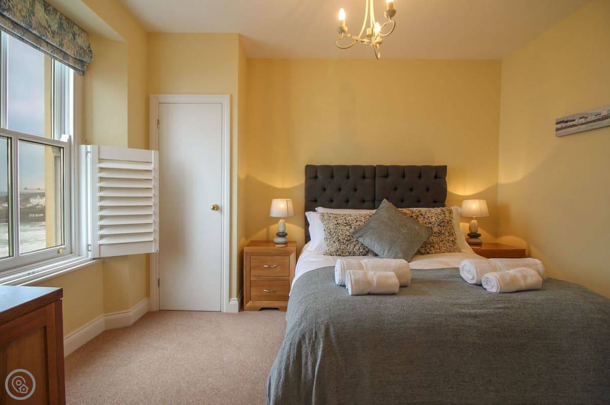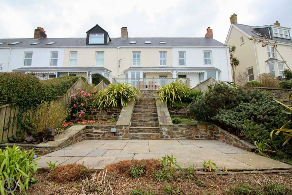Two of the bedrooms face the front and have views of the sea. The third twin bedroom is at the back. The gardens slope down prettily at the front. There’s a patio that gets the sun.