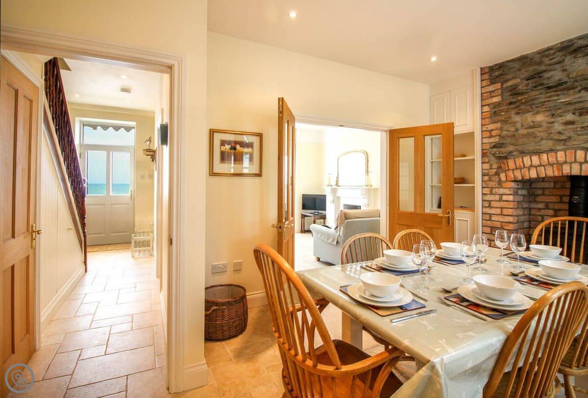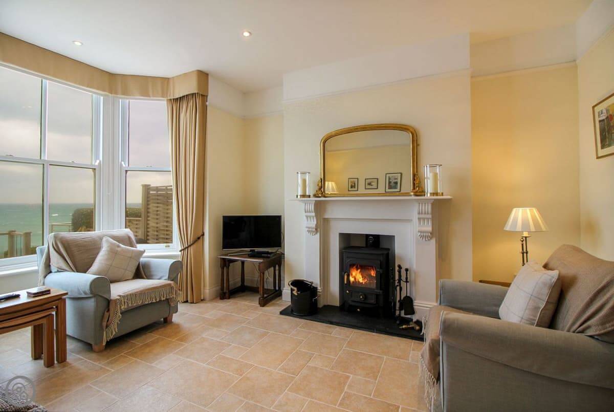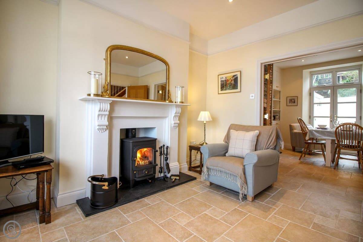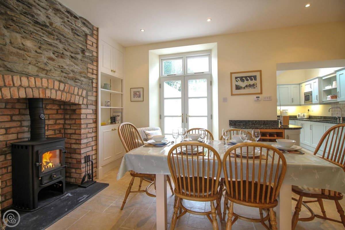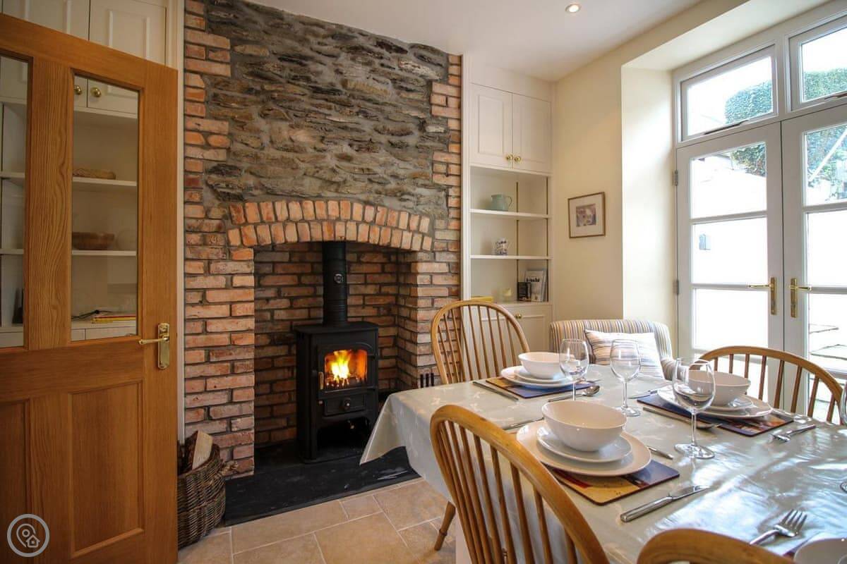 The living room has a wood burning stove and a big bay window for the view. The kitchen diner is separate, with another stove.