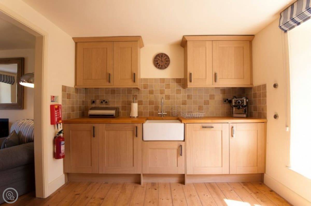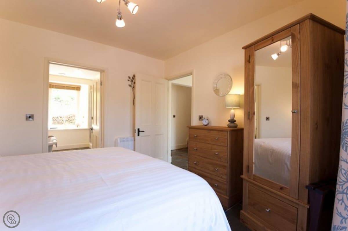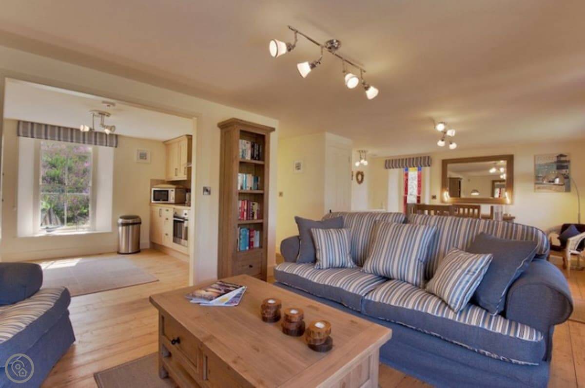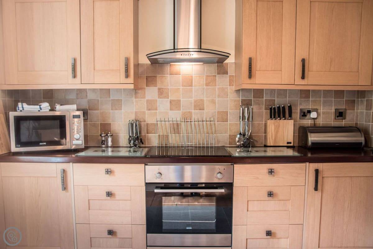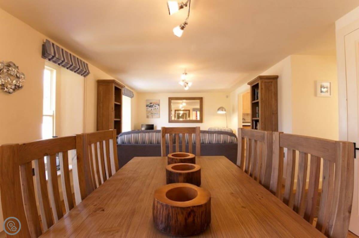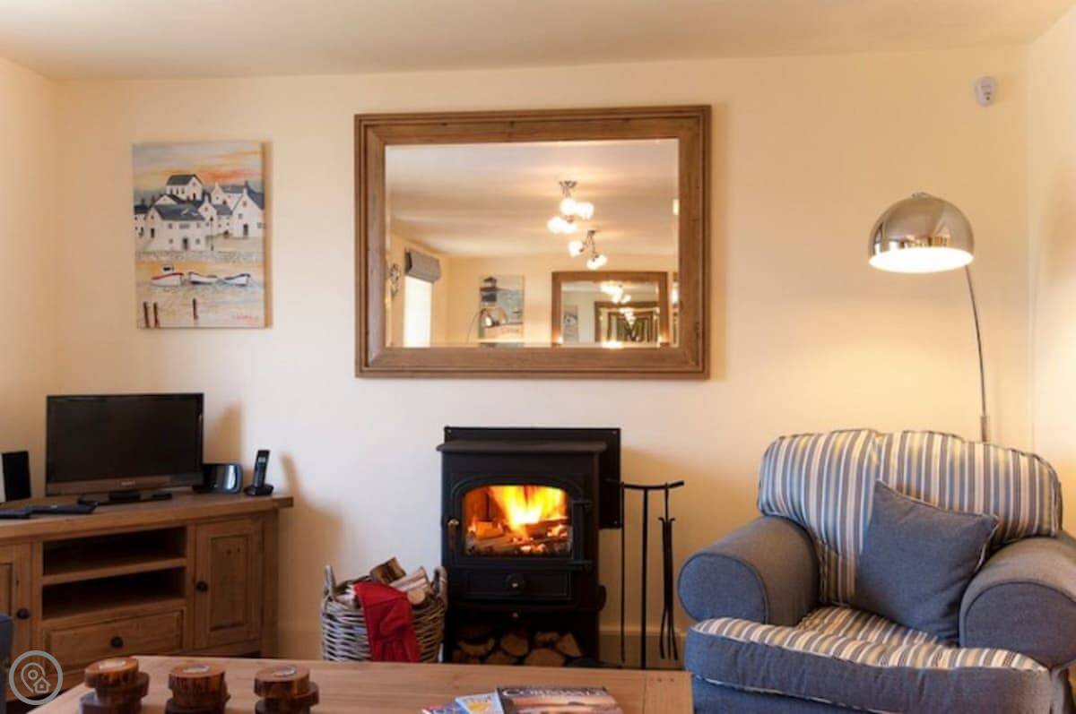 The main living area is open plan. There's a wood burner for cooler evenings. The kitchen has a dishwasher and washing machine. Outside is a patio with a table and a barbecue. The garden is enclosed, which is good if you're bringing dogs. Speaking of, you can bring up to two.