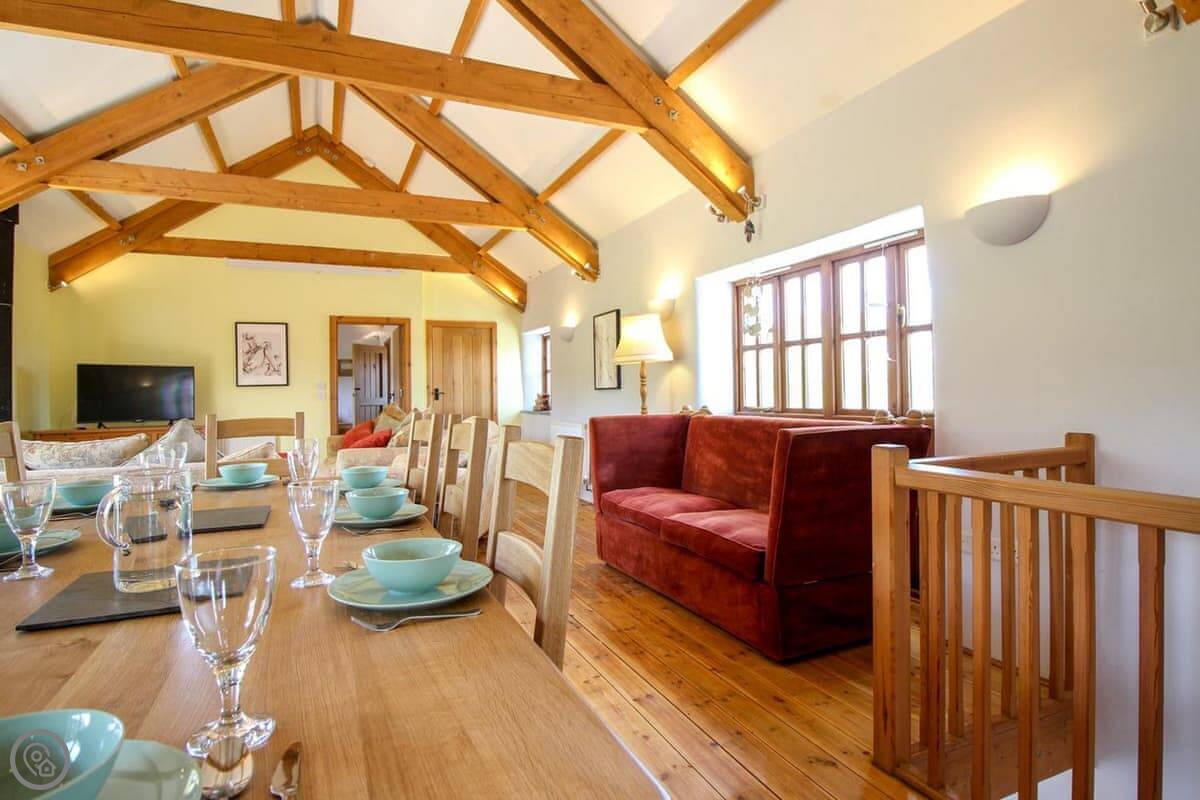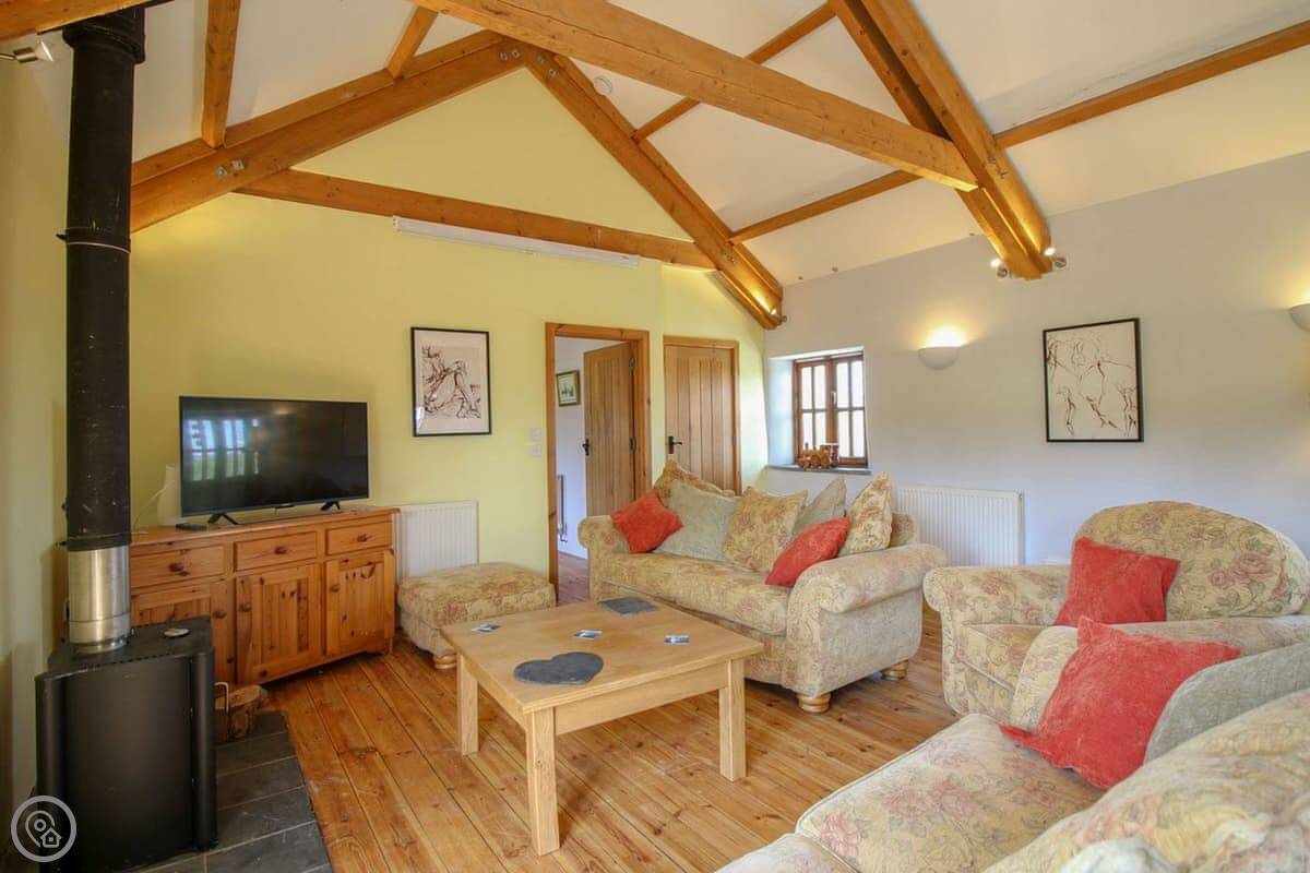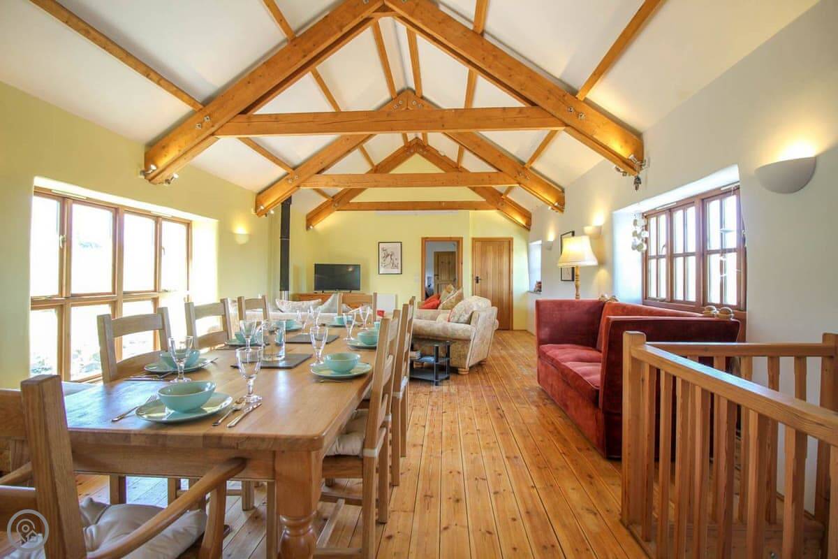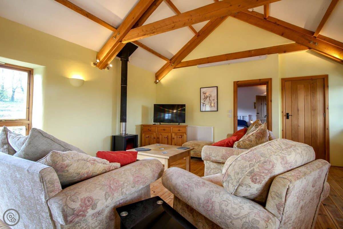 The Leat was completed just a few years ago and this beautiful barn conversion is a spacious and very well presented property. Set out in reverse style, the first floor has a large open plan living room, dining room and kitchen with a lovely high ceiling and exposed beams. The main living area is kept snug and cosy with a wood burning stove and is furnished with two comfortable sofa beds. All the bedrooms are spacious with pine floors. Outside is a very pleasant garden with lawned levels and outside table and chairs. Take a look at our photos or 3D tour to see all around The Leat.