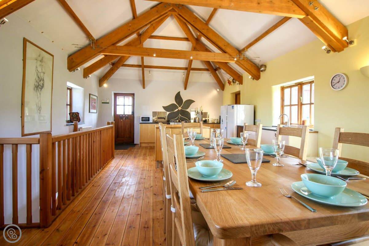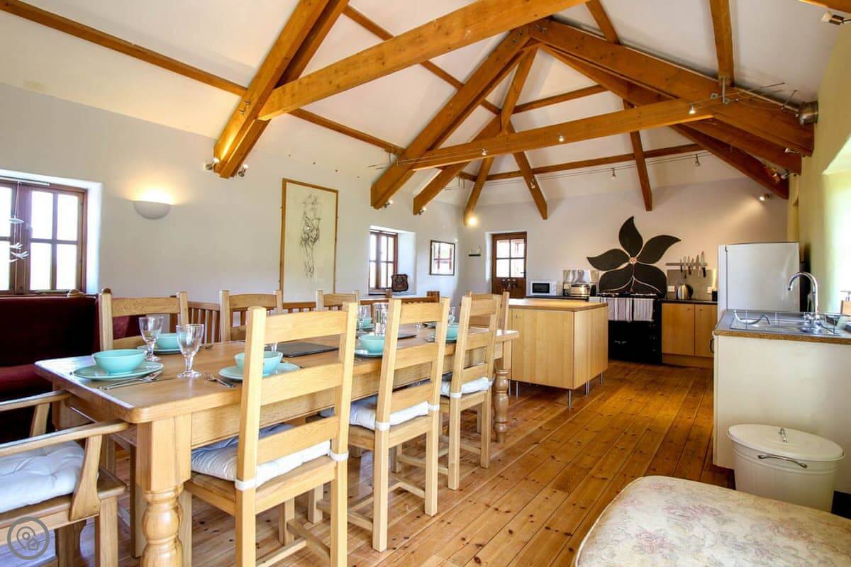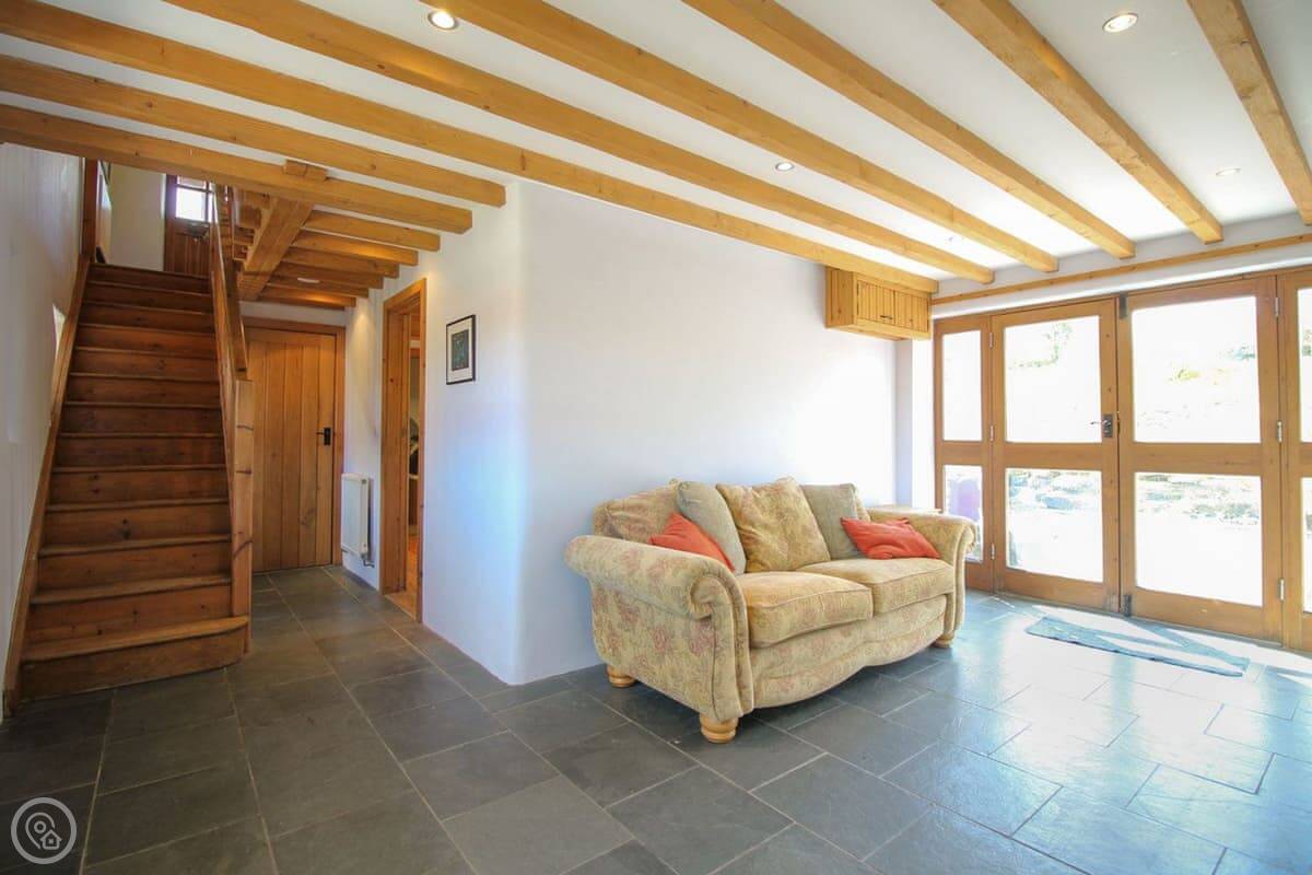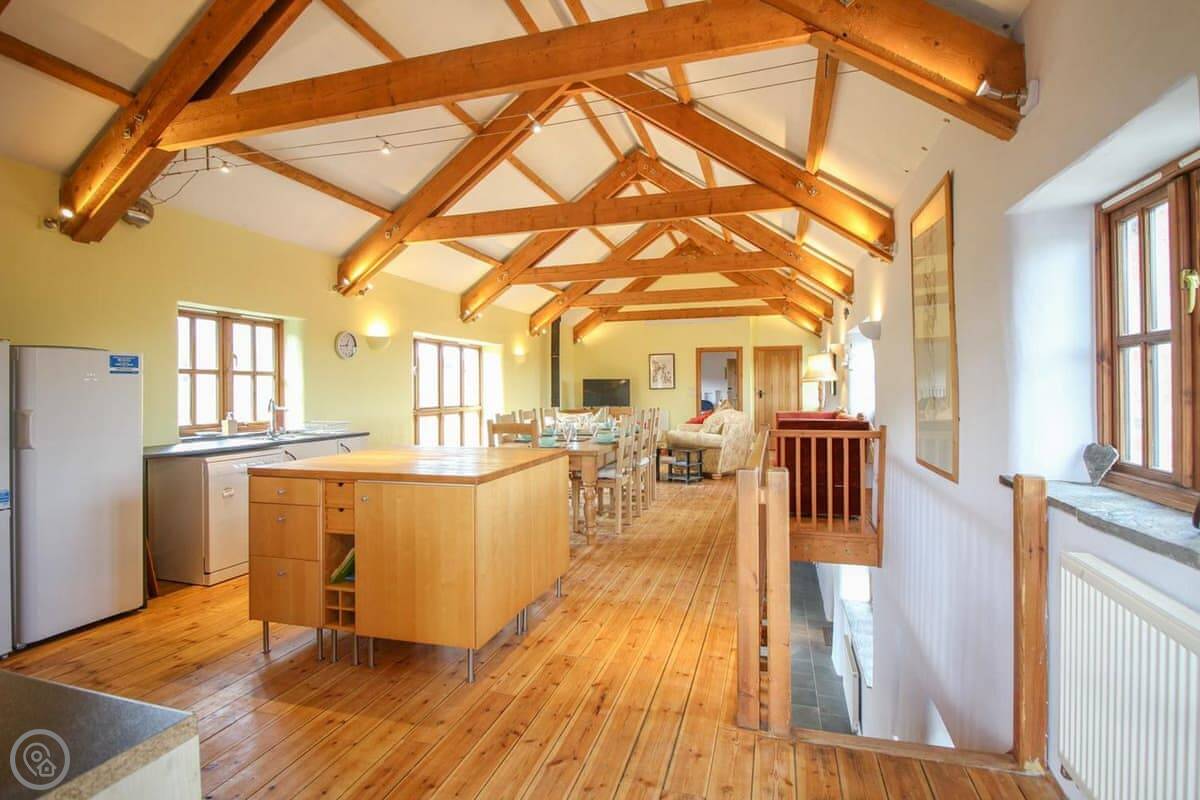 The Leat was completed just a few years ago and this beautiful barn conversion is a spacious and very well presented property. Set out in reverse style, the first floor has a large open plan living room, dining room and kitchen with a lovely high ceiling and exposed beams. The main living area is kept snug and cosy with a wood burning stove and is furnished with two comfortable sofa beds. All the bedrooms are spacious with pine floors. Outside is a very pleasant garden with lawned levels and outside table and chairs. Take a look at our photos or 3D tour to see all around The Leat.