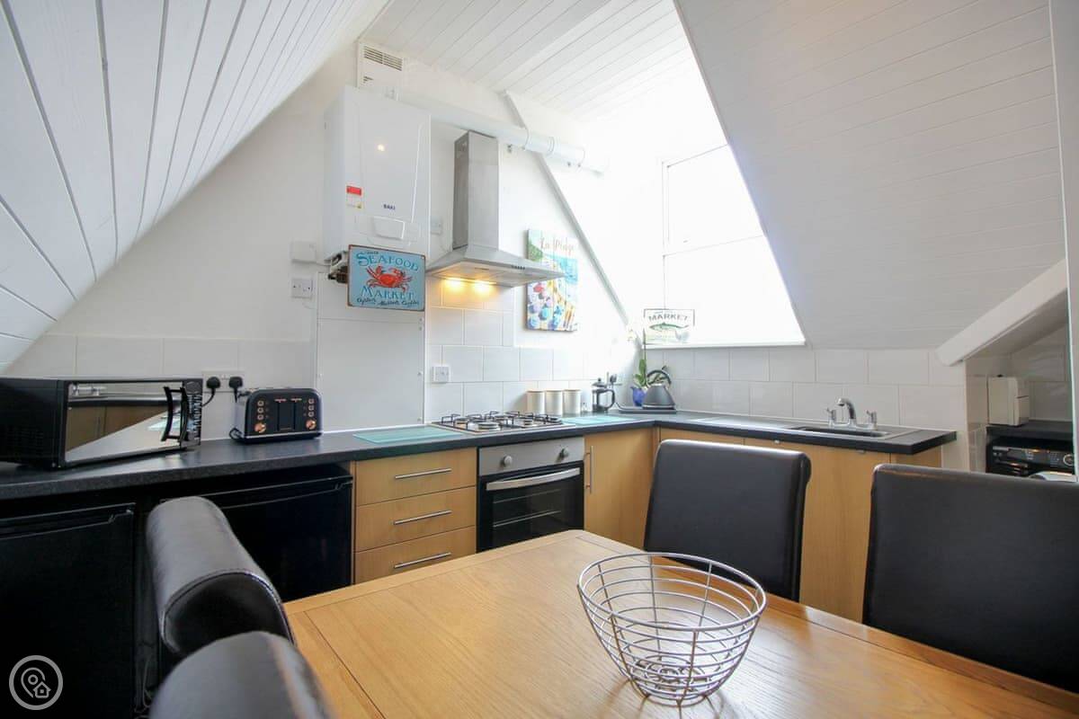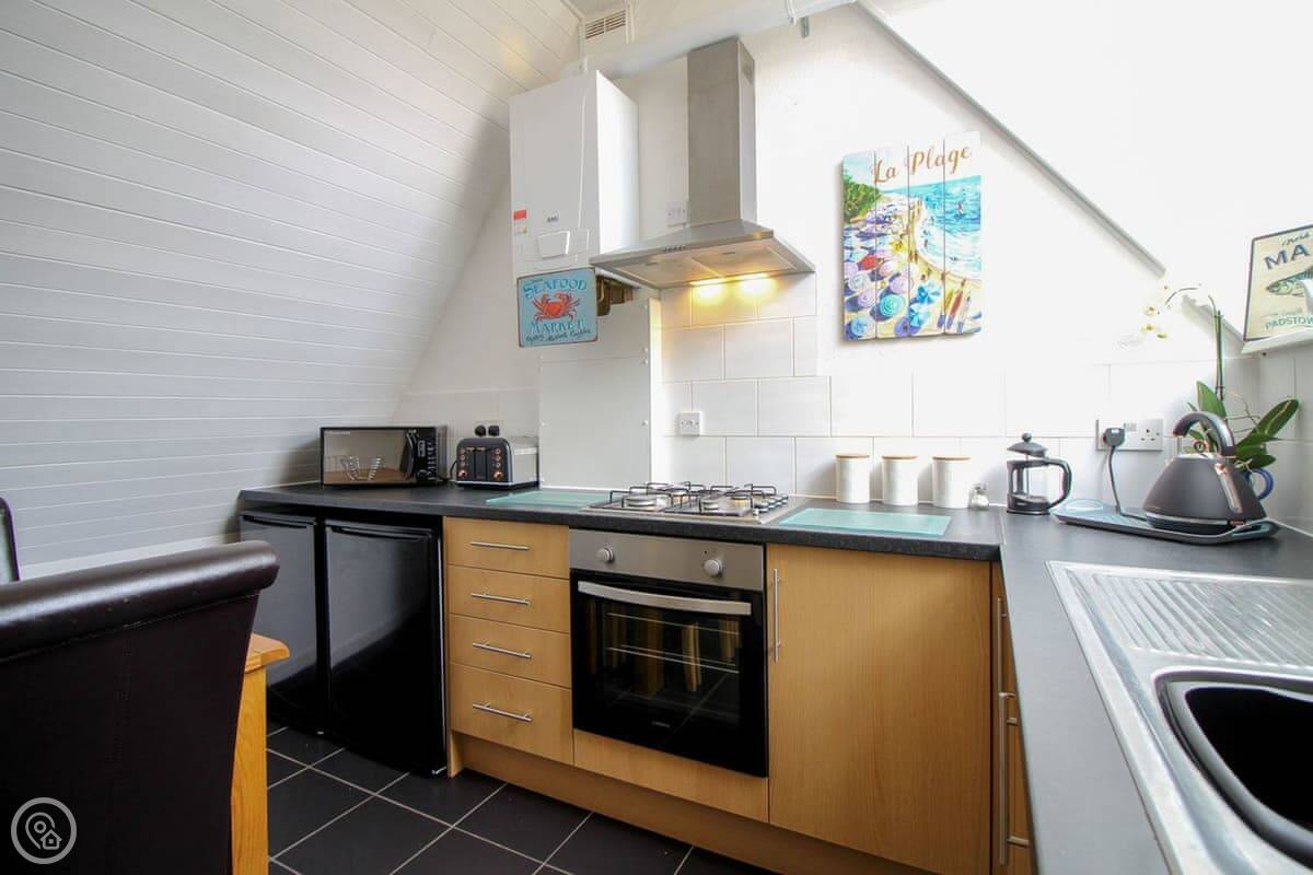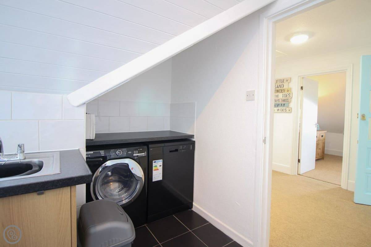 Inside, it's got what you need: WiFi, TV, a washing machine, dishwasher. Bedding and towels are included. There's a cot and highchair if you need them. There's a little patio area outside the apartment.